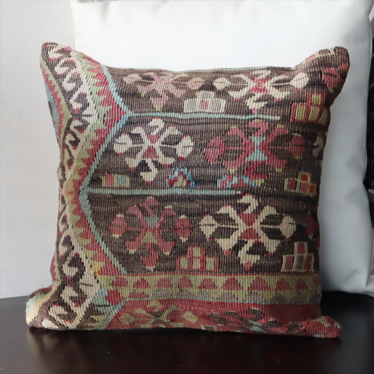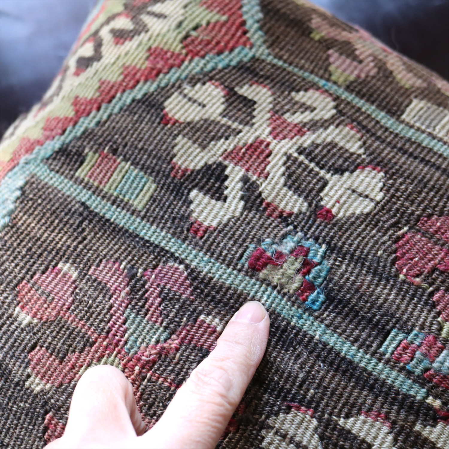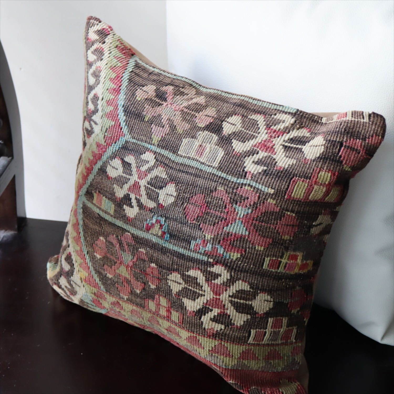 細い糸を使って織られた大型の平織りキリムをカットして作ったクッションカバーです。表面はウールのヴィンテージキリム、裏面は無地のコットン地です。