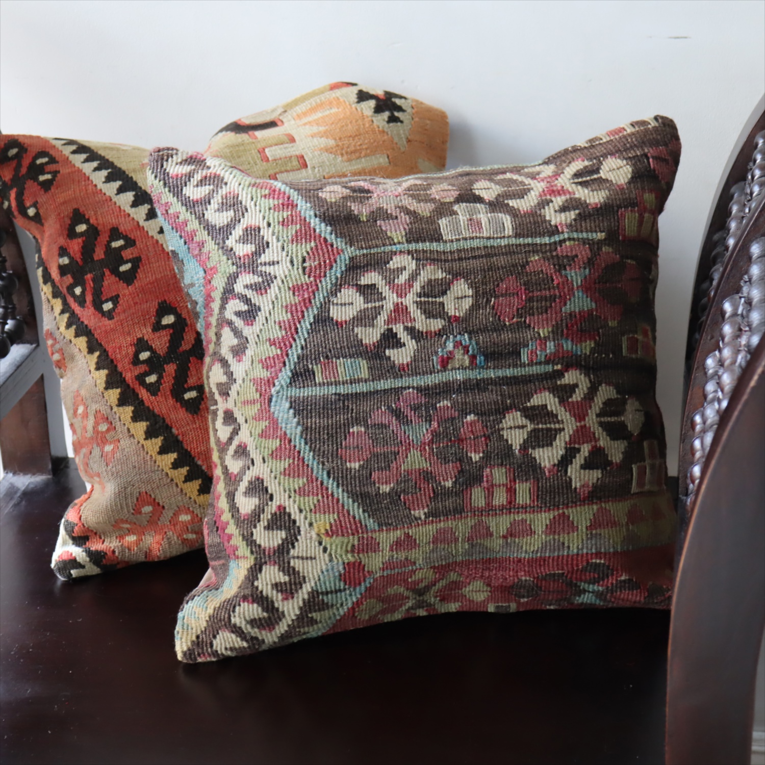 クッションカバーにすると、一枚のキリムから50枚以上に切り分けられるものもあり、配色が似ていてモチーフのバランスが違うクッションができあがります。