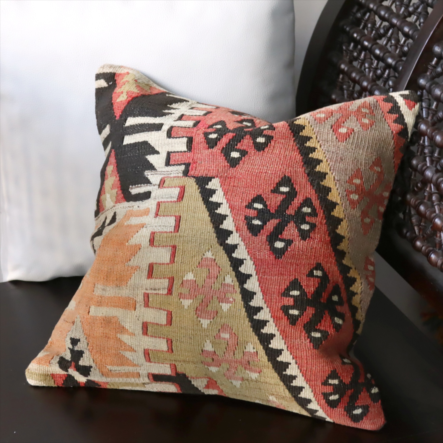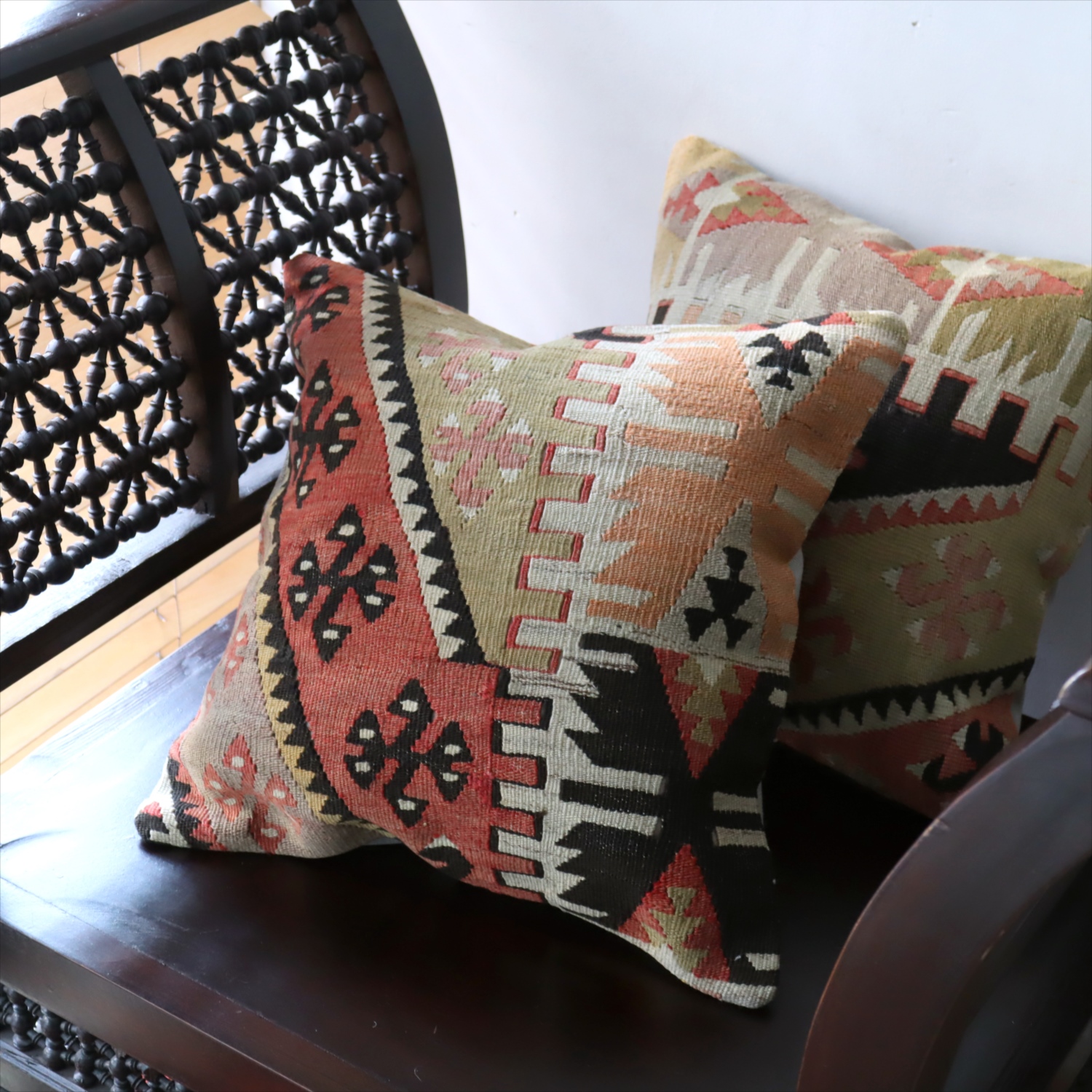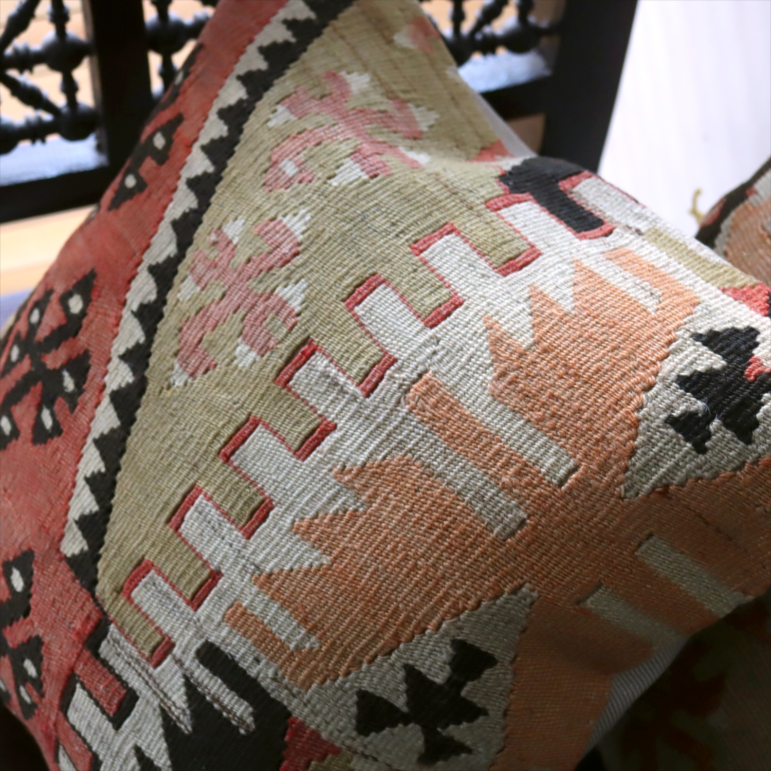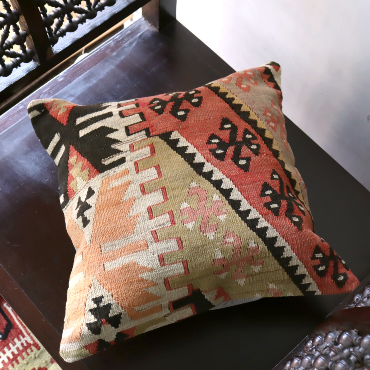 細い糸を使って織られた大型の平織りキリムをカットして作ったクッションカバーです。表面はウールのヴィンテージキリム、裏面は無地のコットン地です。