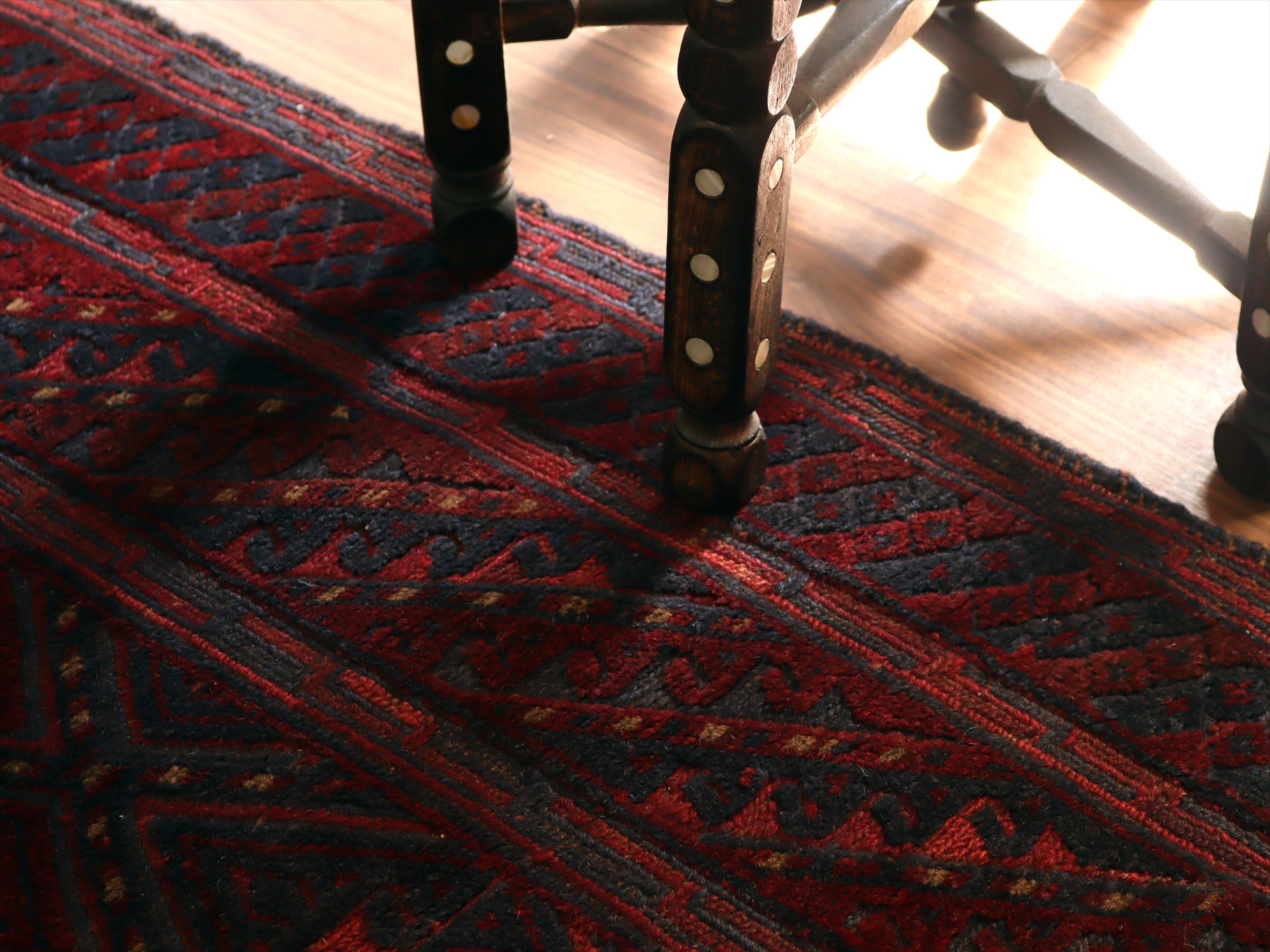 ベース地はスマック織りでしっかりとした織り地です。モチーフ部分はパイル(毛足)のある織りで、表面には立体感があります。