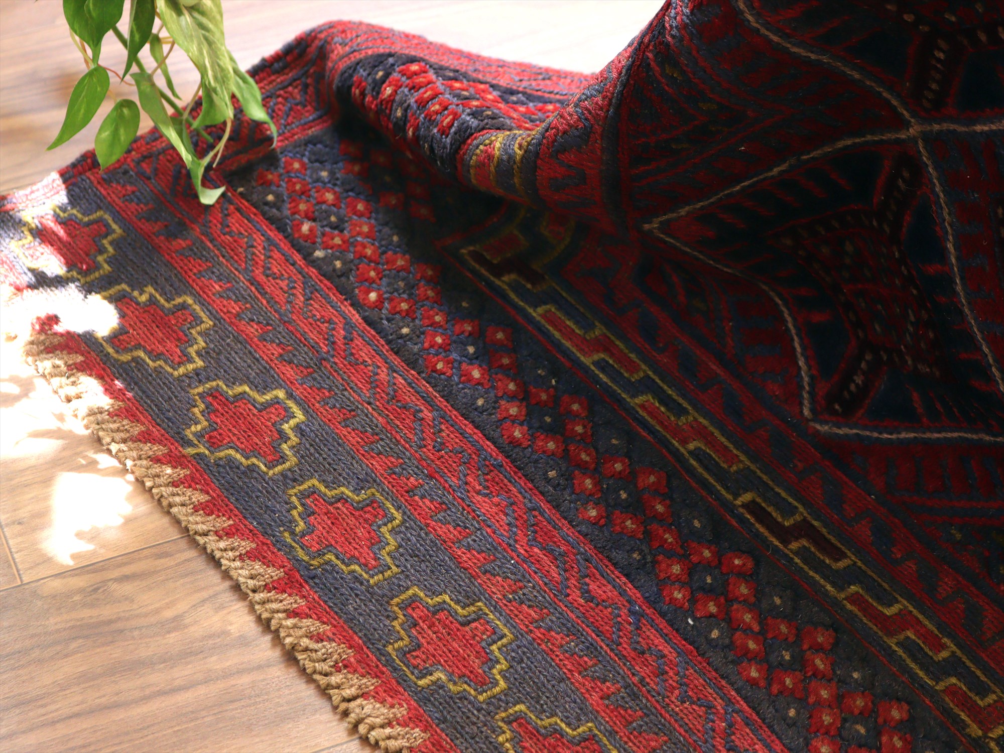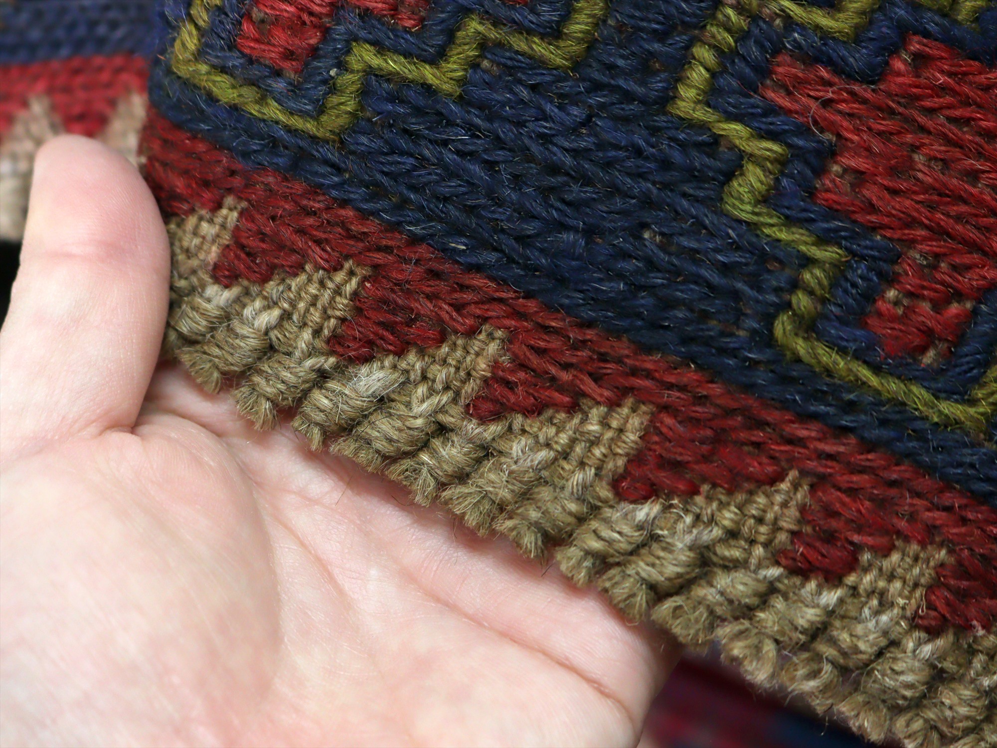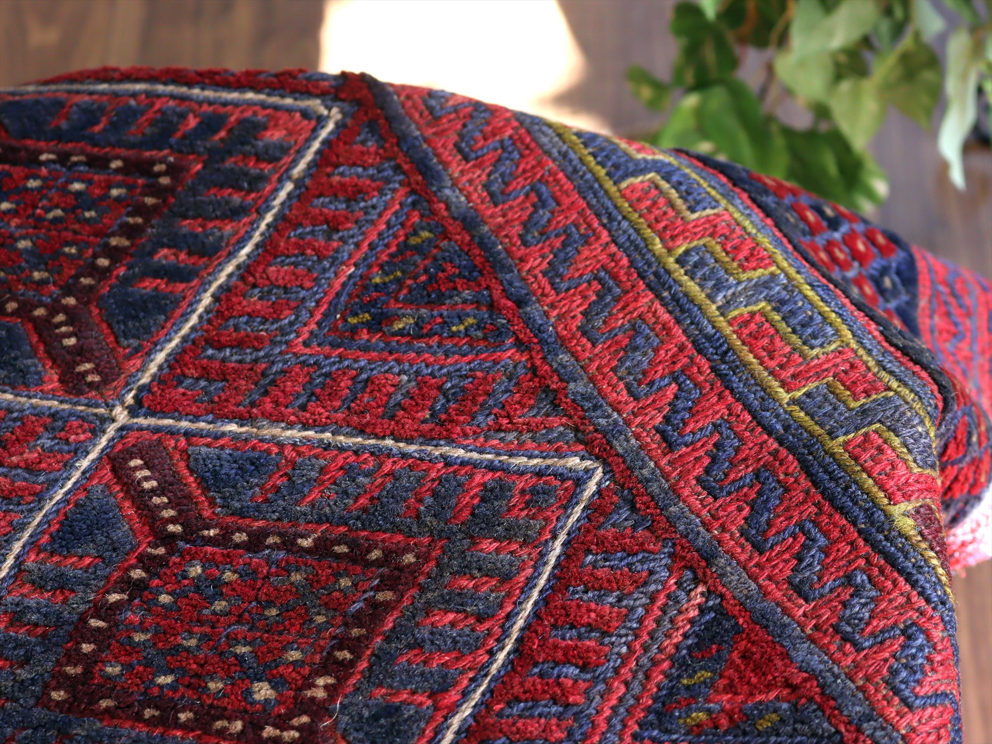 ベース地はスマック織りでしっかりとした織り地です。モチーフ部分はパイル(毛足)のある織りで、表面には立体感があります。