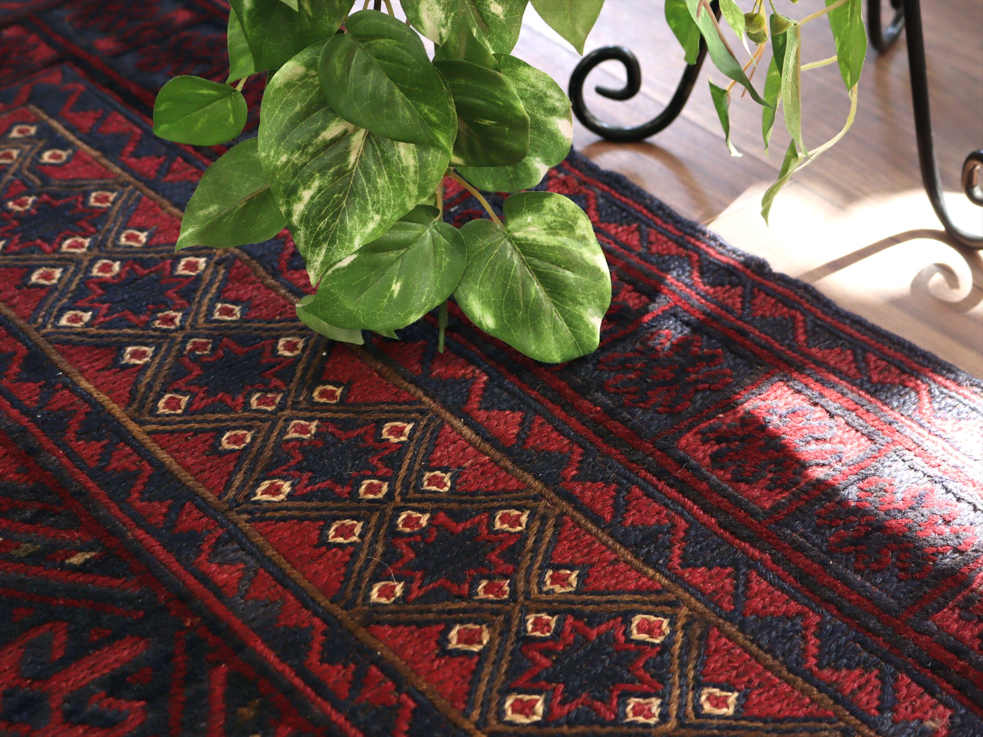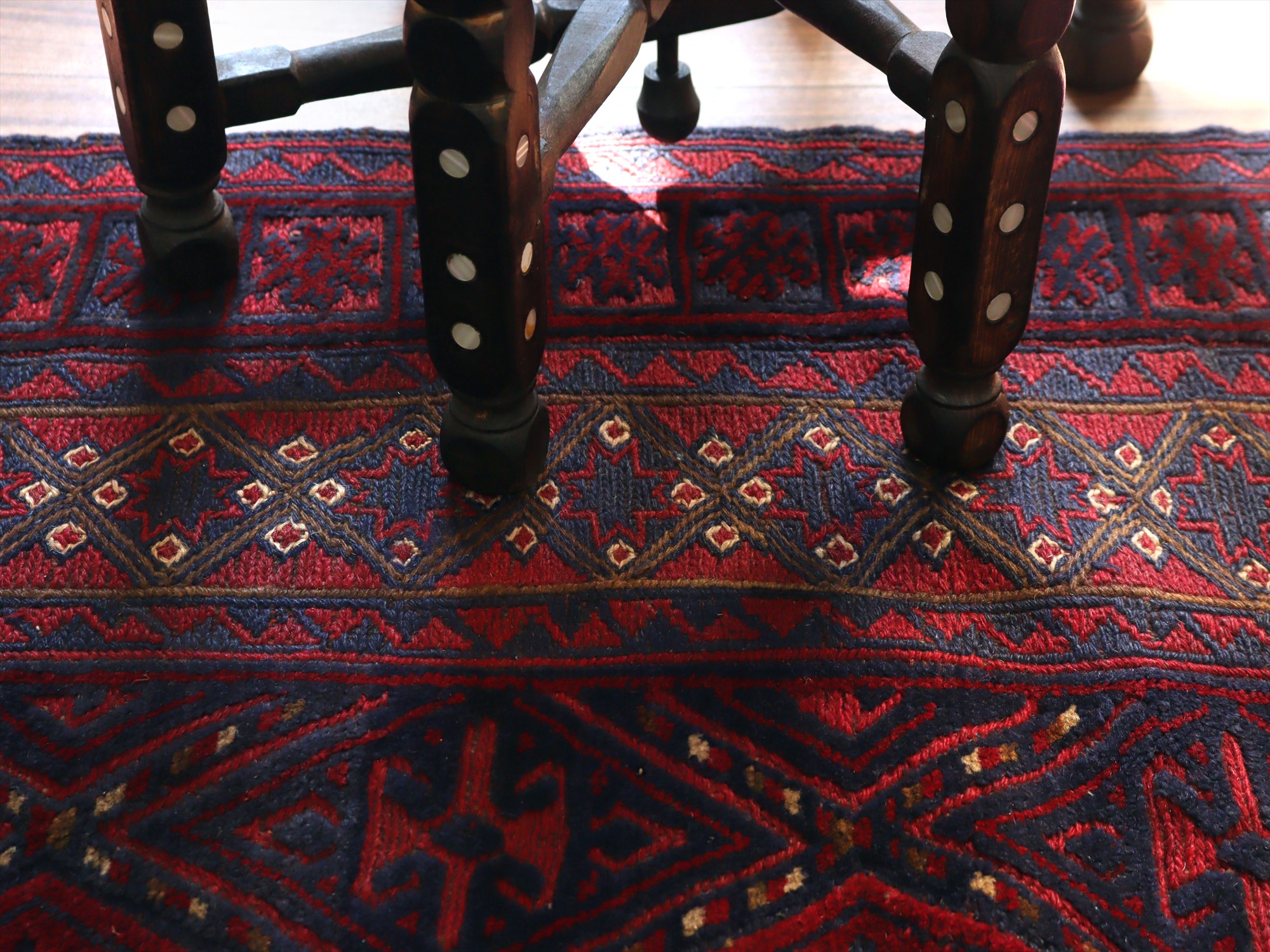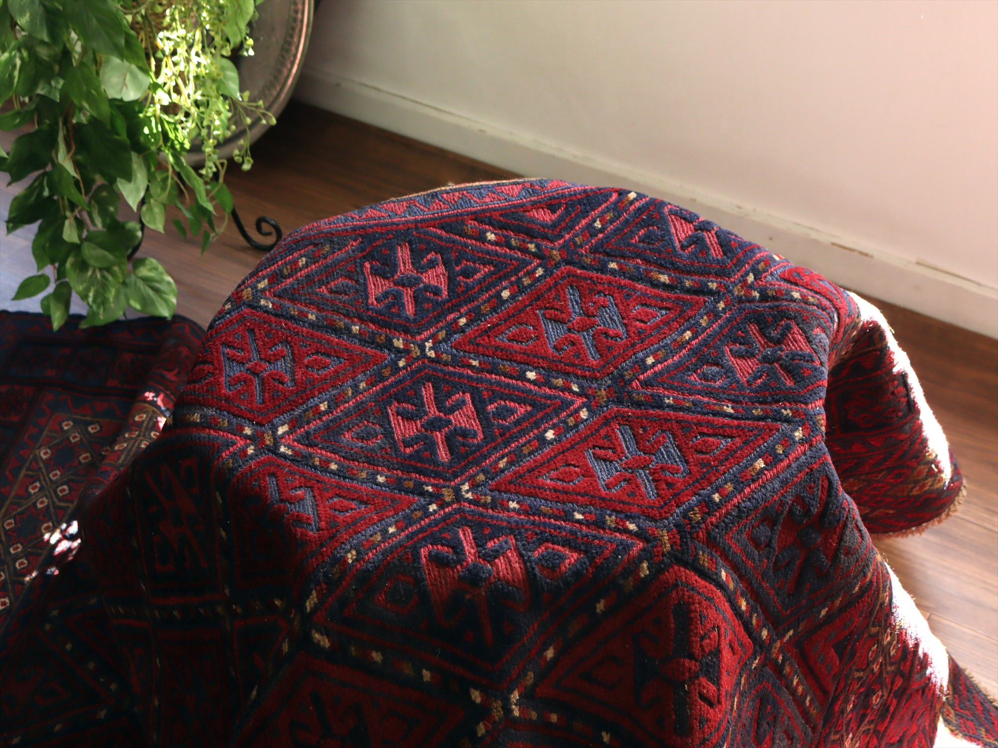 ベース地はスマック織りでしっかりとした織り地です。モチーフ部分はパイル(毛足)のある織りで、表面には立体感があります。