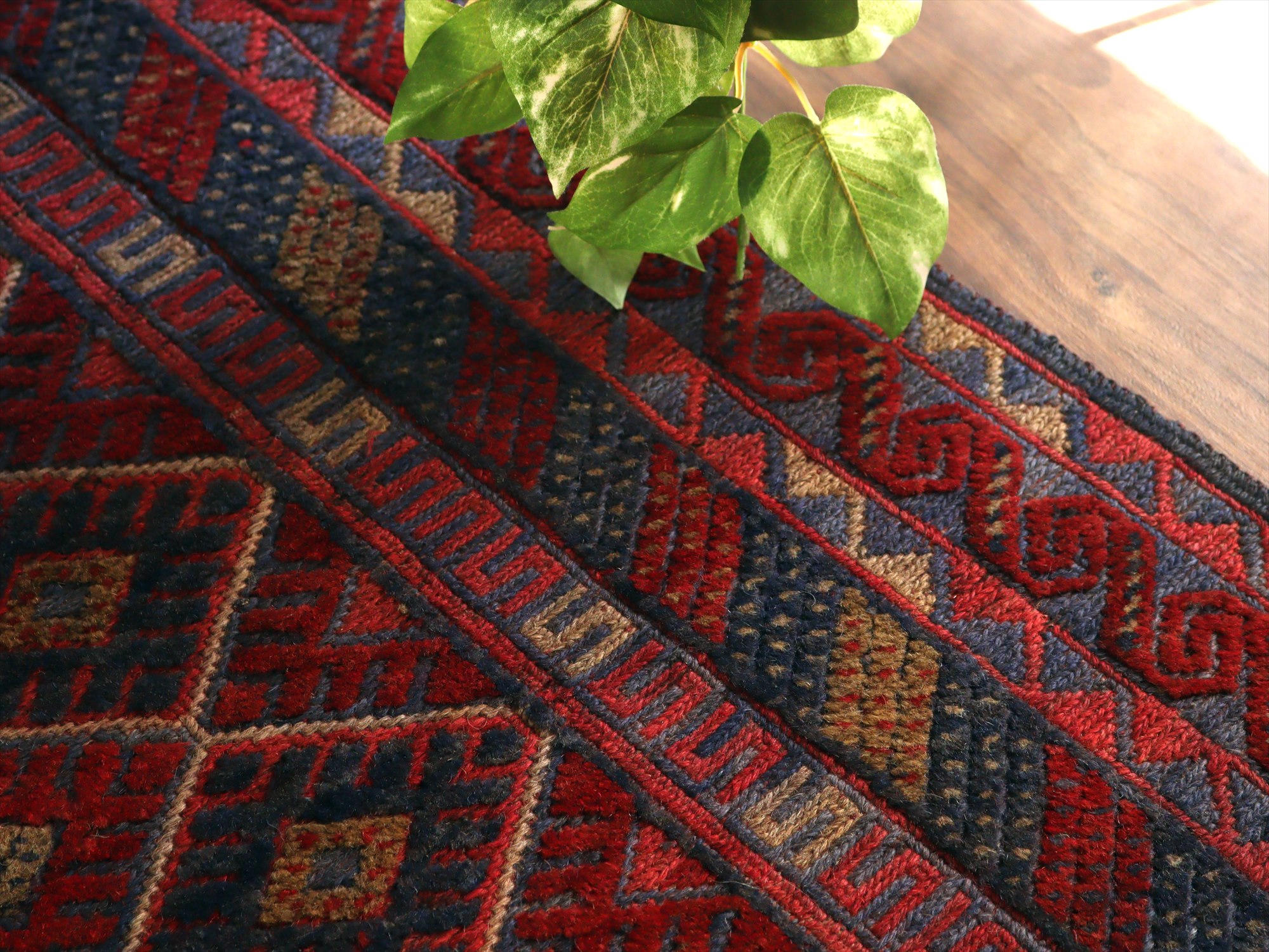 ベース地はスマック織りでしっかりとした織り地です。モチーフ部分はパイル(毛足)のある織りで、表面には立体感があります。