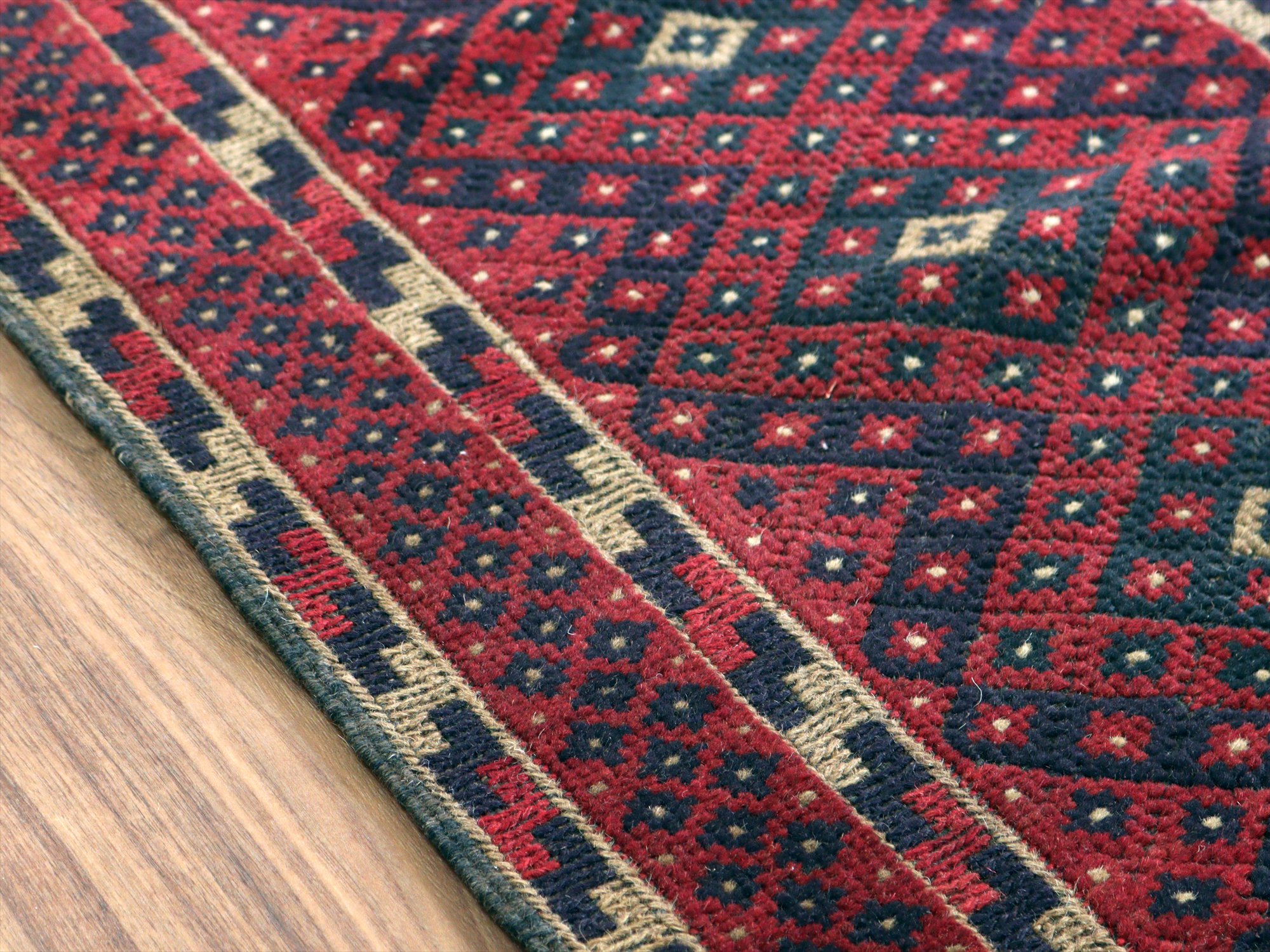 ベース地はスマック織りでしっかりとした織り地です。モチーフ部分はパイル(毛足)のある織りで、表面には立体感があります。