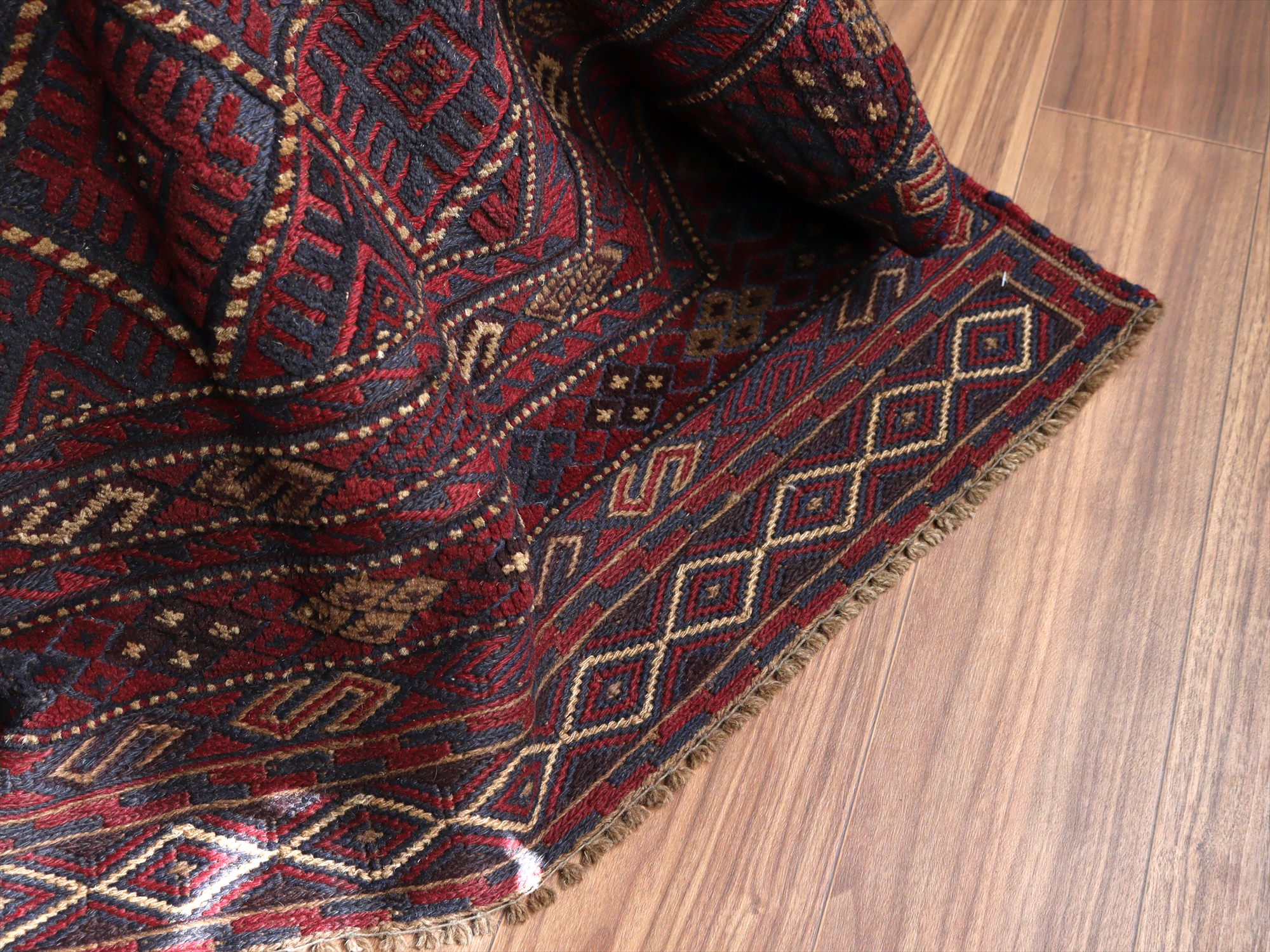 ベース地はスマック織りでしっかりとした織り地です。モチーフ部分はパイル(毛足)のある織りで、表面には立体感があります。