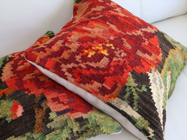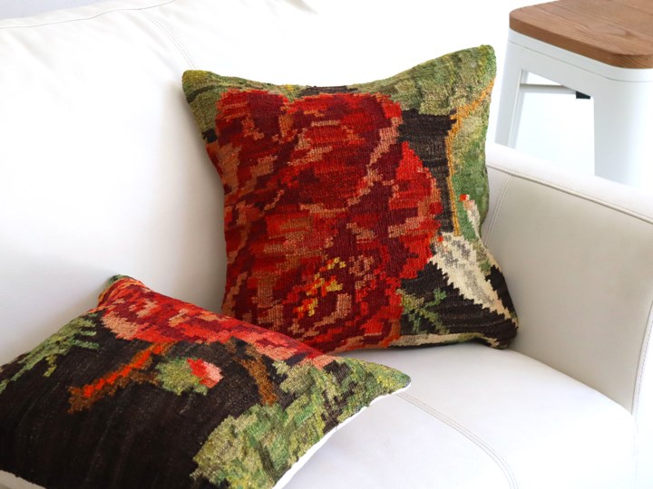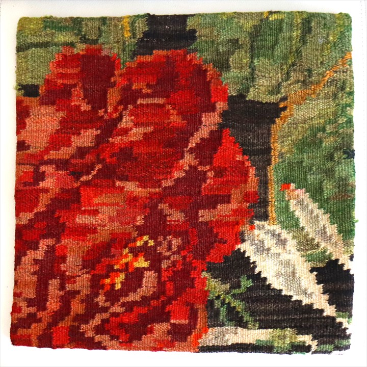 黒い地に鮮やかな赤い花とグリーン。華やかな印象です。トルコから黒海を挟んで北側に向かい合うモルダヴィア共和国のエリアで、伝統的に織られてきた装飾用(主に壁に飾る)の大型のキリムからのカットピースです。