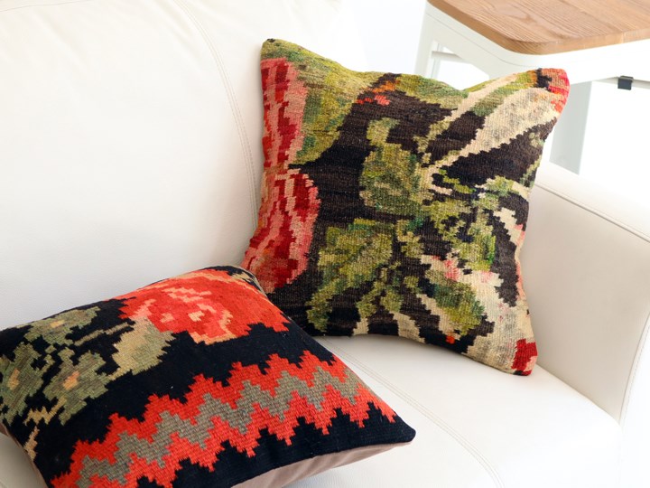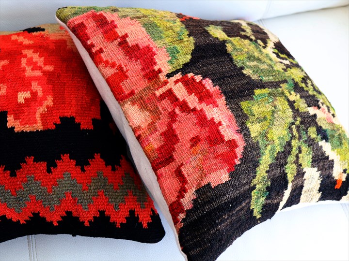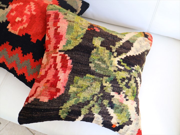 黒い地に鮮やかな赤い花とグリーン。華やかな印象です。トルコから黒海を挟んで北側に向かい合うモルダヴィア共和国のエリアで、伝統的に織られてきた装飾用(主に壁に飾る)の大型のキリムからのカットピースです。