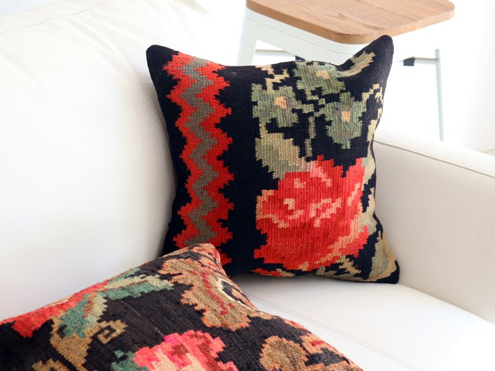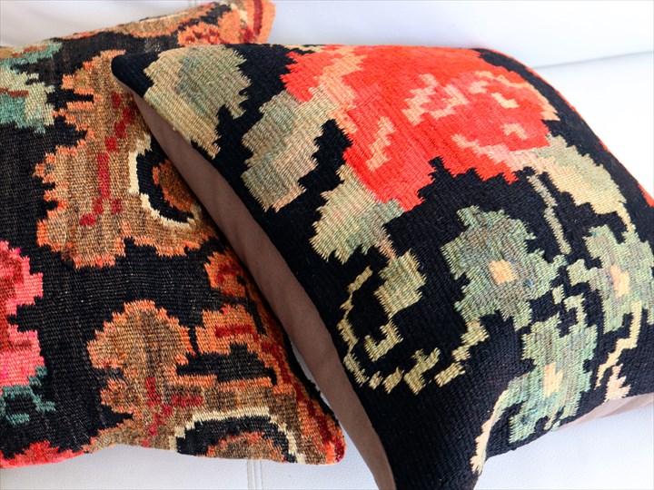 黒い地に鮮やかな赤い花とグリーン。華やかな印象です。トルコから黒海を挟んで北側に向かい合うモルダヴィア共和国のエリアで、伝統的に織られてきた装飾用(主に壁に飾る)の大型のキリムからのカットピースです。