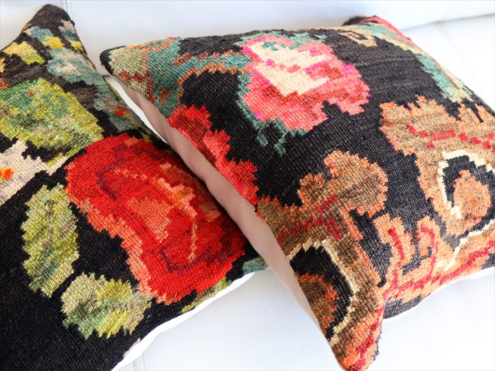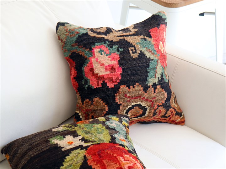 黒い地に鮮やかな赤い花とグリーン。華やかな印象です。トルコから黒海を挟んで北側に向かい合うモルダヴィア共和国のエリアで、伝統的に織られてきた装飾用(主に壁に飾る)の大型のキリムからのカットピースです。