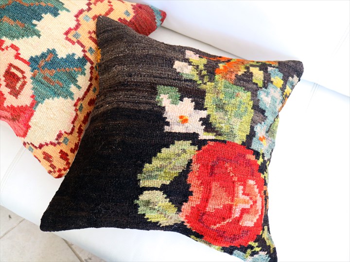 黒い地に鮮やかな赤い花とグリーン。華やかな印象です。トルコから黒海を挟んで北側に向かい合うモルダヴィア共和国のエリアで、伝統的に織られてきた装飾用(主に壁に飾る)の大型のキリムからのカットピースです。