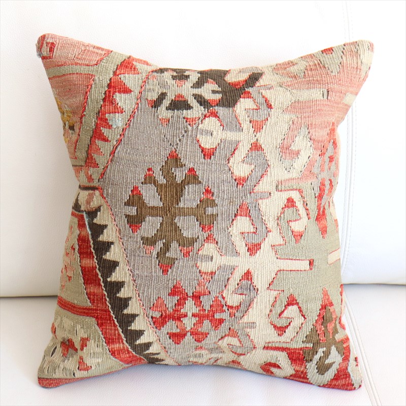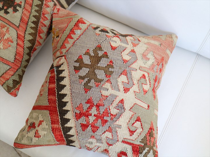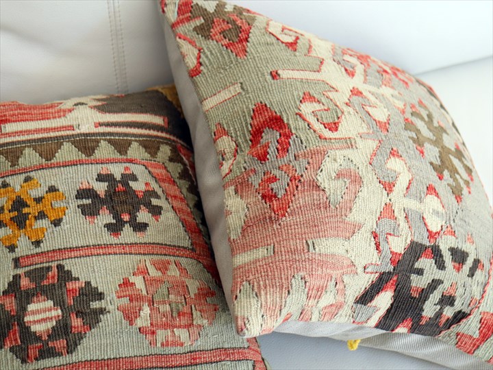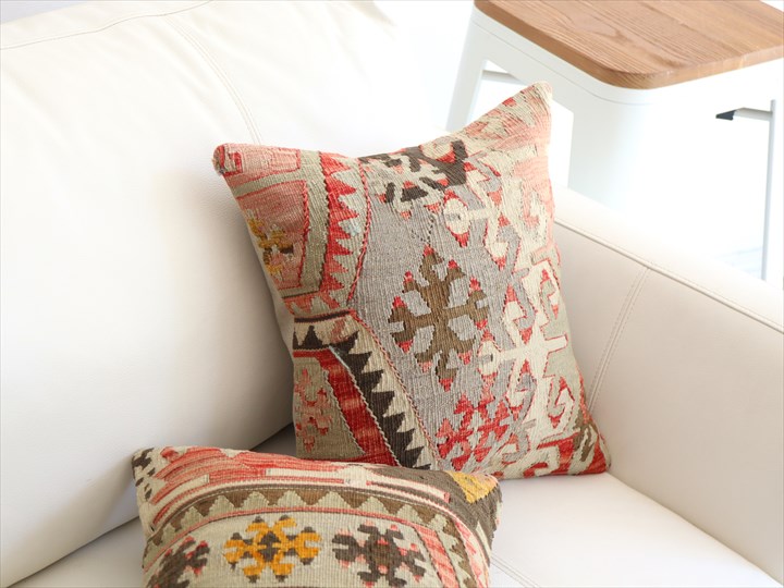 アナトリア中央部シワス地方で織られたオールドキリムから。キリムらしいモチーフが織られています。全体的に日焼けして淡い色合いになっています。中綿は40x40cmがおすすめです。
