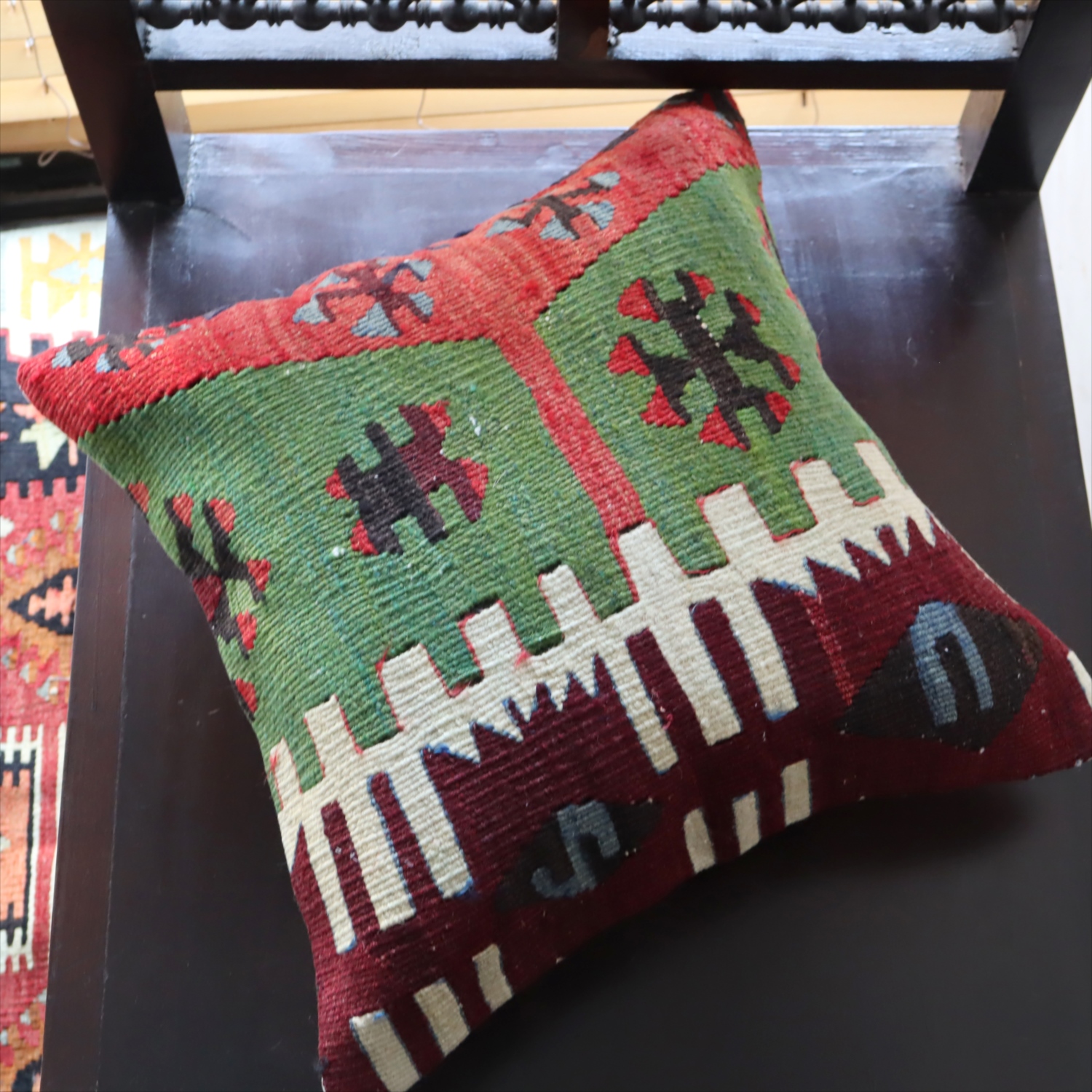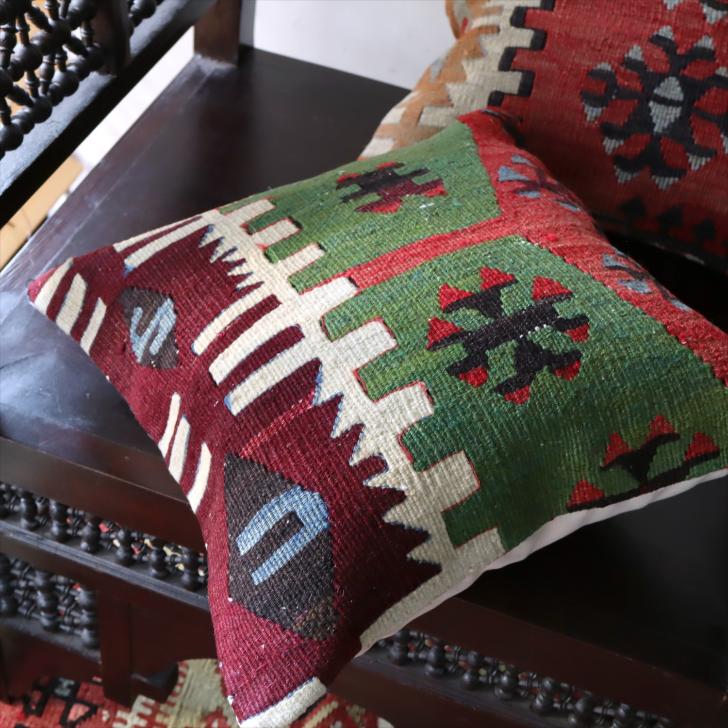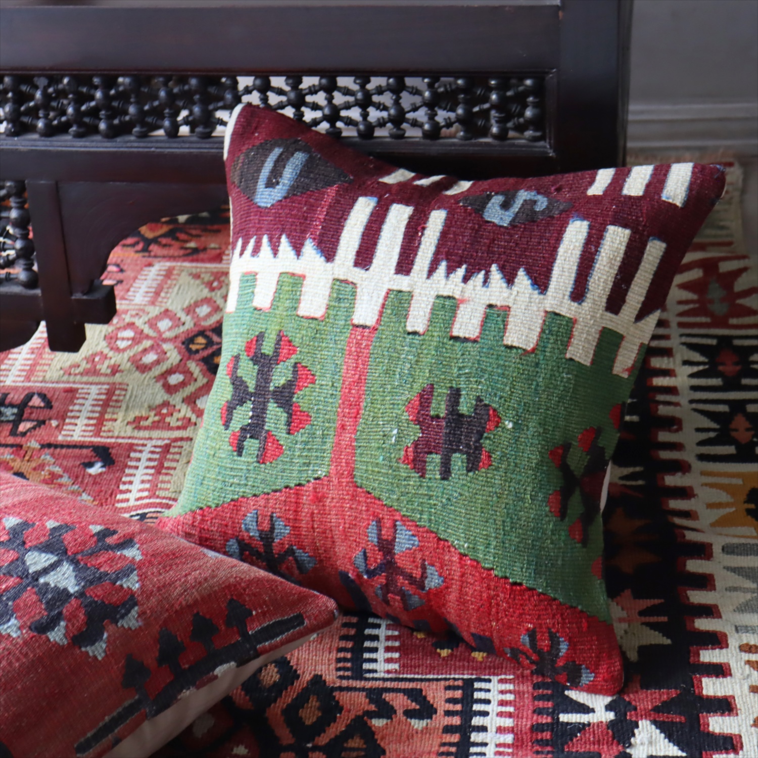 クッションカバーにすると、一枚のキリムから50枚以上に切り分けられるものもあり、配色が似ていてモチーフのバランスが違うクッションができあがります。