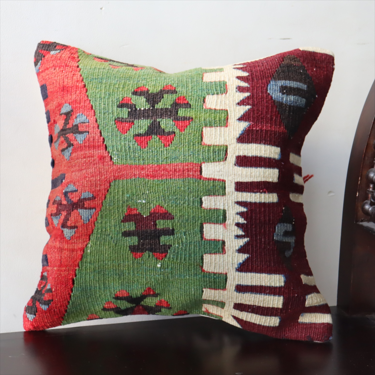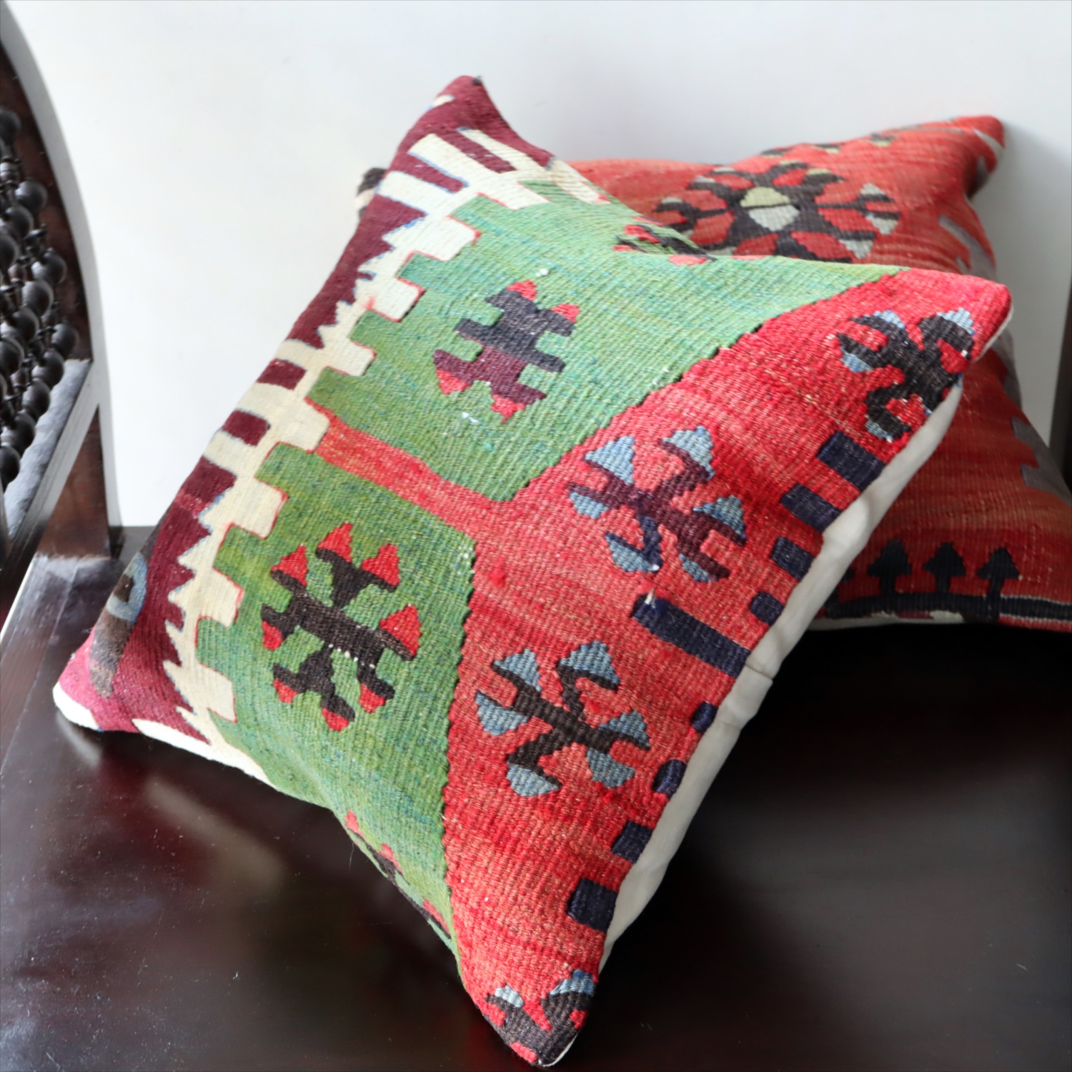 細い糸を使って織られた大型の平織りキリムをカットして作ったクッションカバーです。表面はウールのヴィンテージキリム、裏面は無地のコットン地です。