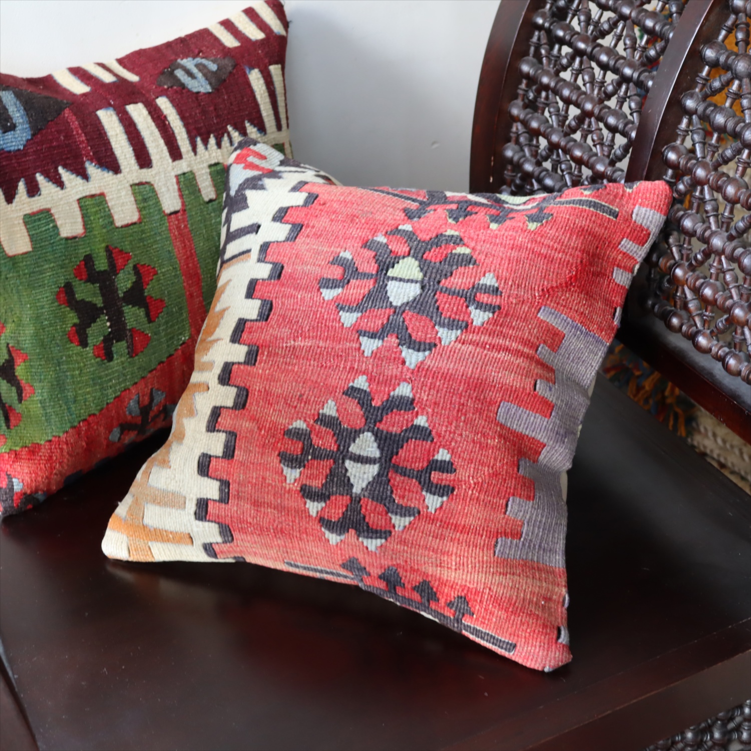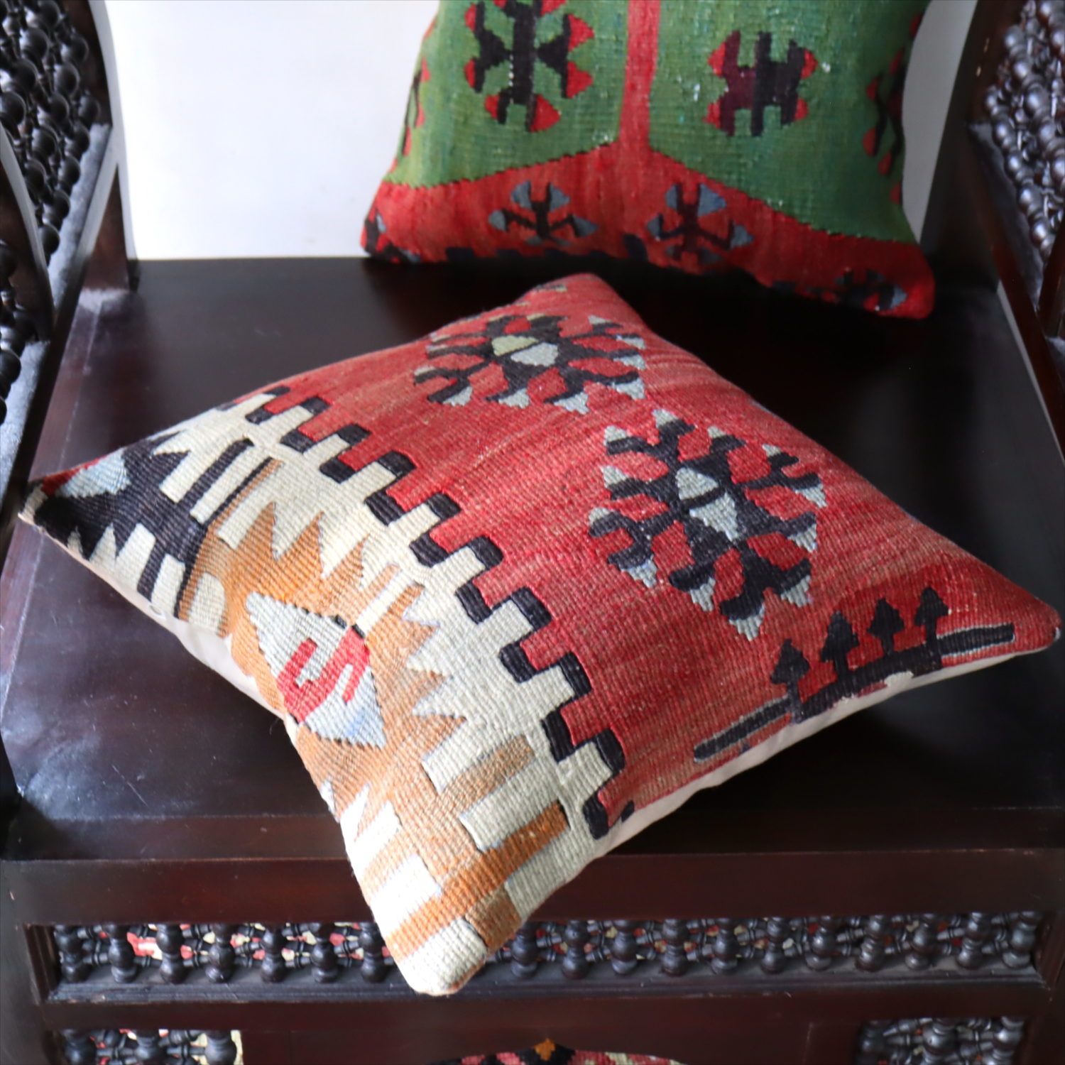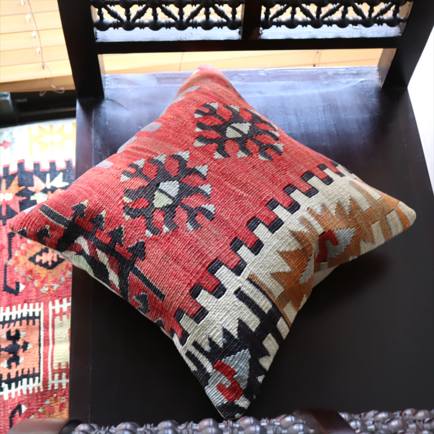 細い糸を使って織られた大型の平織りキリムをカットして作ったクッションカバーです。表面はウールのヴィンテージキリム、裏面は無地のコットン地です。