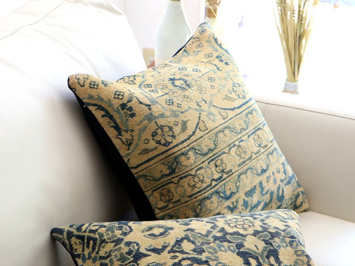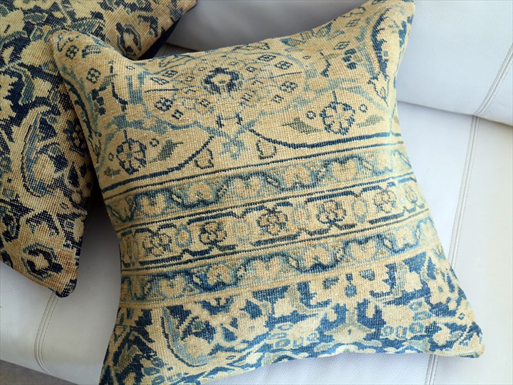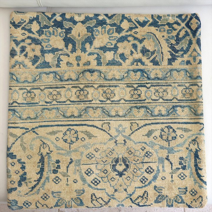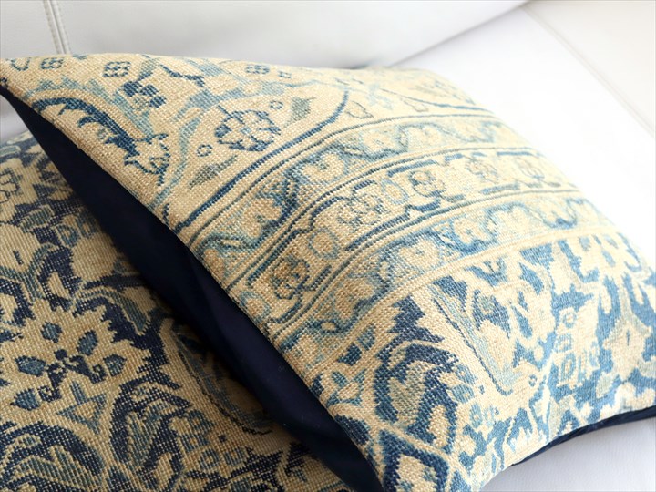 紺とベージュをベースにしたクラシックなデザインのコンヤ地方の手織りじゅうたんを、ブリーチ加工してクッションに仕立てました。色だけでなく、ラグ自体もかなり古びていて、ヴィンテージ感があります。1960-70年代に織られたコンヤ地方の大型の絨毯です。じゅうたんの織りがとても細かく、かっちりと引き締まった固めの質感。パイル(毛足)はすり減っていてほとんど残っていません。触ってみると表面はざらっとした感じ。