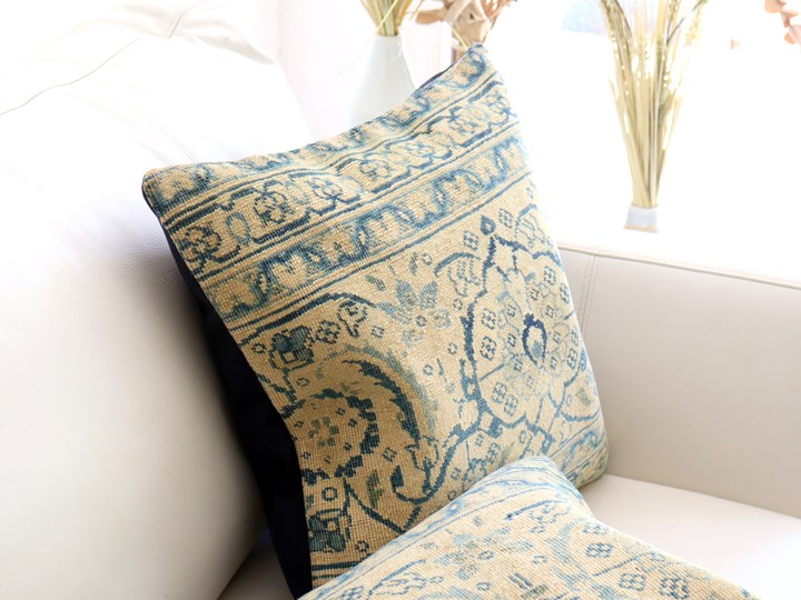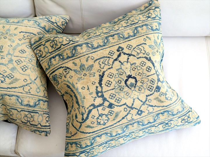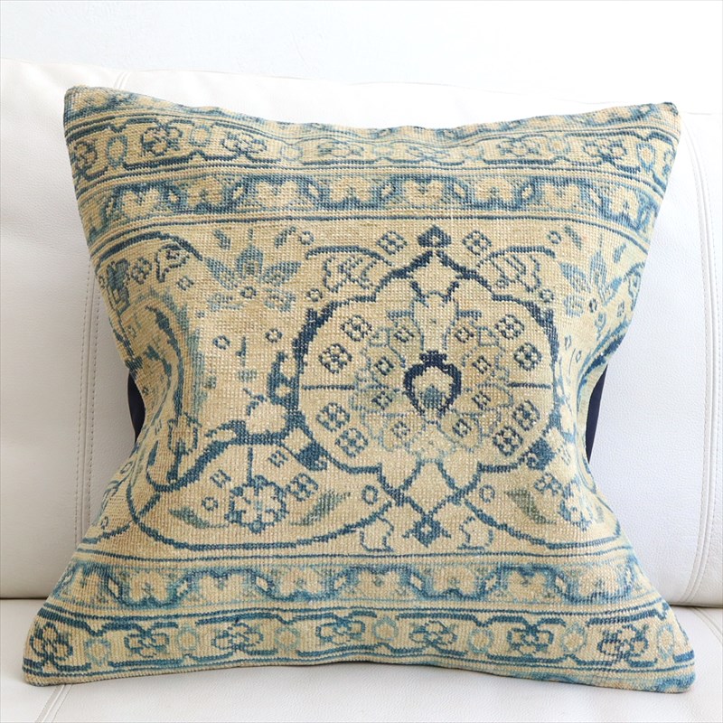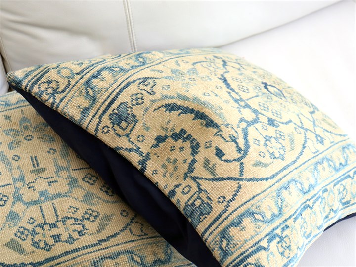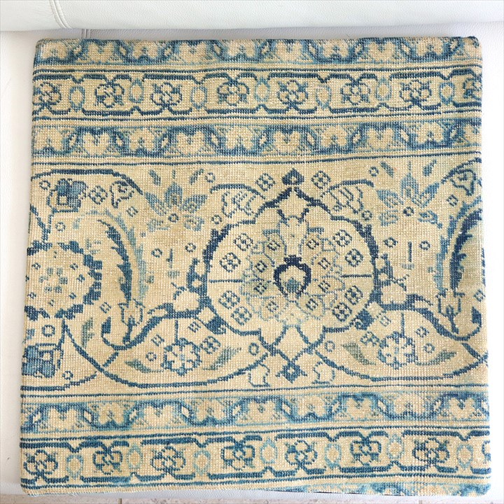 紺とベージュをベースにしたクラシックなデザインのコンヤ地方の手織りじゅうたんを、ブリーチ加工してクッションに仕立てました。色だけでなく、ラグ自体もかなり古びていて、ヴィンテージ感があります。1960-70年代に織られたコンヤ地方の大型の絨毯です。じゅうたんの織りがとても細かく、かっちりと引き締まった固めの質感。パイル(毛足)はすり減っていてほとんど残っていません。触ってみると表面はざらっとした感じ。
