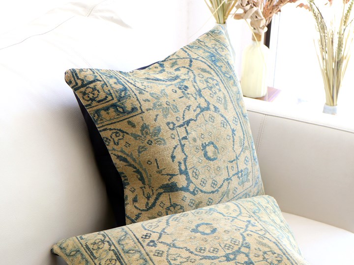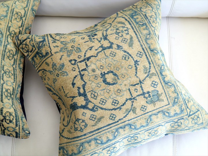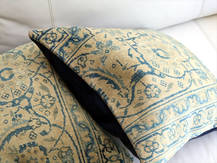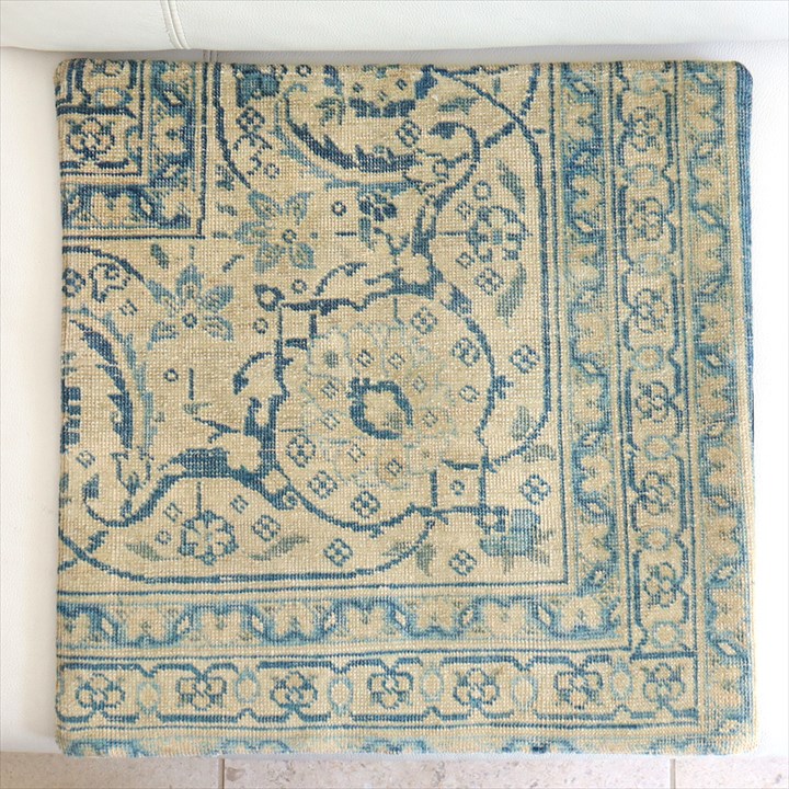 紺とベージュをベースにしたクラシックなデザインのコンヤ地方の手織りじゅうたんを、ブリーチ加工してクッションに仕立てました。色だけでなく、ラグ自体もかなり古びていて、ヴィンテージ感があります。1960-70年代に織られたコンヤ地方の大型の絨毯です。じゅうたんの織りがとても細かく、かっちりと引き締まった固めの質感。パイル(毛足)はすり減っていてほとんど残っていません。触ってみると表面はざらっとした感じ。