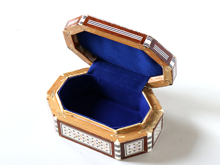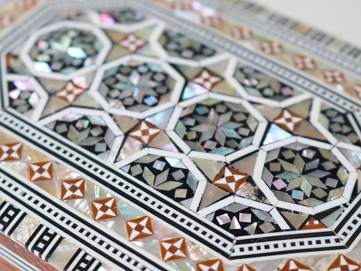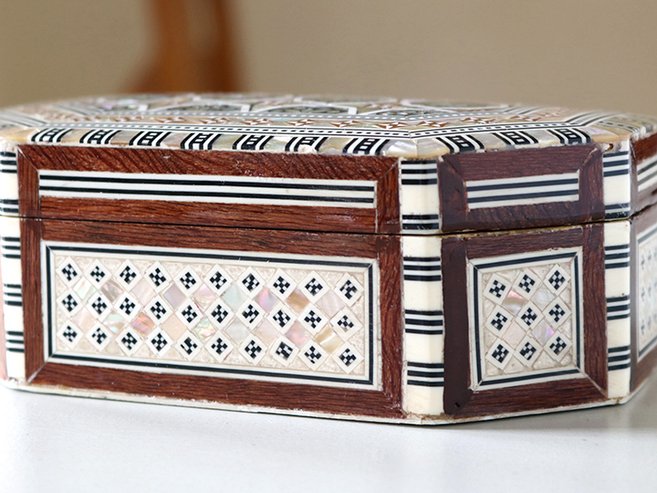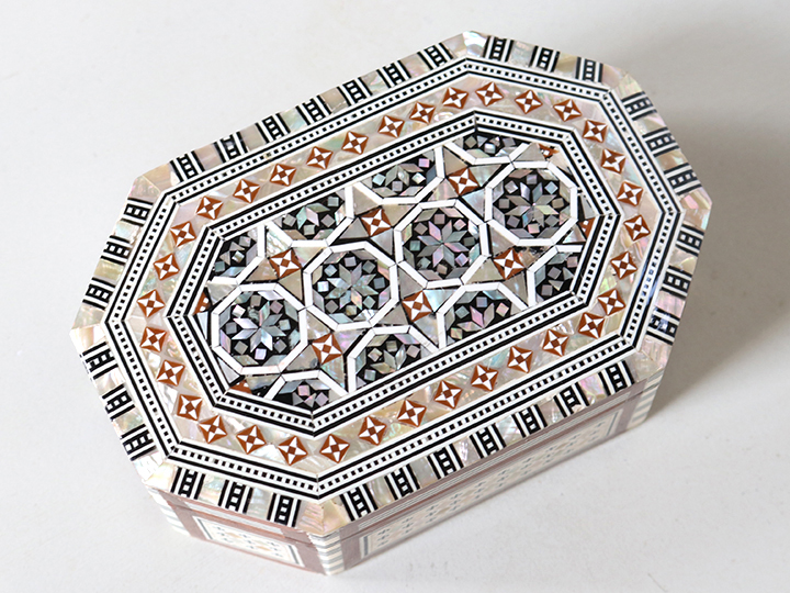 オスマン帝国時代にトルコ南部やシリアから伝えられた伝統工芸品の螺鈿細工。現在はカイロで作られ、中東エリアの広い地域に装飾品として輸出されています。真珠母貝(主にアコヤガイ)の貝殻の内側の真珠質をはめ込んだ煌めく宝石箱です。内寸:W11.5×H3.5×D6.5cm