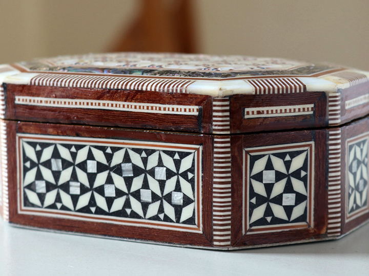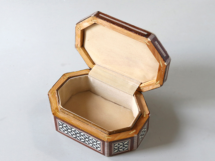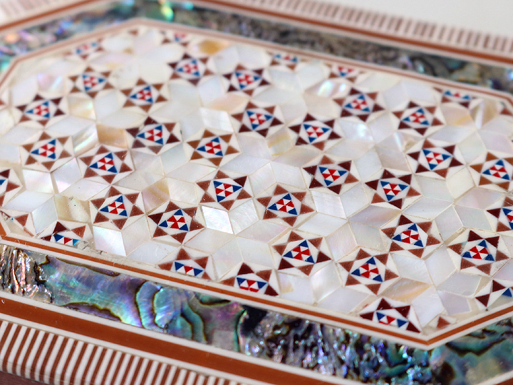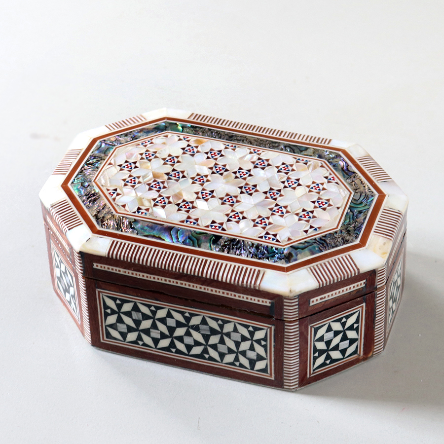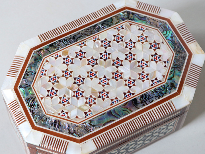 オスマン帝国時代にトルコ南部やシリアから伝えられた伝統工芸品の螺鈿細工。現在はカイロで作られ、中東エリアの広い地域に装飾品として輸出されています。真珠母貝(主にアコヤガイ)の貝殻の内側の真珠質をはめ込んだ煌めく宝石箱です。内寸:W11×H3.5×D6cm