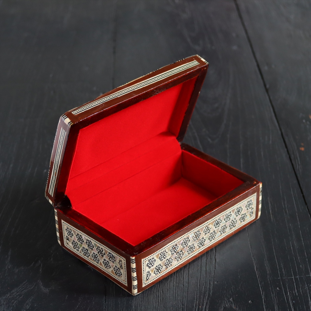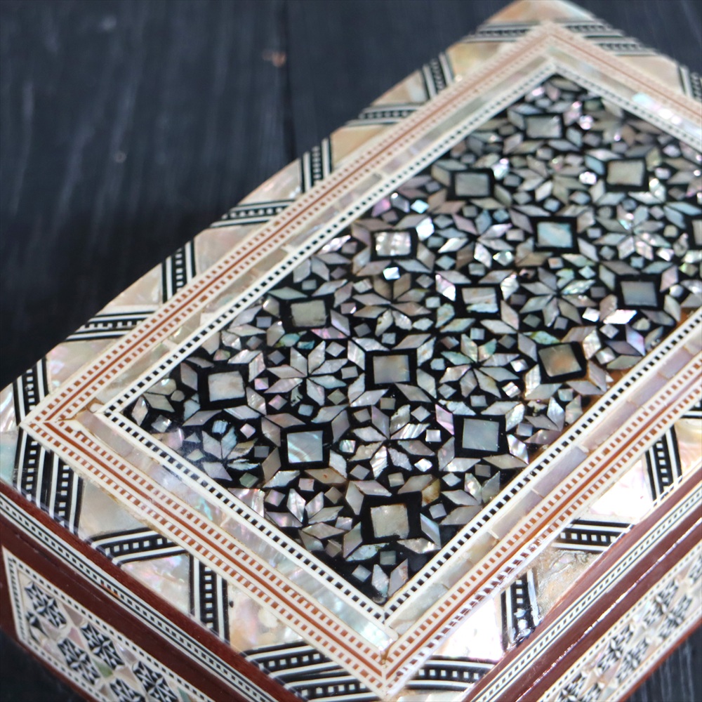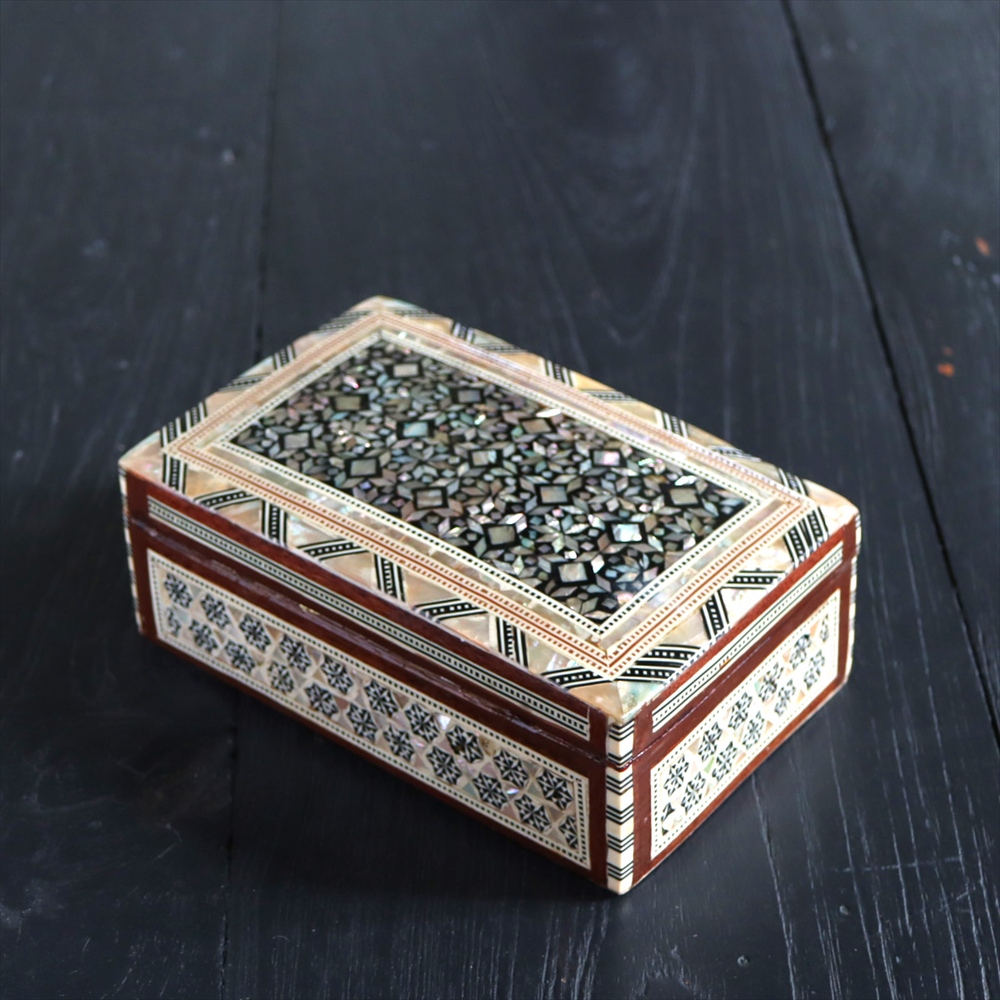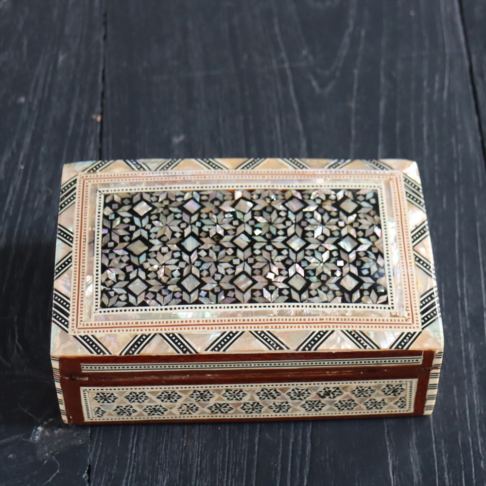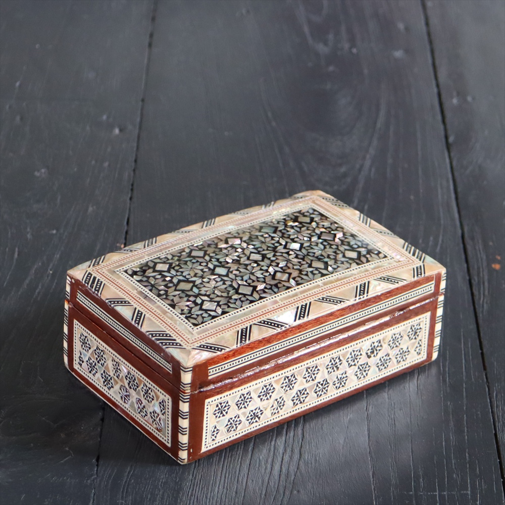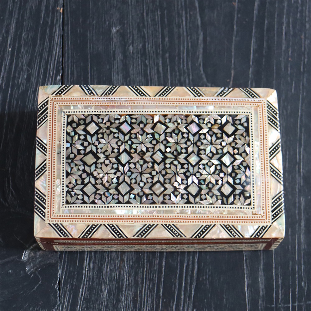 オスマン帝国時代にトルコ南部やシリアから伝えられた伝統工芸品の螺鈿細工。現在はカイロで作られ、中東エリアの広い地域に装飾品として輸出されています。真珠母貝(主にアコヤガイ)の貝殻の内側の真珠質をはめ込んだ煌めく宝石箱です。