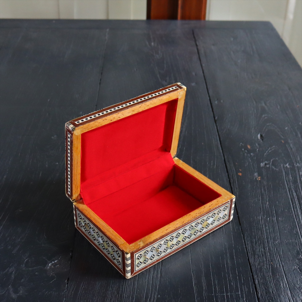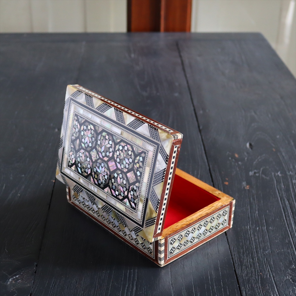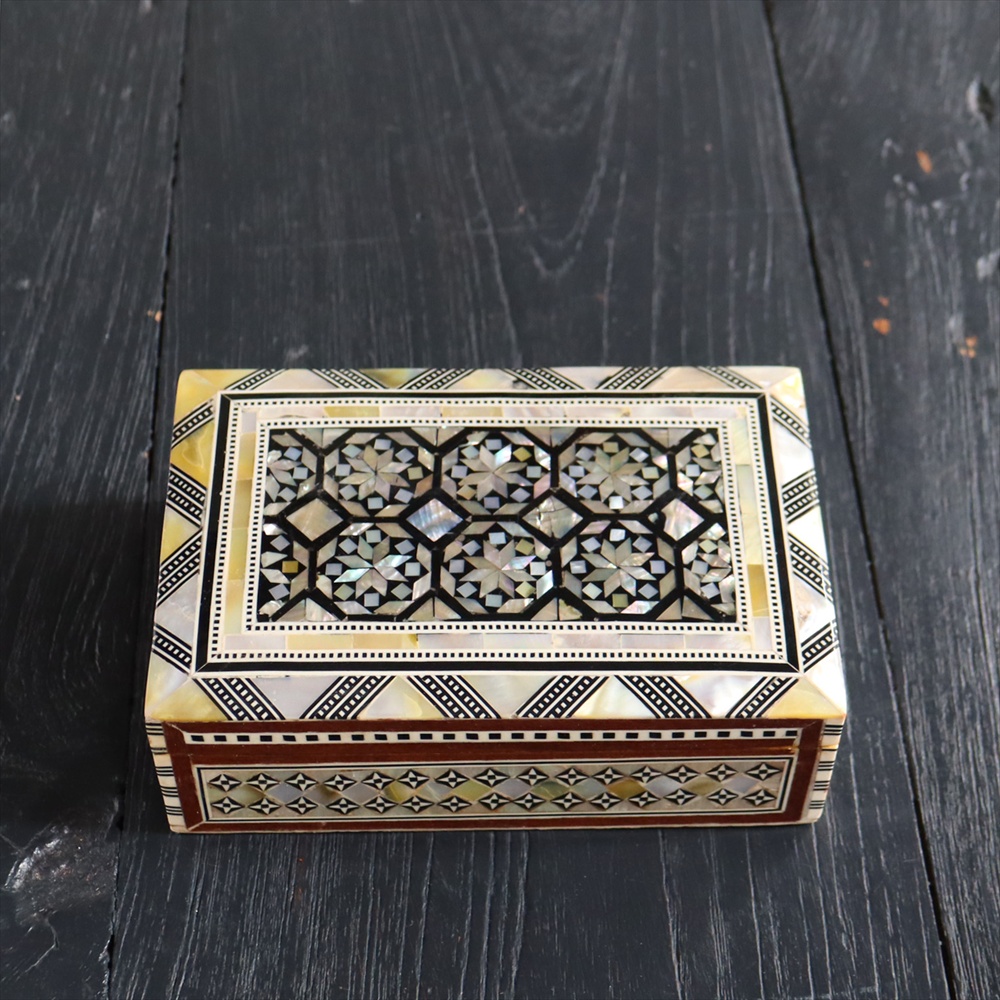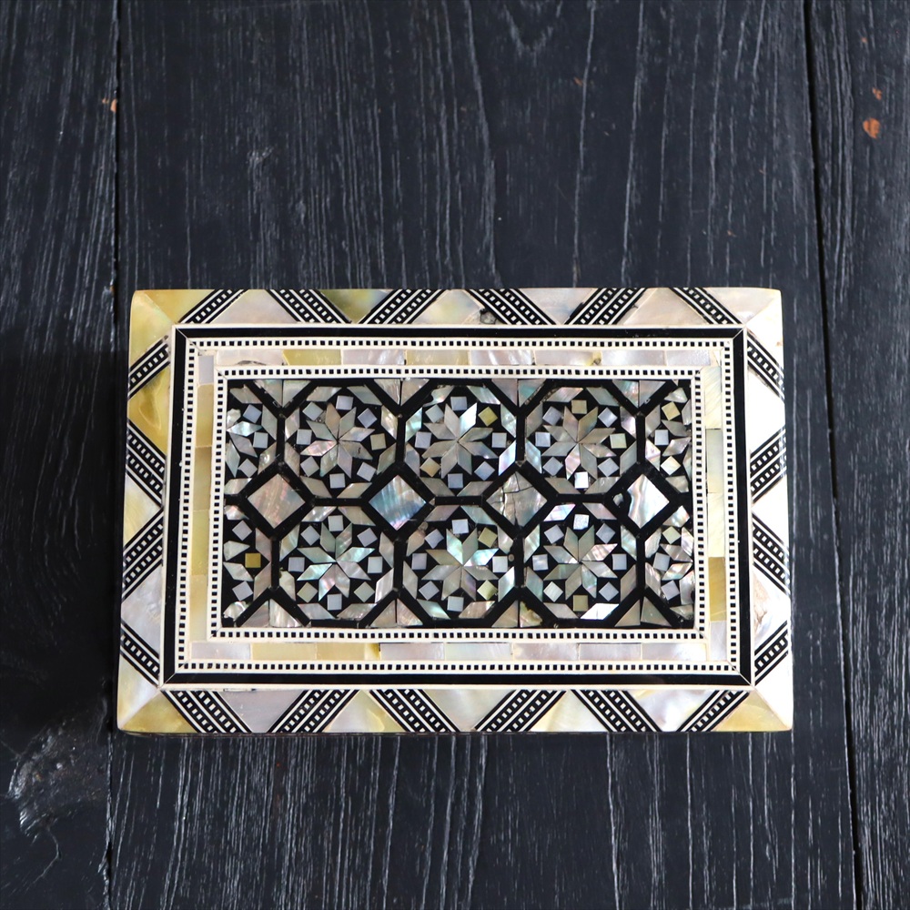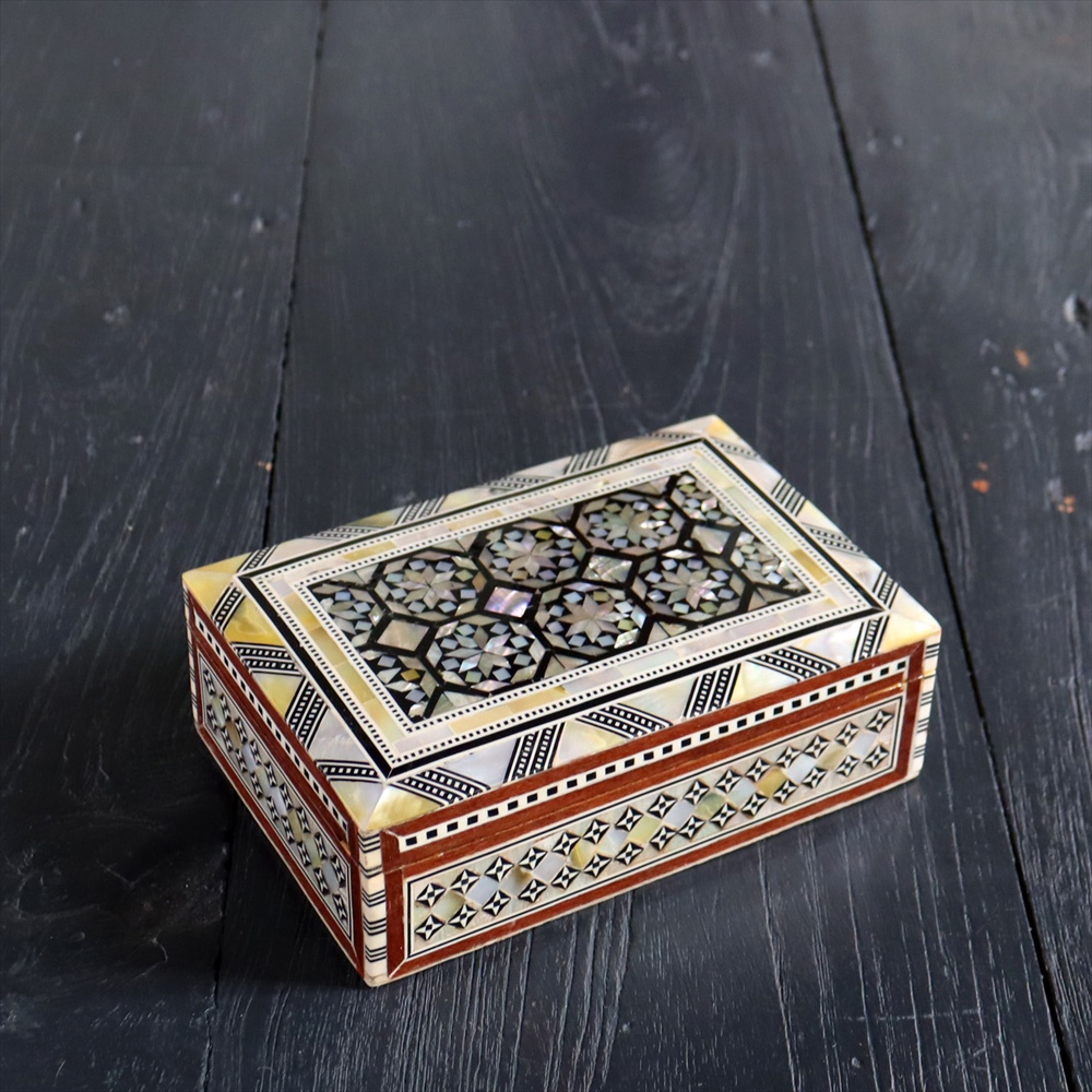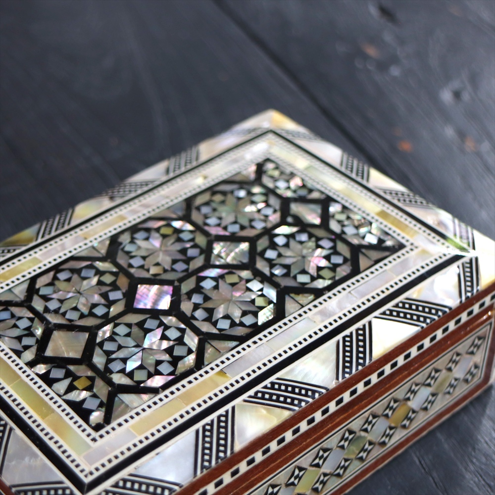 オスマン帝国時代にトルコ南部やシリアから伝えられた伝統工芸品の螺鈿細工。現在はカイロで作られ、中東エリアの広い地域に装飾品として輸出されています。真珠母貝(主にアコヤガイ)の貝殻の内側の真珠質をはめ込んだ煌めく宝石箱です。