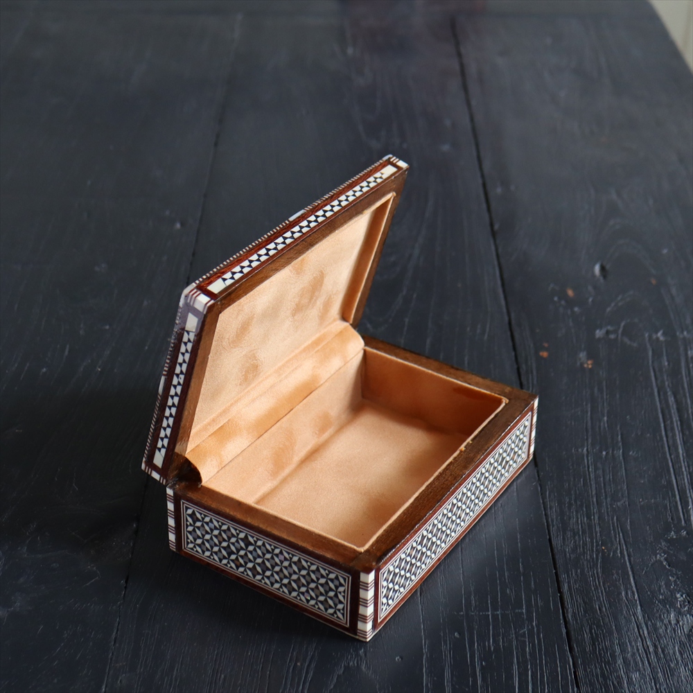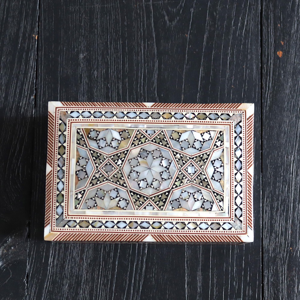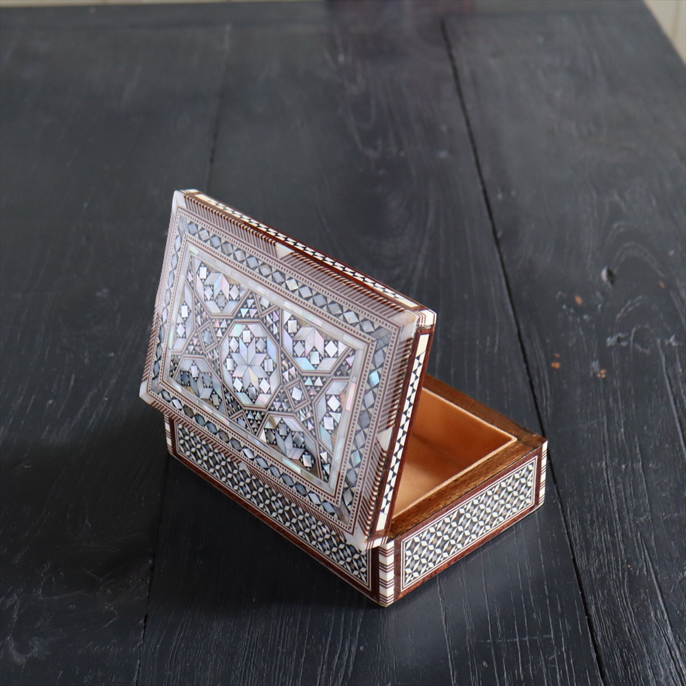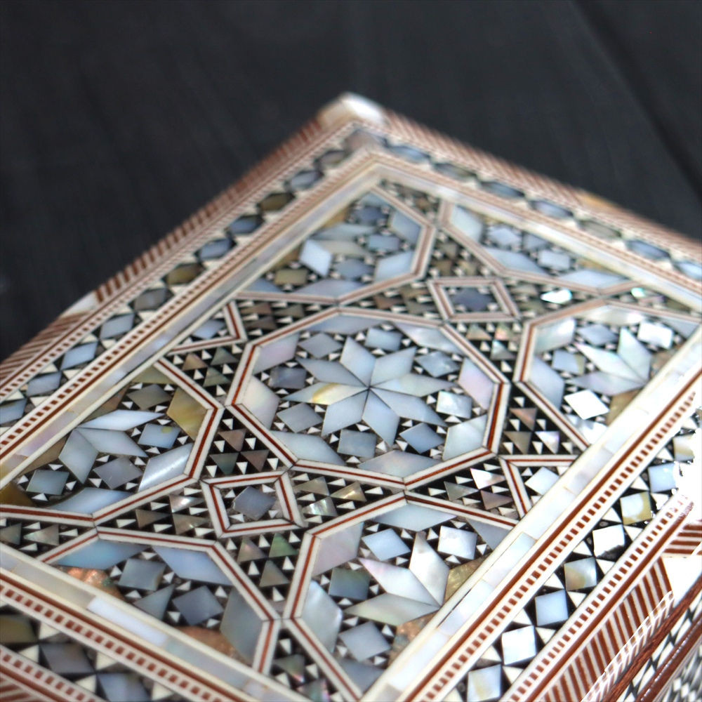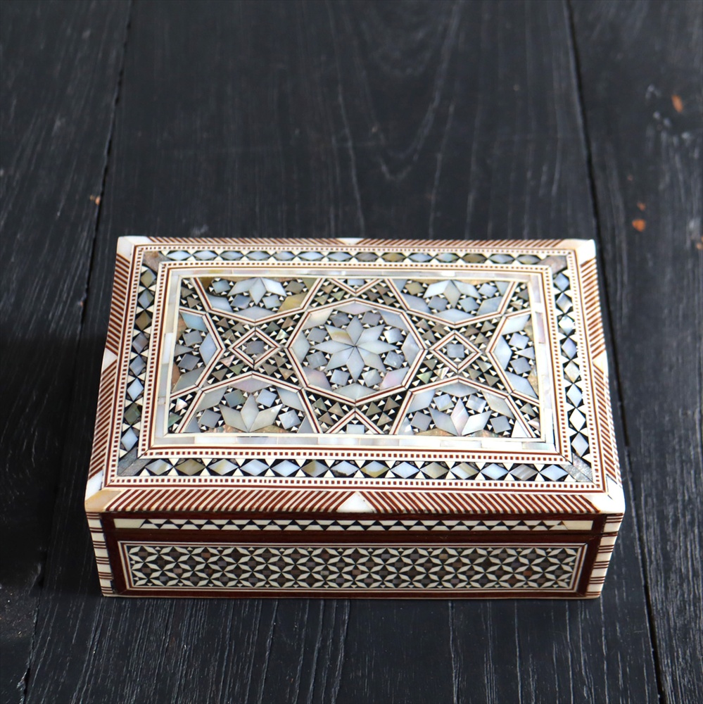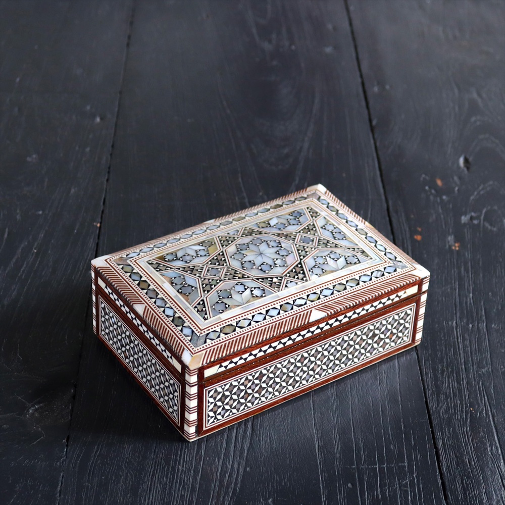オスマン帝国時代にトルコ南部やシリアから伝えられた伝統工芸品の螺鈿細工。現在はカイロで作られ、中東エリアの広い地域に装飾品として輸出されています。真珠母貝(主にアコヤガイ)の貝殻の内側の真珠質をはめ込んだ煌めく宝石箱です。