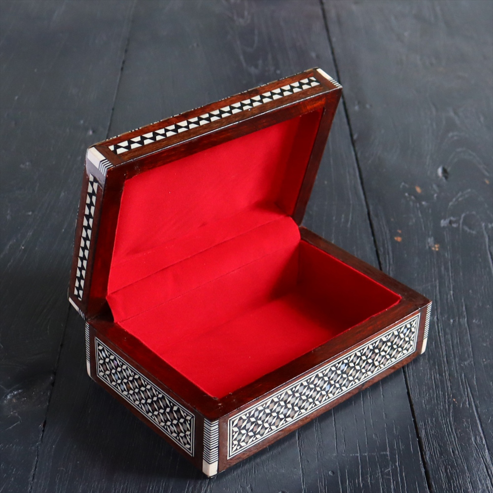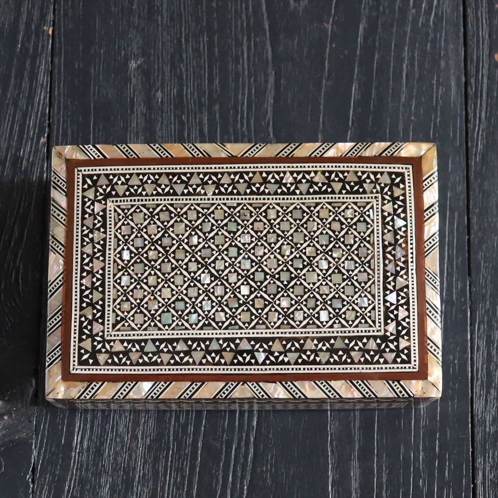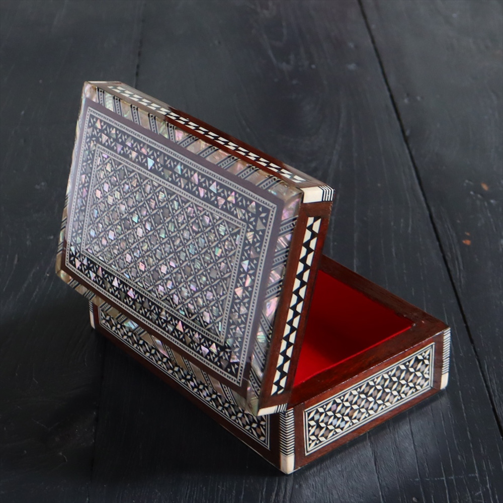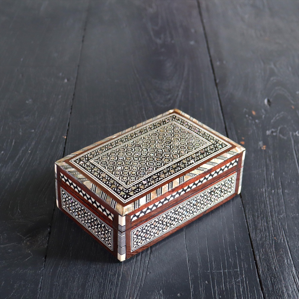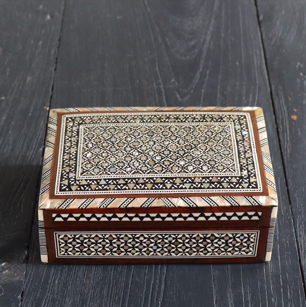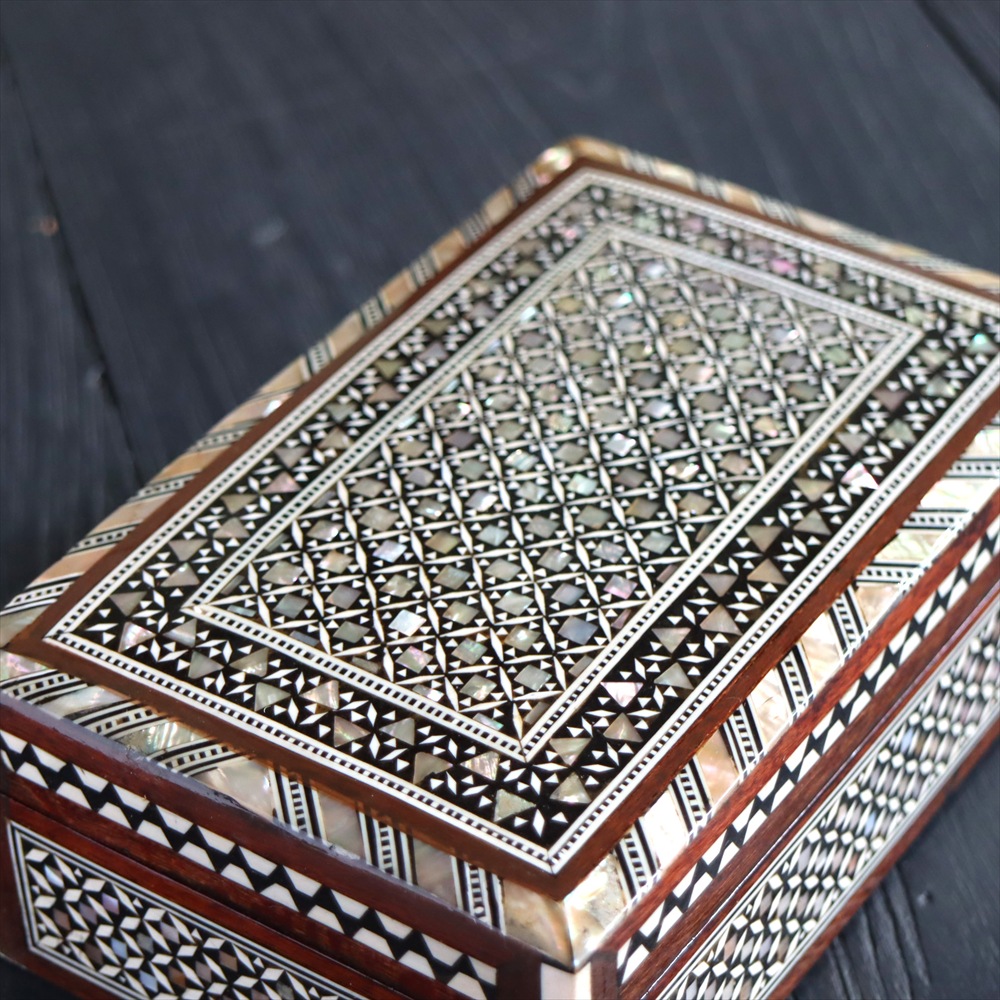 オスマン帝国時代にトルコ南部やシリアから伝えられた伝統工芸品の螺鈿細工。現在はカイロで作られ、中東エリアの広い地域に装飾品として輸出されています。真珠母貝(主にアコヤガイ)の貝殻の内側の真珠質をはめ込んだ煌めく宝石箱です。