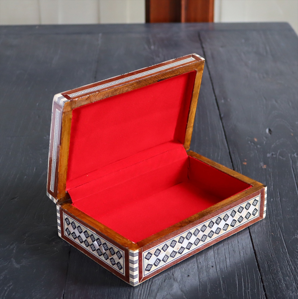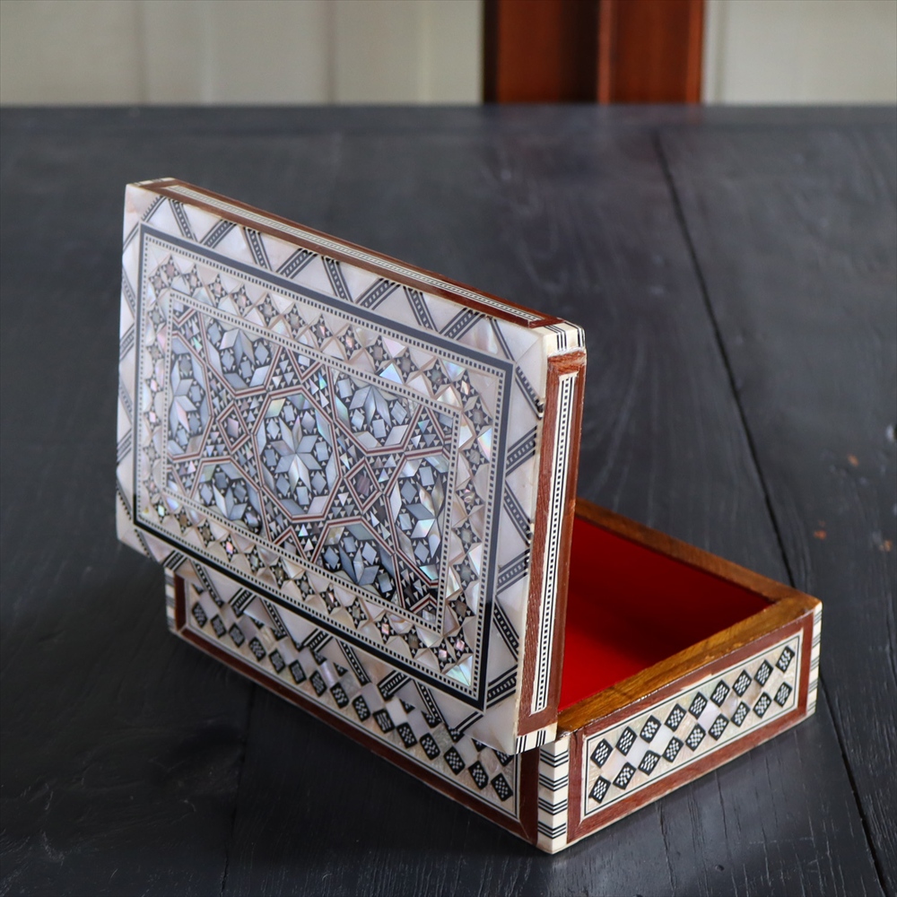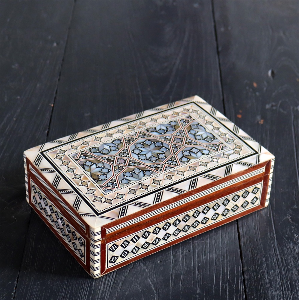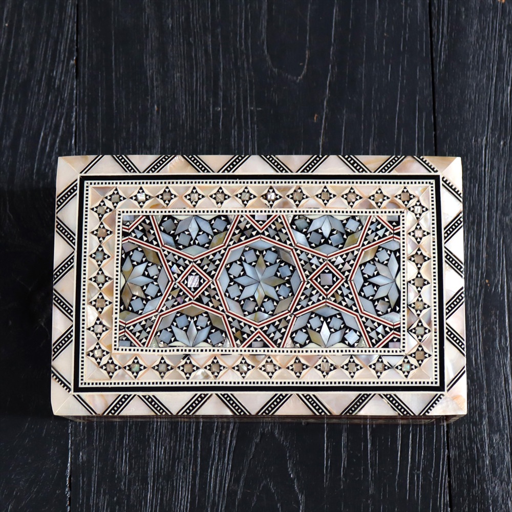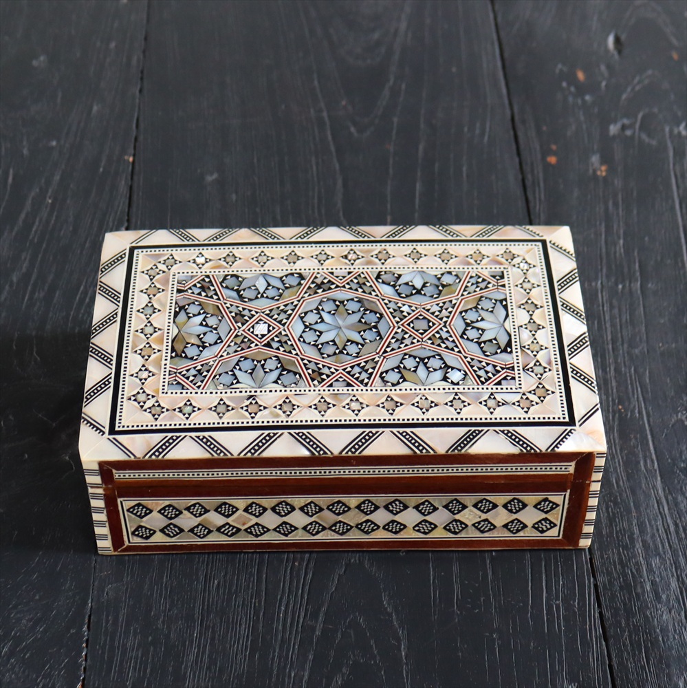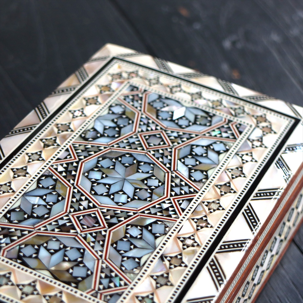 オスマン帝国時代にトルコ南部やシリアから伝えられた伝統工芸品の螺鈿細工。現在はカイロで作られ、中東エリアの広い地域に装飾品として輸出されています。真珠母貝(主にアコヤガイ)の貝殻の内側の真珠質をはめ込んだ煌めく宝石箱です。