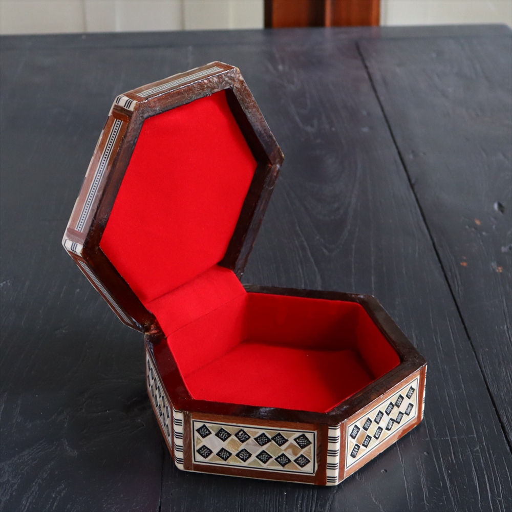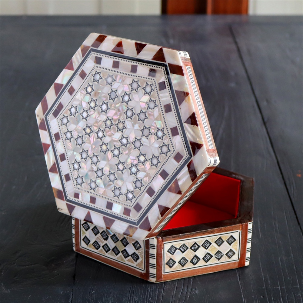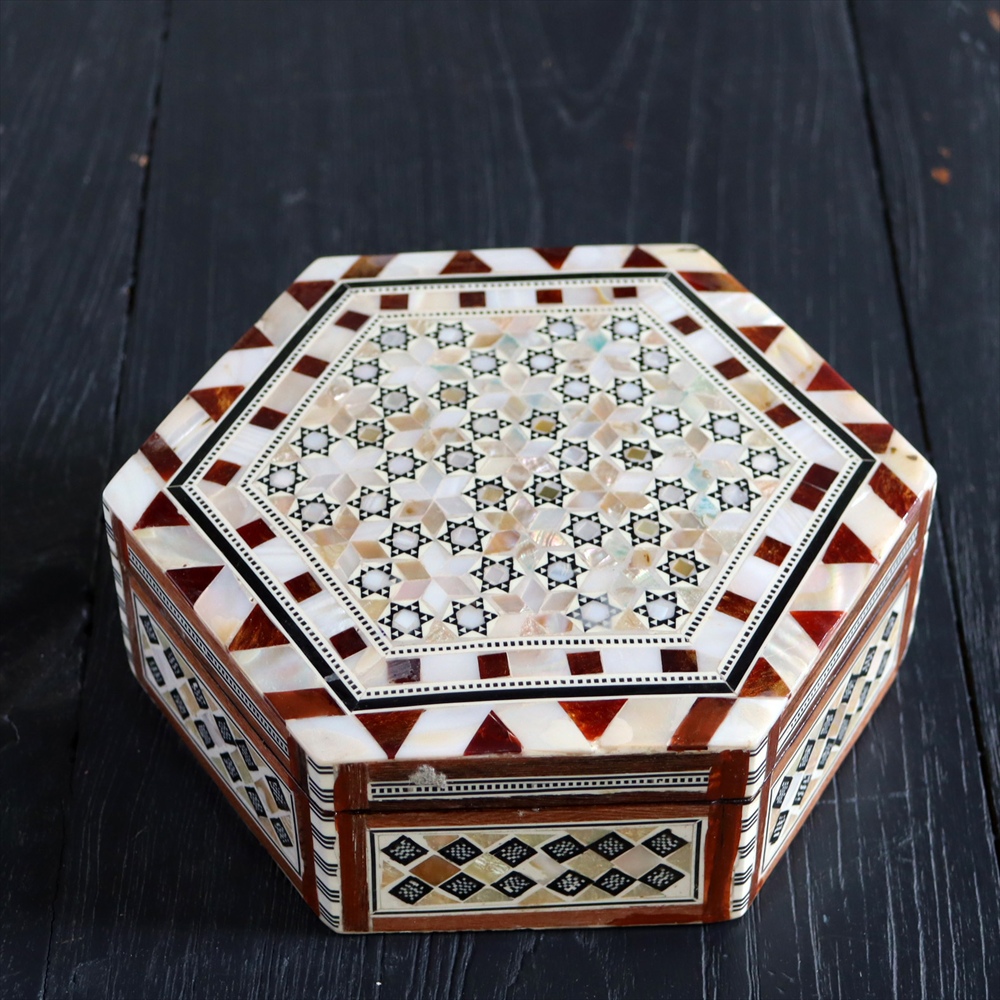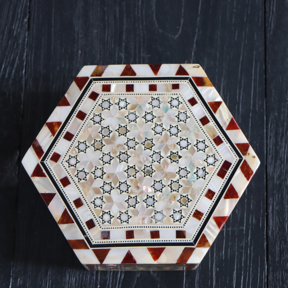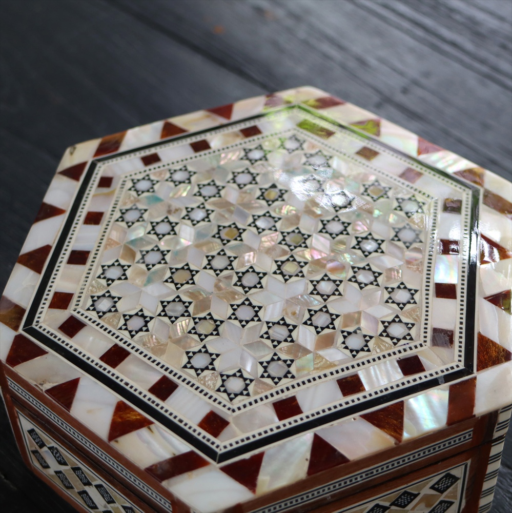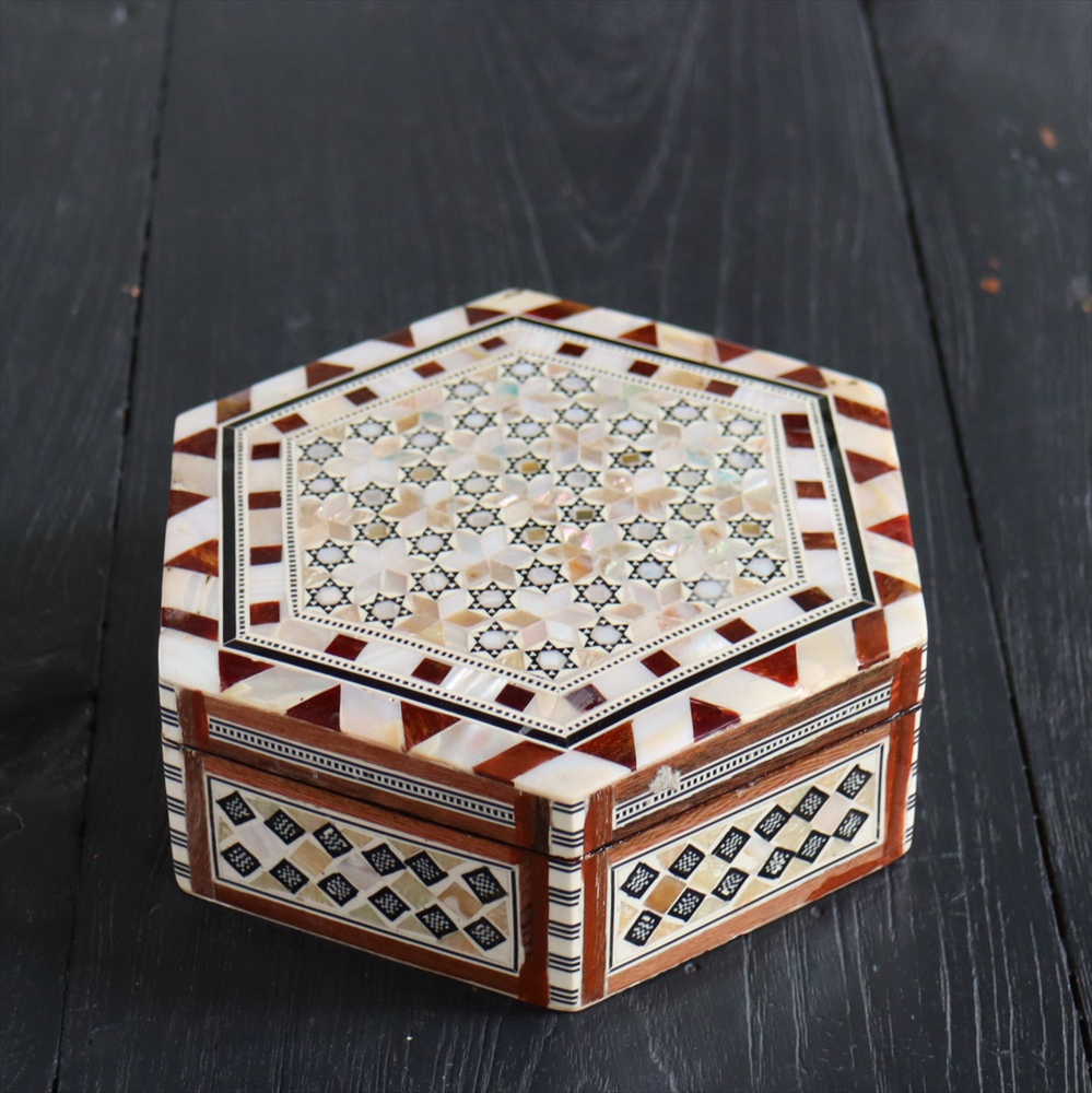 オスマン帝国時代にトルコ南部やシリアから伝えられた伝統工芸品の螺鈿細工。現在はカイロで作られ、中東エリアの広い地域に装飾品として輸出されています。真珠母貝(主にアコヤガイ)の貝殻の内側の真珠質をはめ込んだ煌めく宝石箱です。