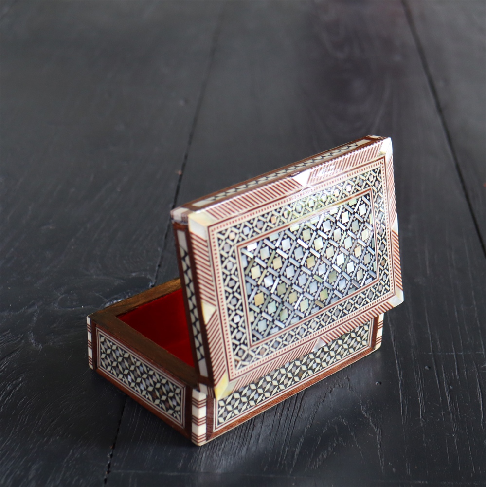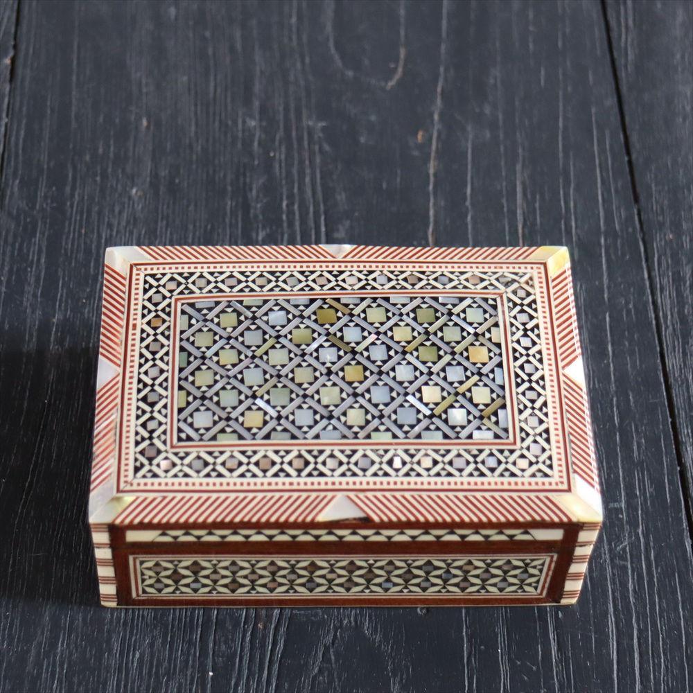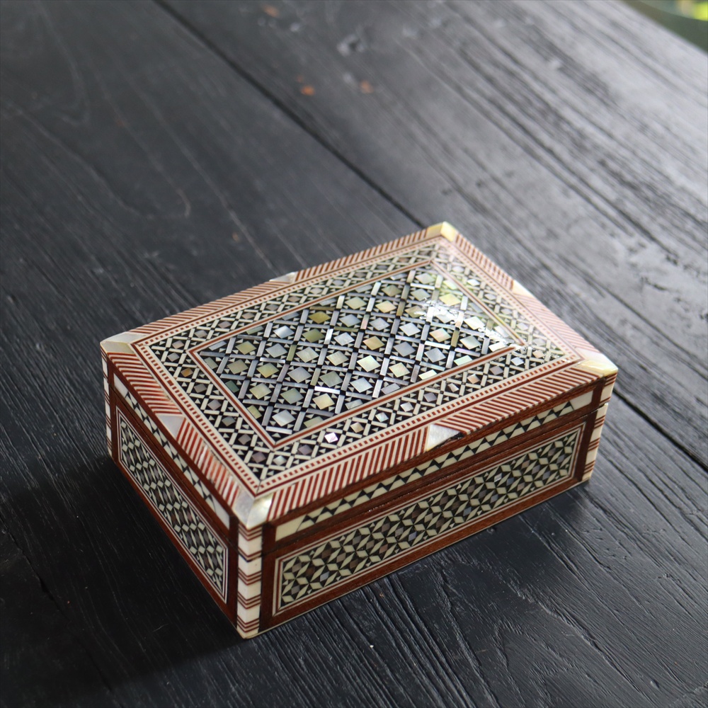 オスマン帝国時代にトルコ南部やシリアから伝えられた伝統工芸品の螺鈿細工。現在はカイロで作られ、中東エリアの広い地域に装飾品として輸出されています。真珠母貝(主にアコヤガイ)の貝殻の内側の真珠質をはめ込んだ煌めく宝石箱です。
