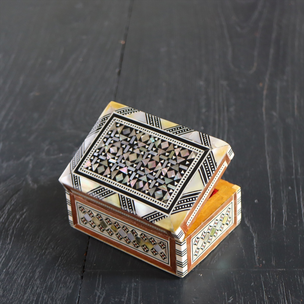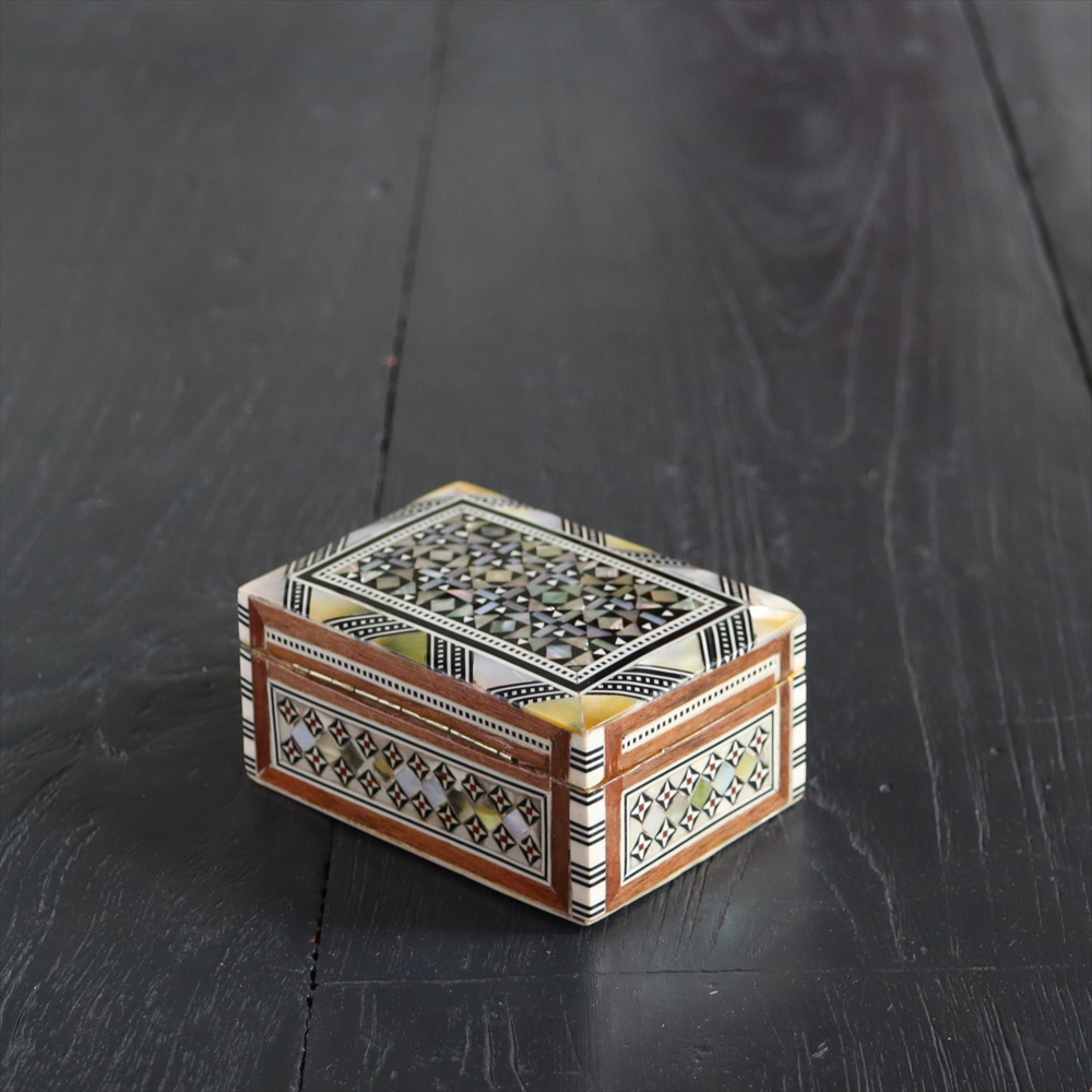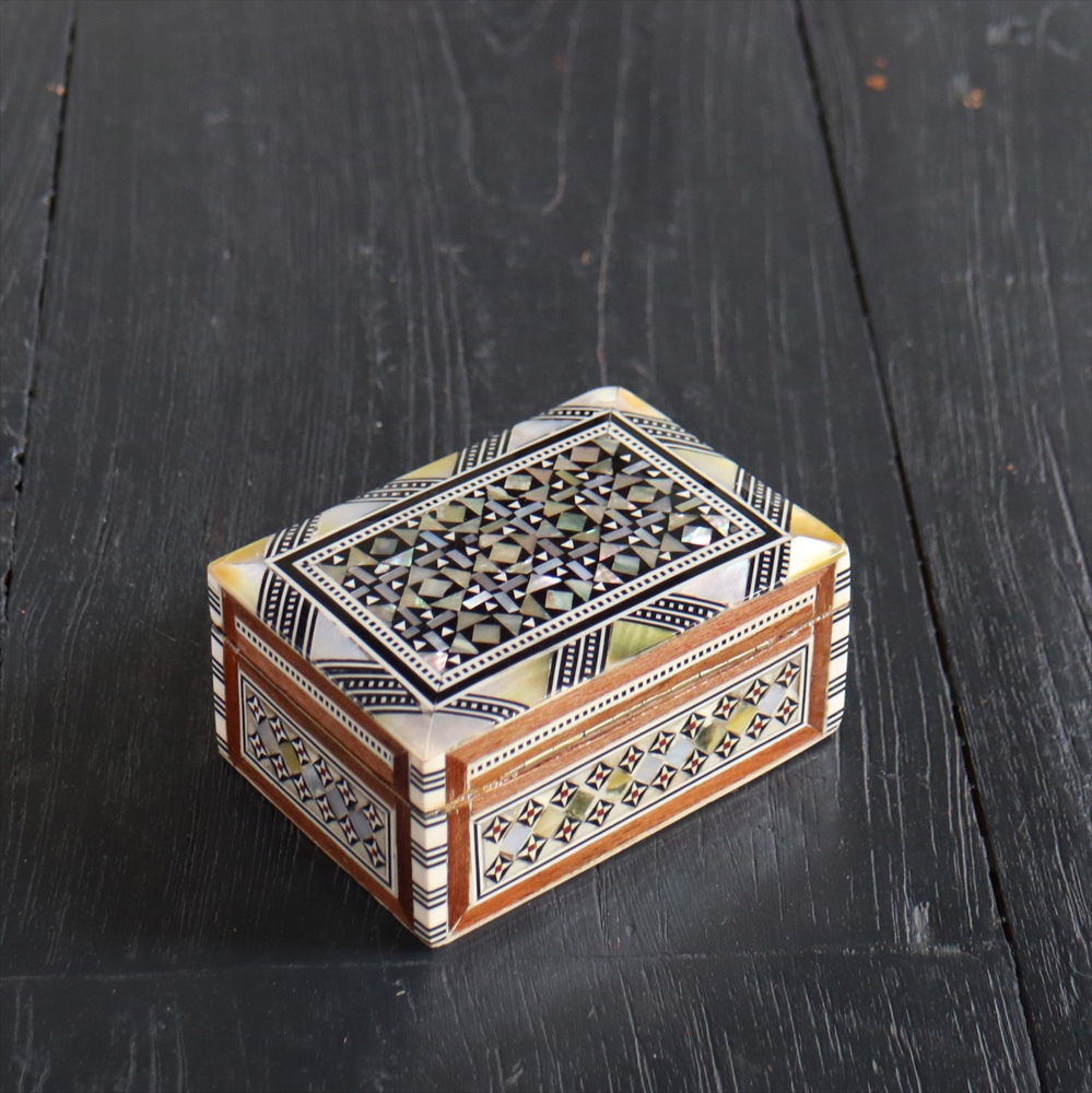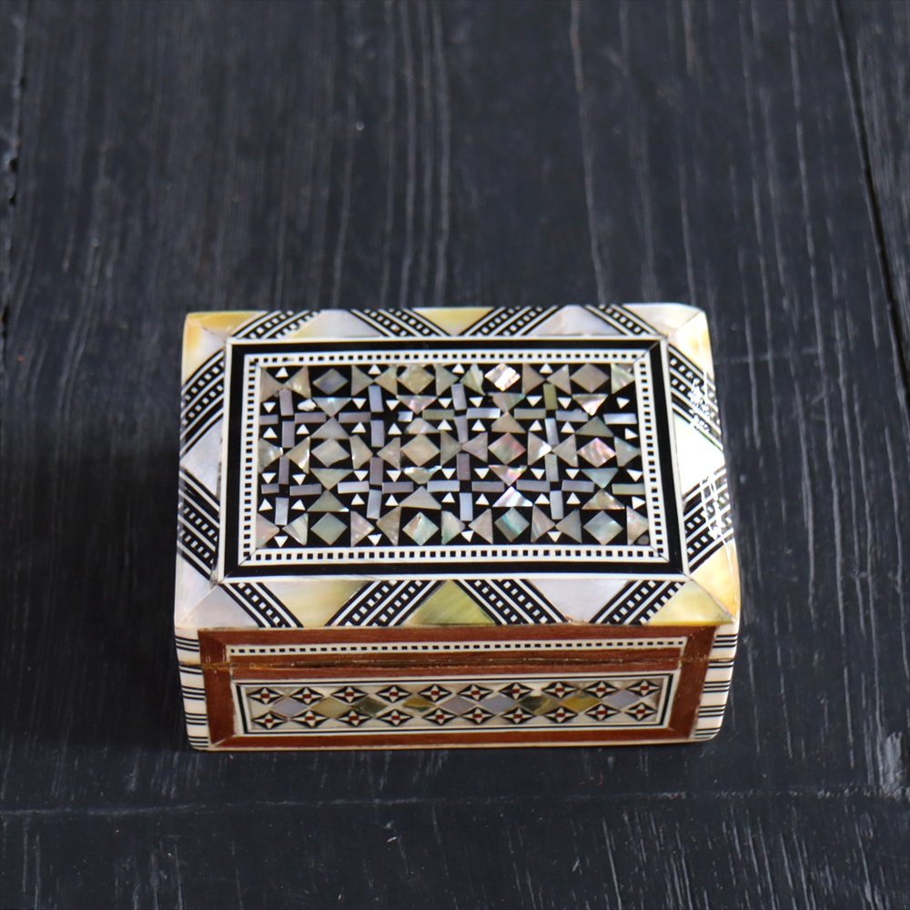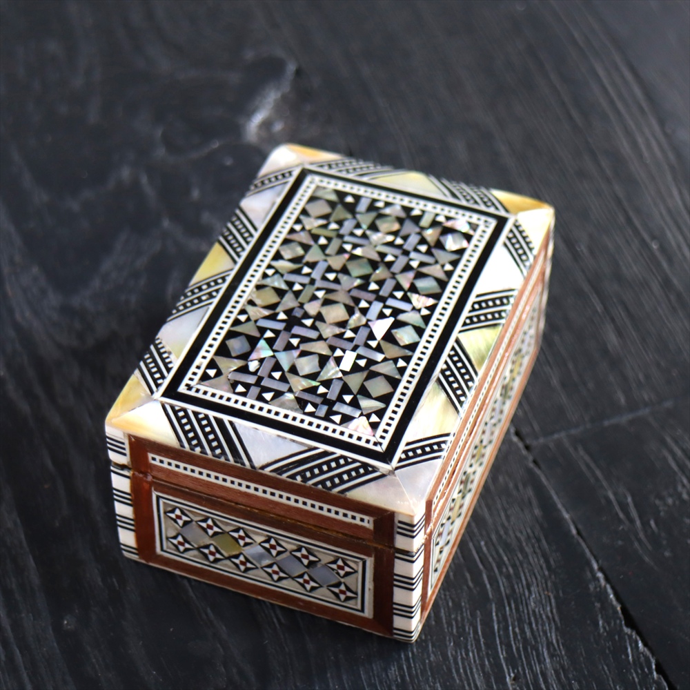 オスマン帝国時代にトルコ南部やシリアから伝えられた伝統工芸品の螺鈿細工。現在はカイロで作られ、中東エリアの広い地域に装飾品として輸出されています。真珠母貝(主にアコヤガイ)の貝殻の内側の真珠質をはめ込んだ煌めく宝石箱です。