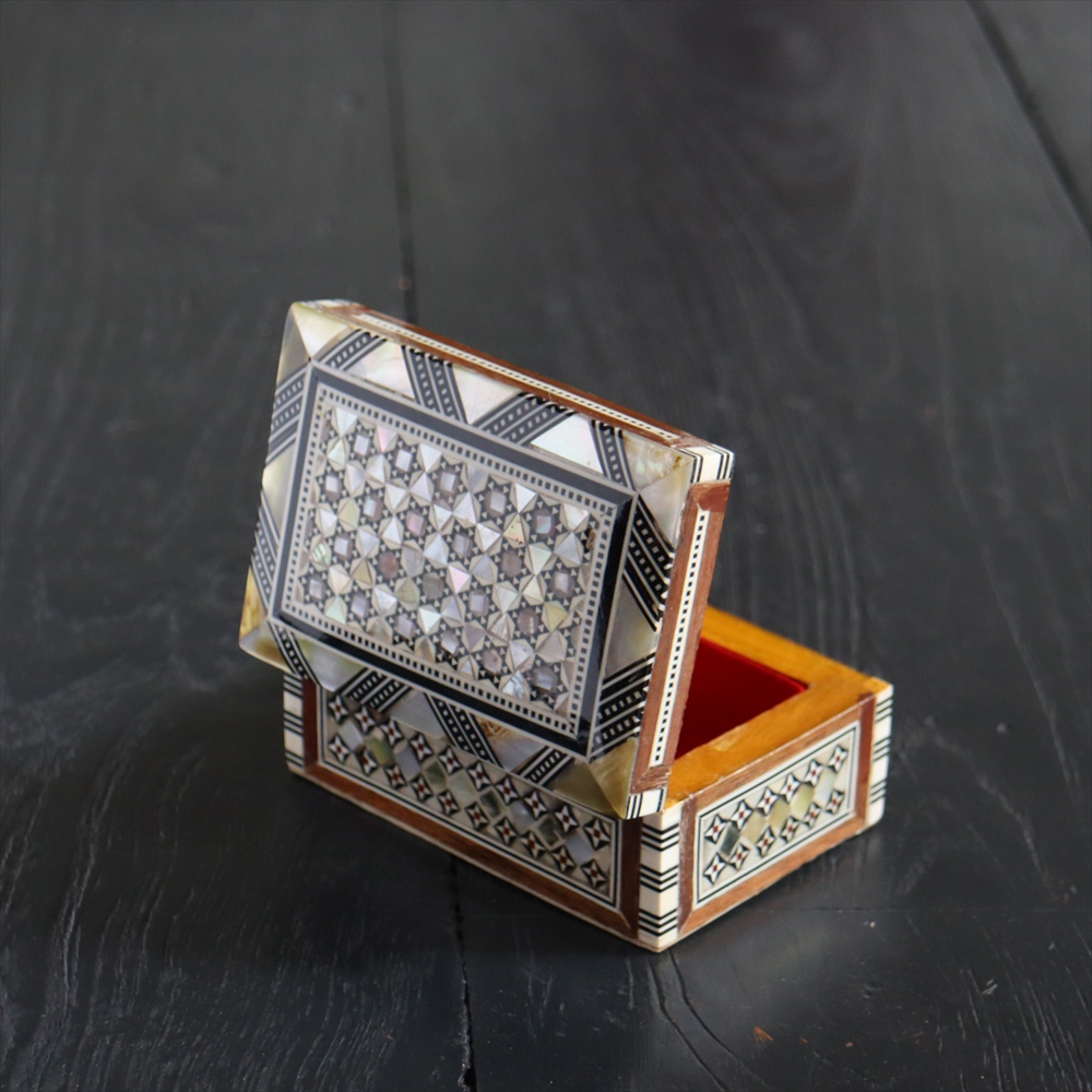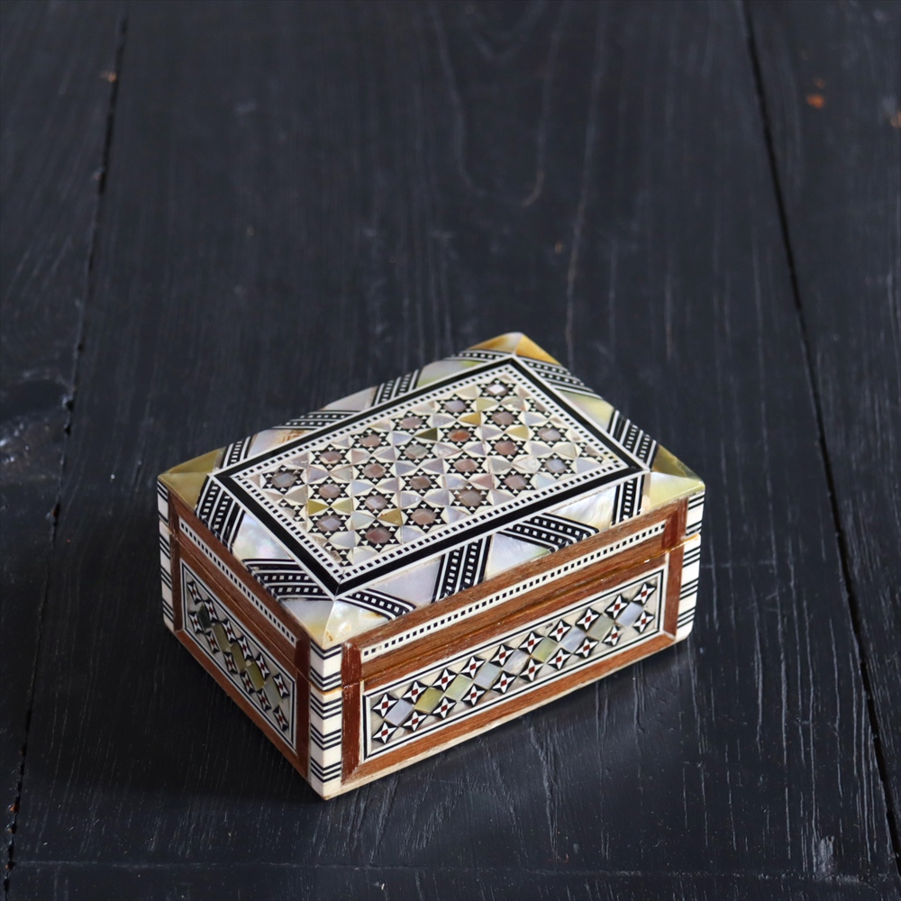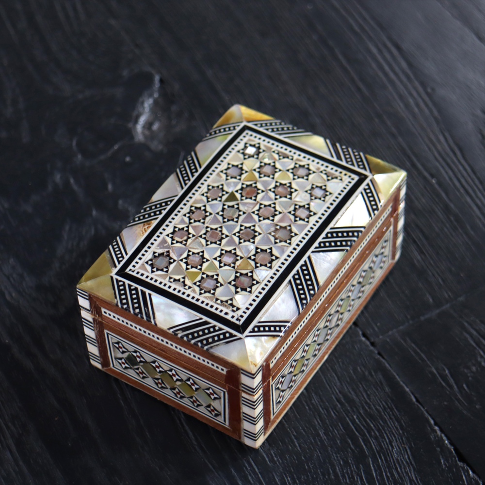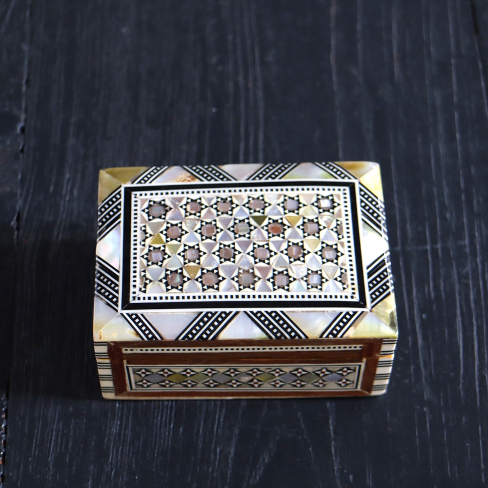 オスマン帝国時代にトルコ南部やシリアから伝えられた伝統工芸品の螺鈿細工。現在はカイロで作られ、中東エリアの広い地域に装飾品として輸出されています。真珠母貝(主にアコヤガイ)の貝殻の内側の真珠質をはめ込んだ煌めく宝石箱です。