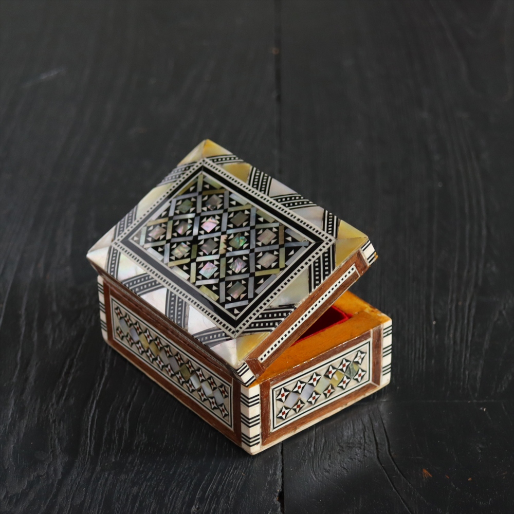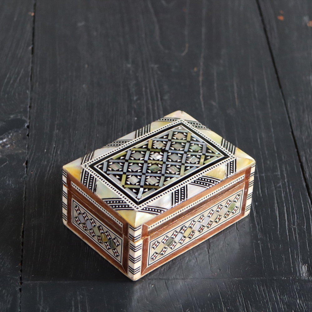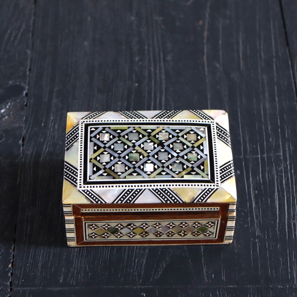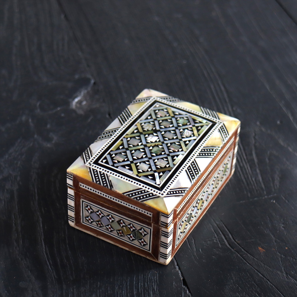 オスマン帝国時代にトルコ南部やシリアから伝えられた伝統工芸品の螺鈿細工。現在はカイロで作られ、中東エリアの広い地域に装飾品として輸出されています。真珠母貝(主にアコヤガイ)の貝殻の内側の真珠質をはめ込んだ煌めく宝石箱です。