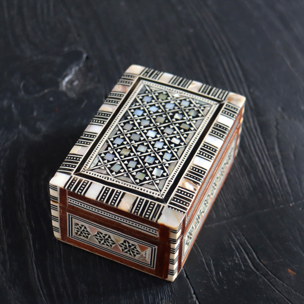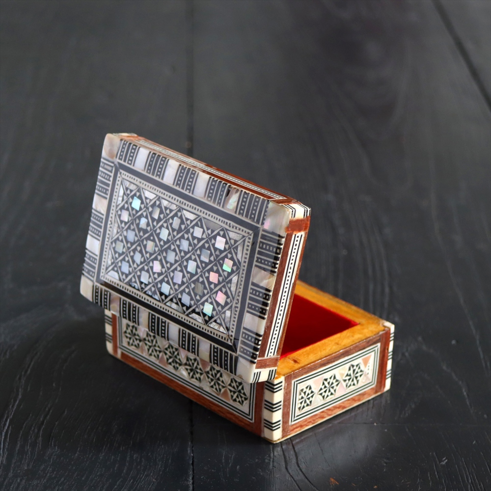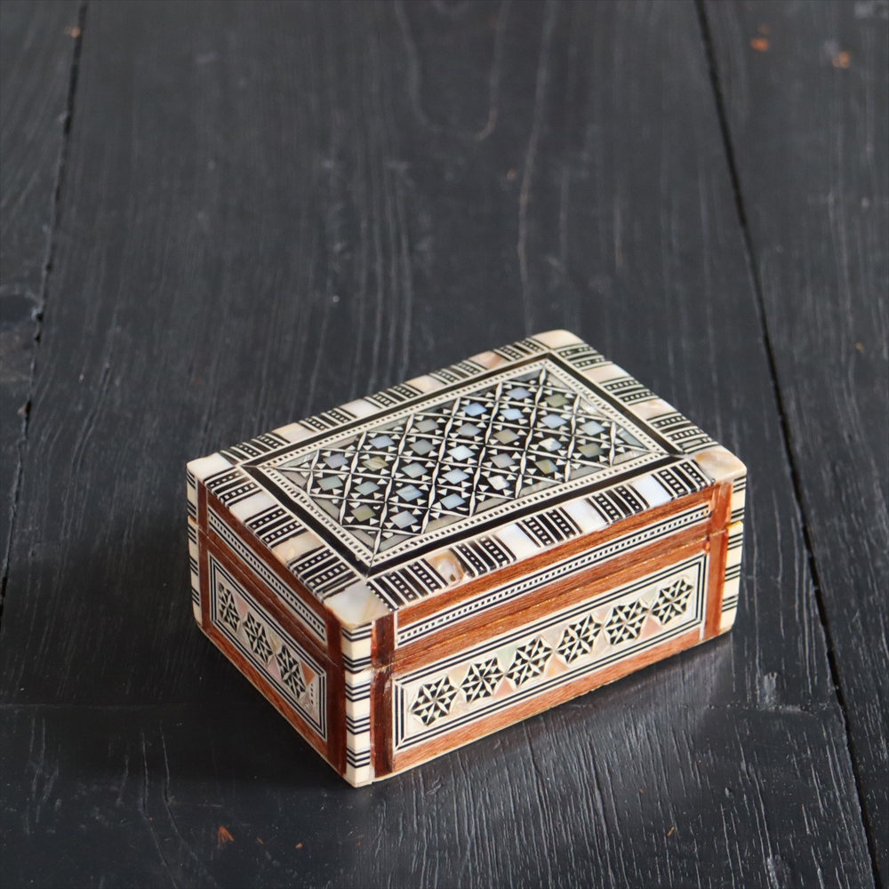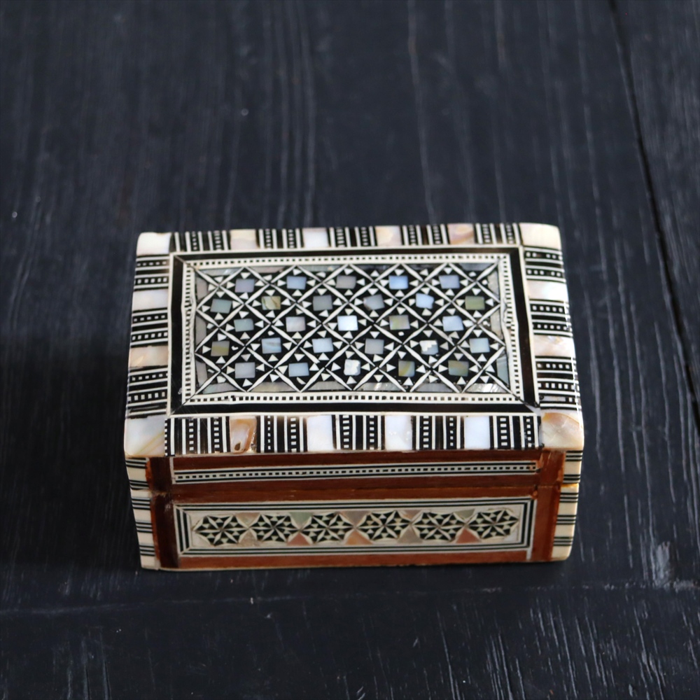 オスマン帝国時代にトルコ南部やシリアから伝えられた伝統工芸品の螺鈿細工。現在はカイロで作られ、中東エリアの広い地域に装飾品として輸出されています。真珠母貝(主にアコヤガイ)の貝殻の内側の真珠質をはめ込んだ煌めく宝石箱です。