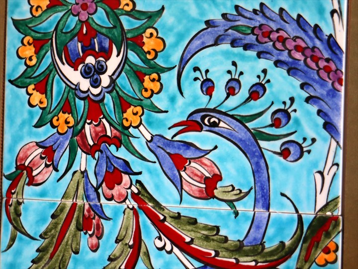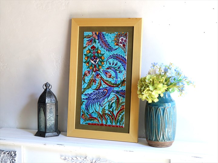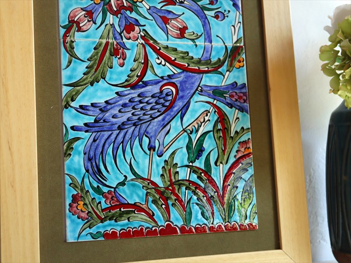 淡いブルーの孔雀と鮮やかなフラワーが際立つように描かれた一枚。独特のトルコスタイルが凝縮された繊細なデザインは、トルコの陶磁器産業の中心地、キュタフヤ地方で一枚一枚絵付けされたタイルです。