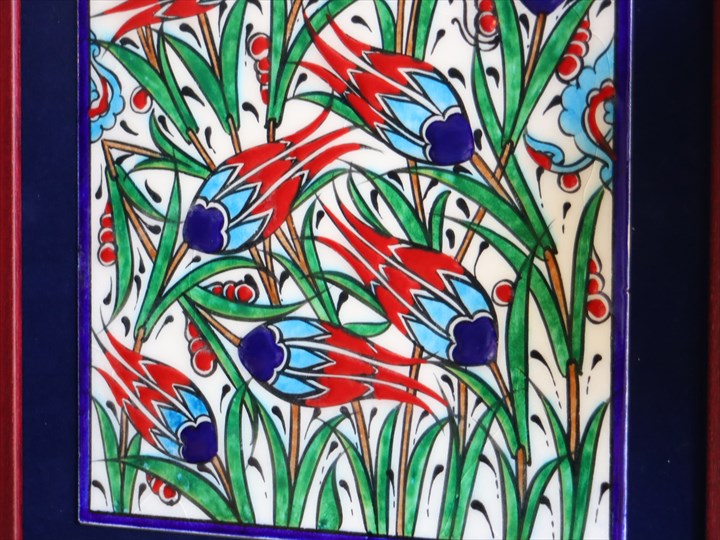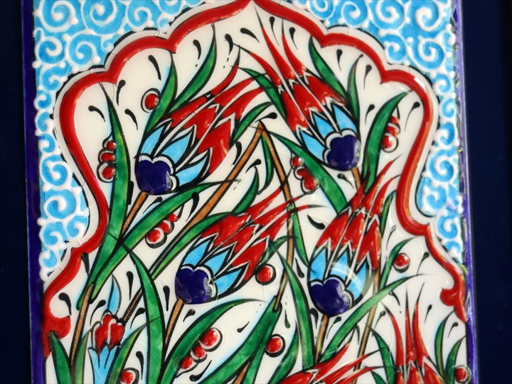 トルコの陶磁器産業の中心地キュタフヤ地方で、一枚一枚絵付けされたタイル。デザインのオリジナルは、16世紀・オスマントルコのトプカプ宮殿を飾るためにイズニックで作られたタイルに描かれた、華やかなチューリップ。