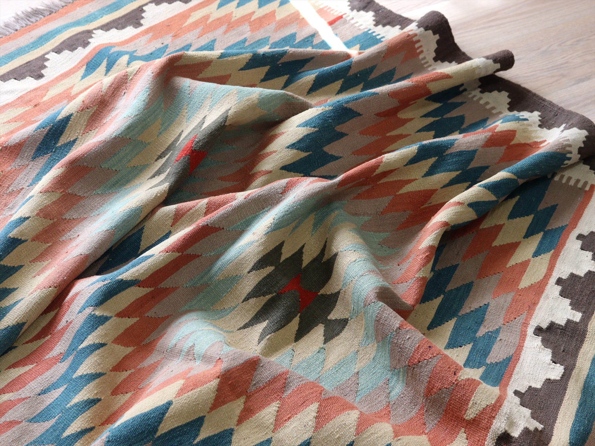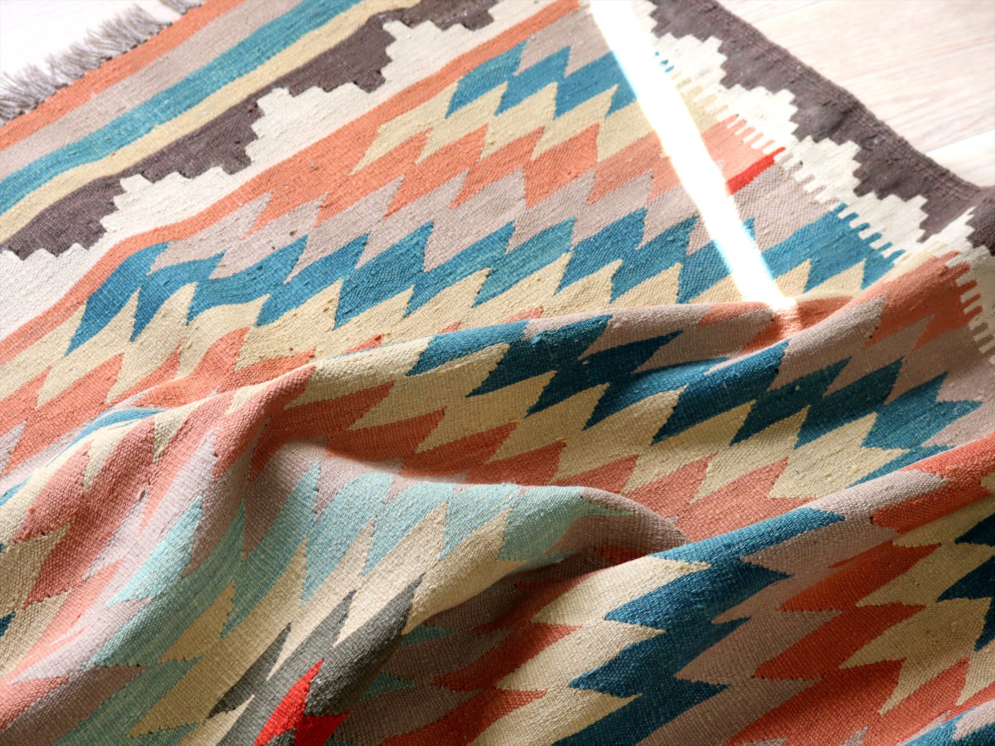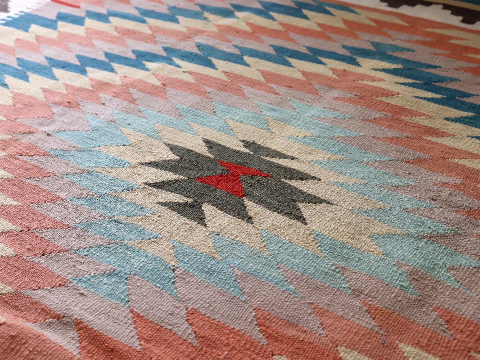 平織りのキリムとしては、がっしりとした厚みのある素朴な織りです。表面はややザラっとした手触りです。
