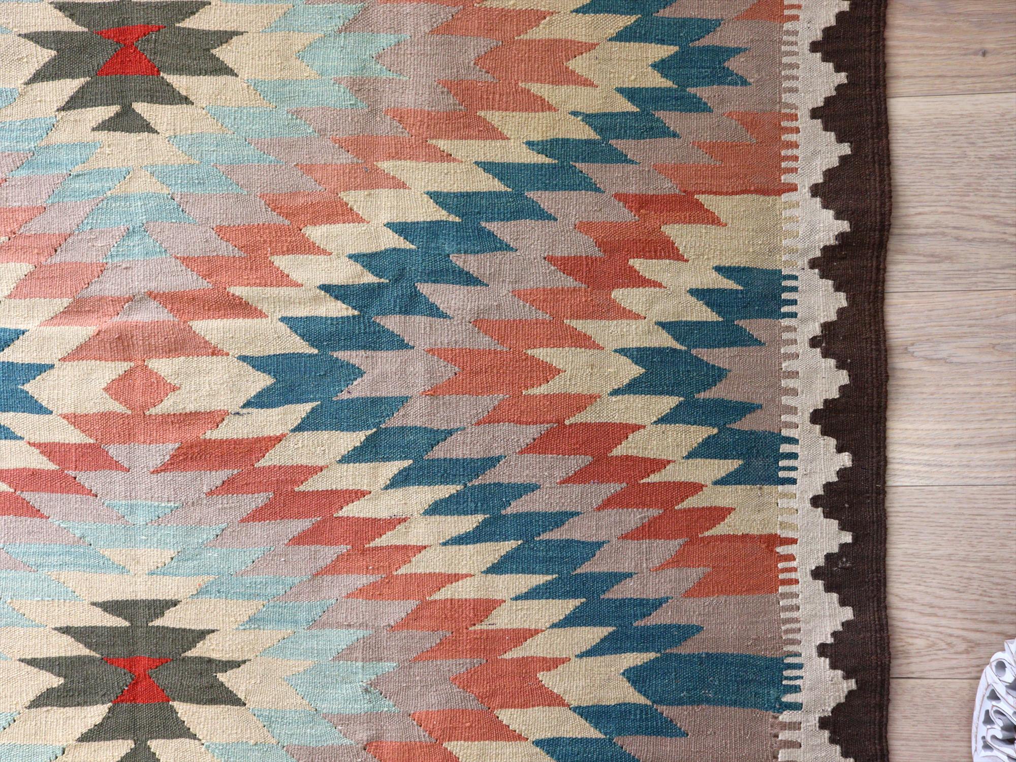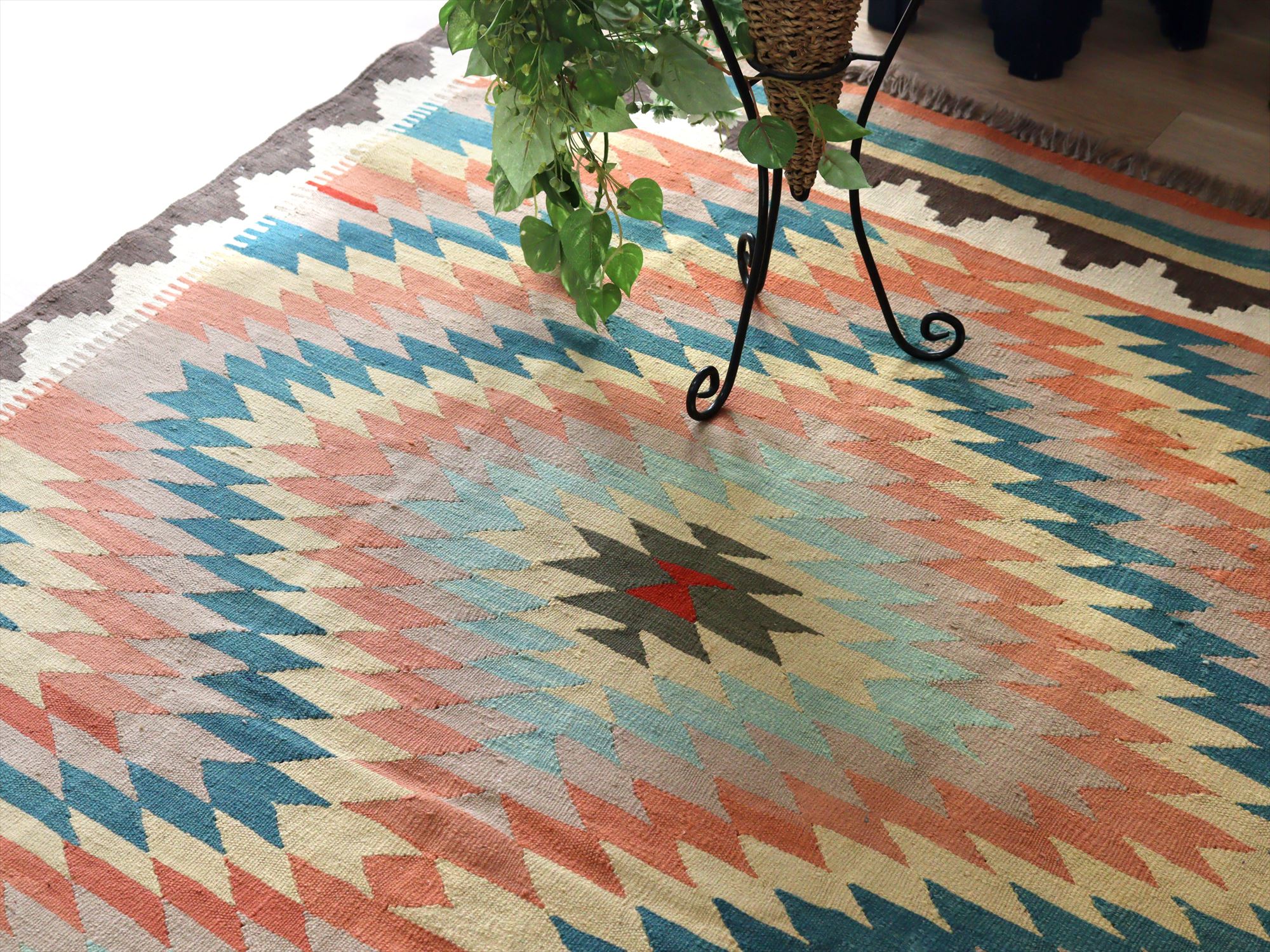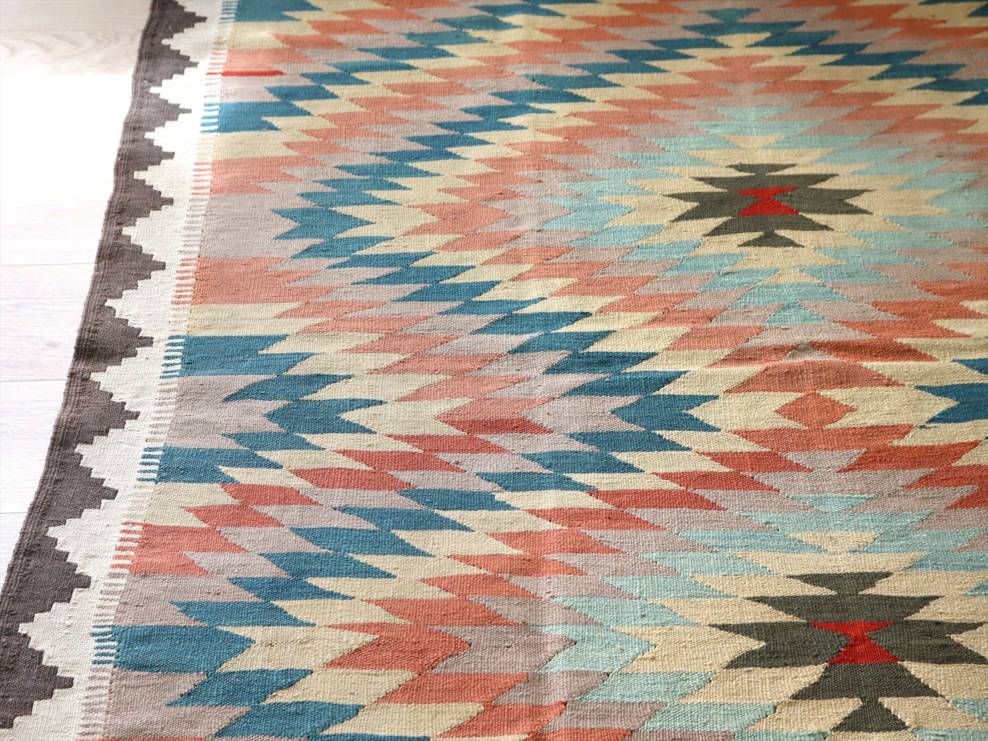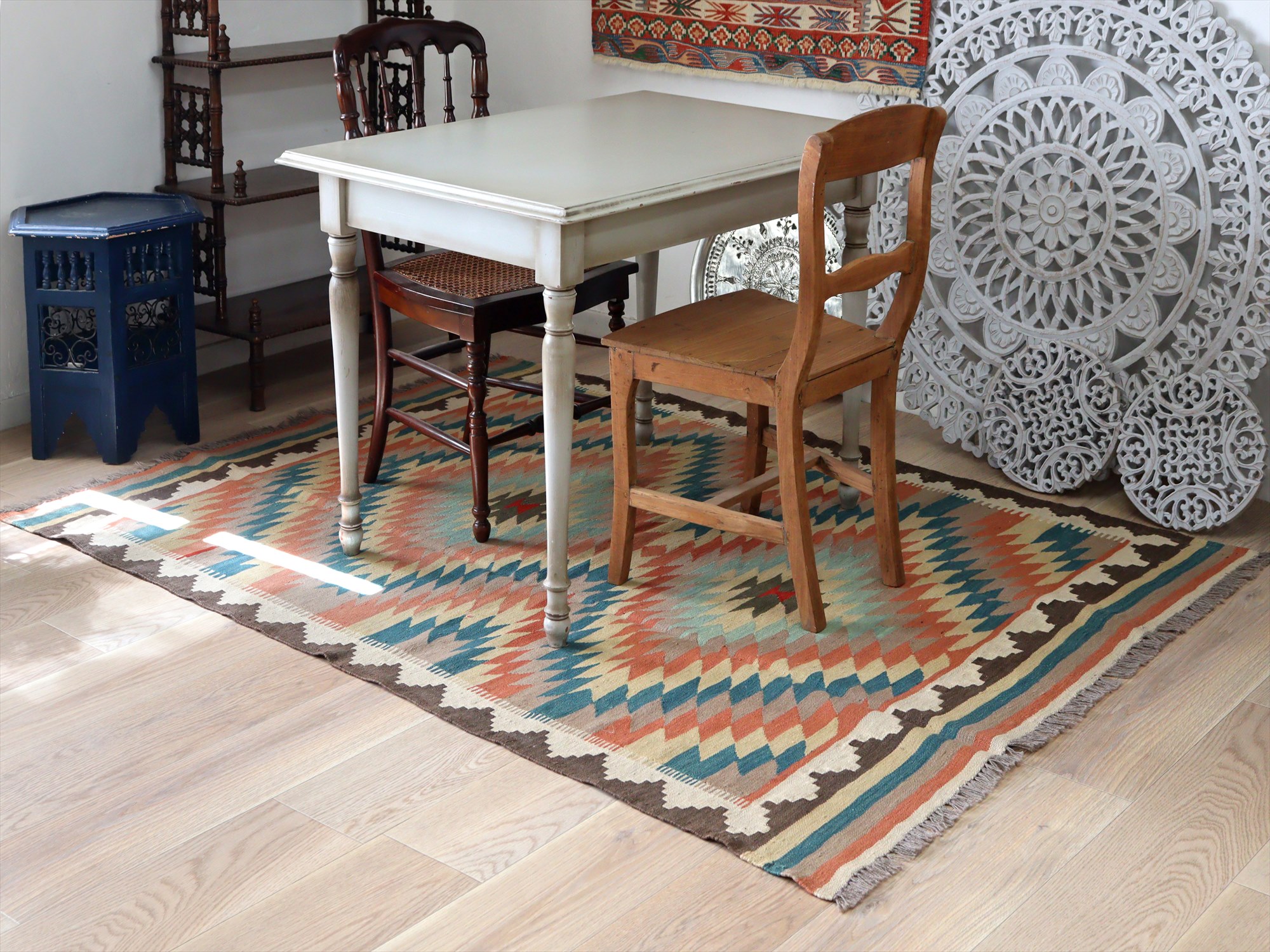平織りのキリムとしては、がっしりとした厚みのある素朴な織りです。表面はややザラっとした手触りです。