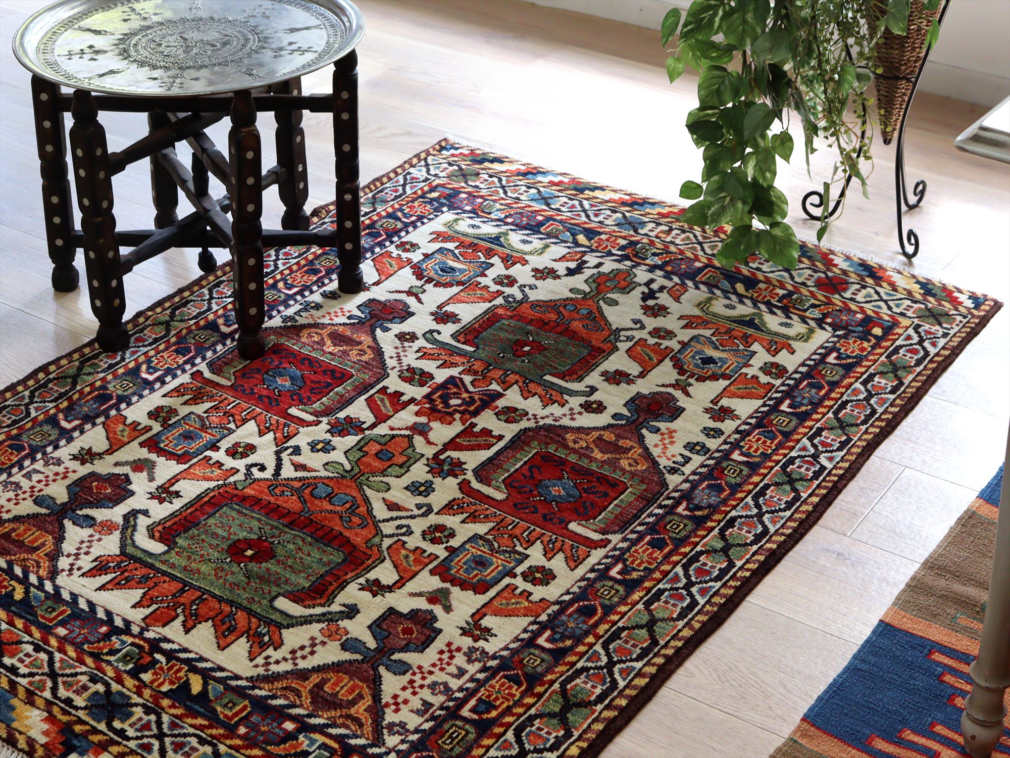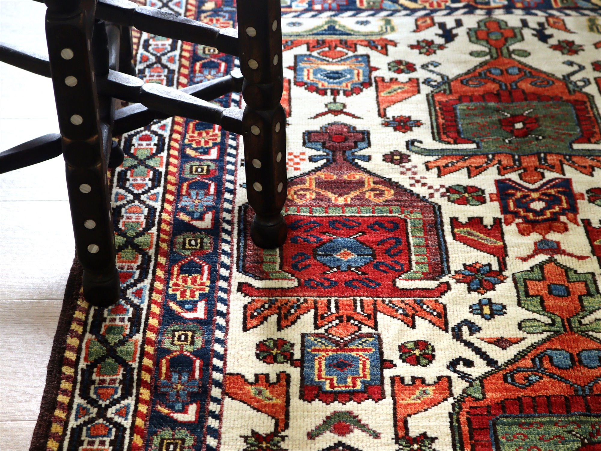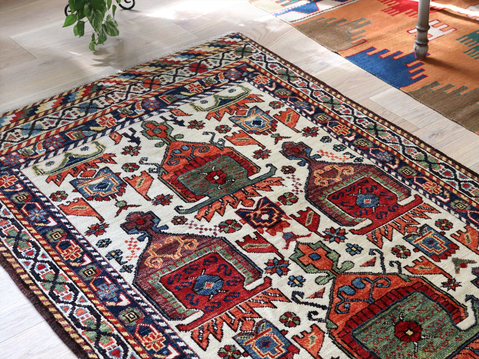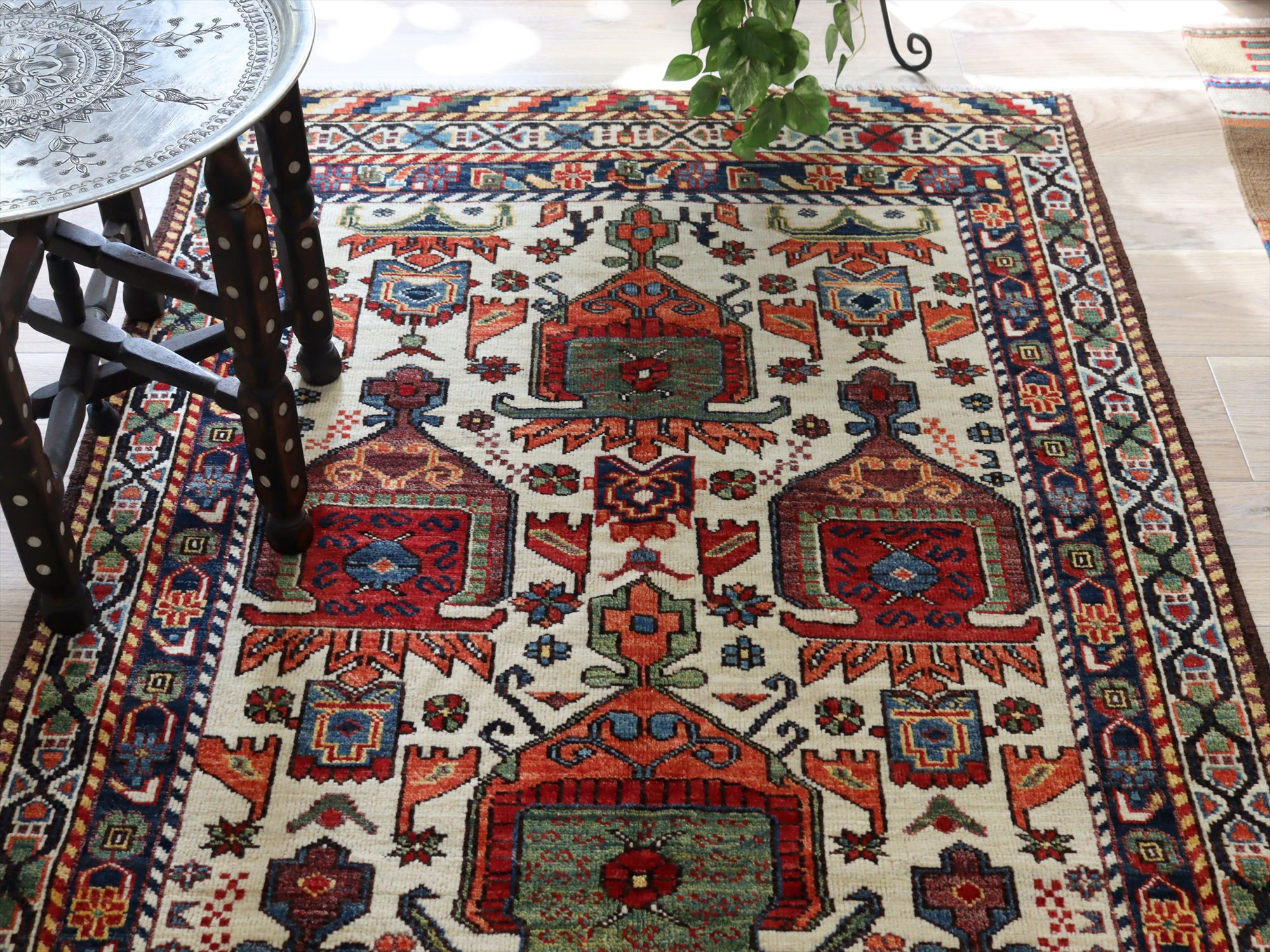 手織りラグ 小花と幾何学模様152×104cm トルコの手織り絨毯 ベージュ 草木染