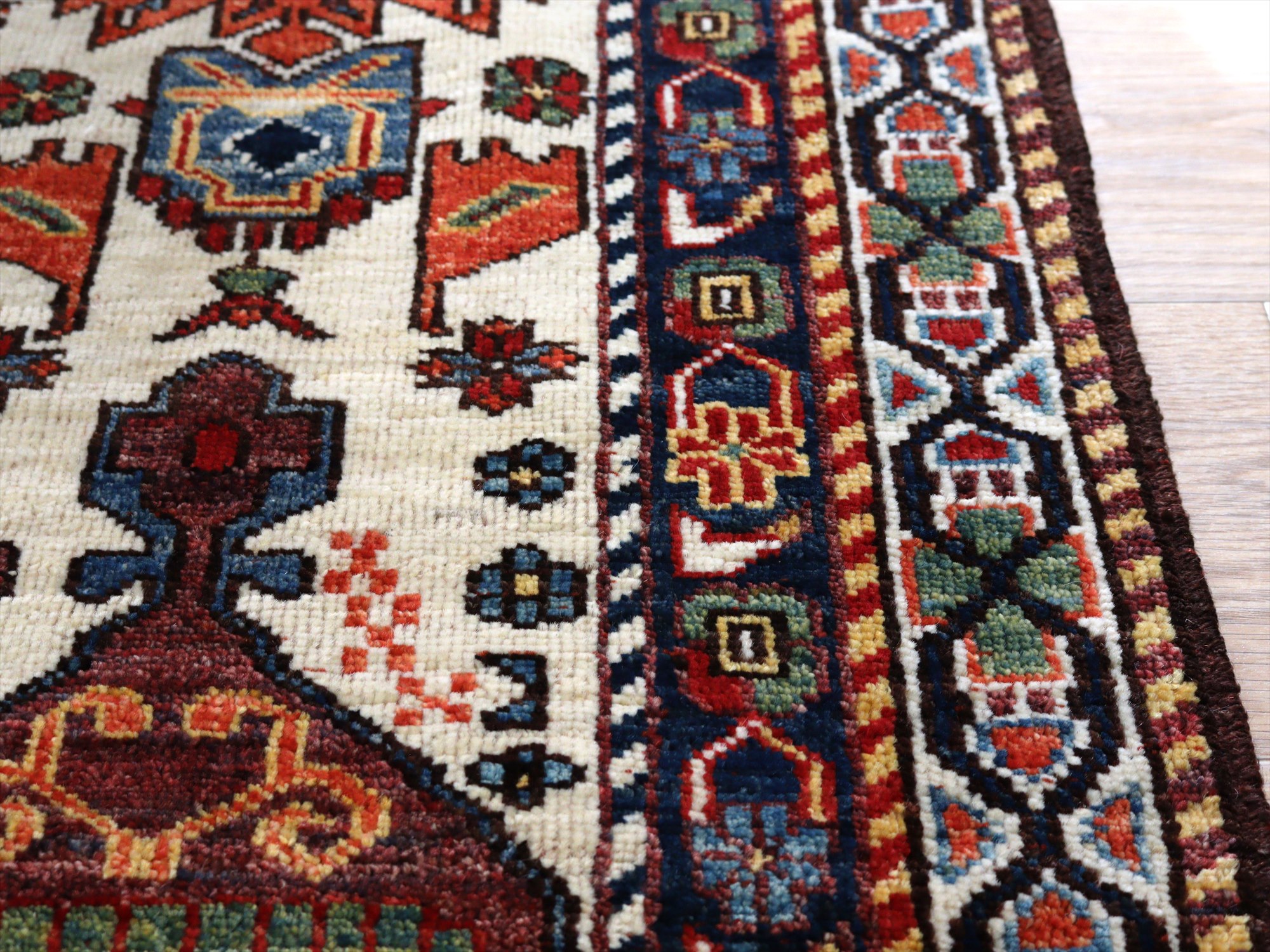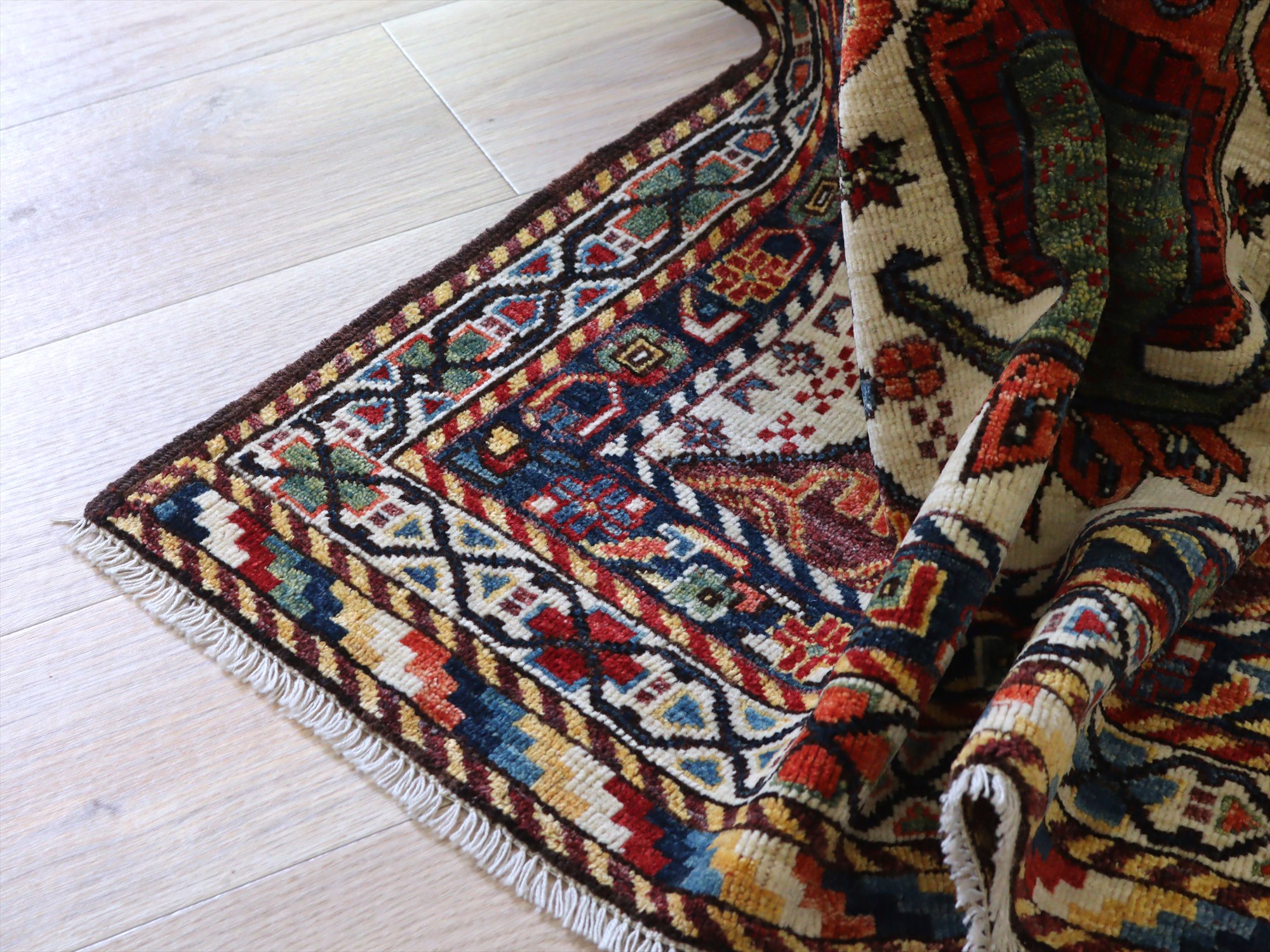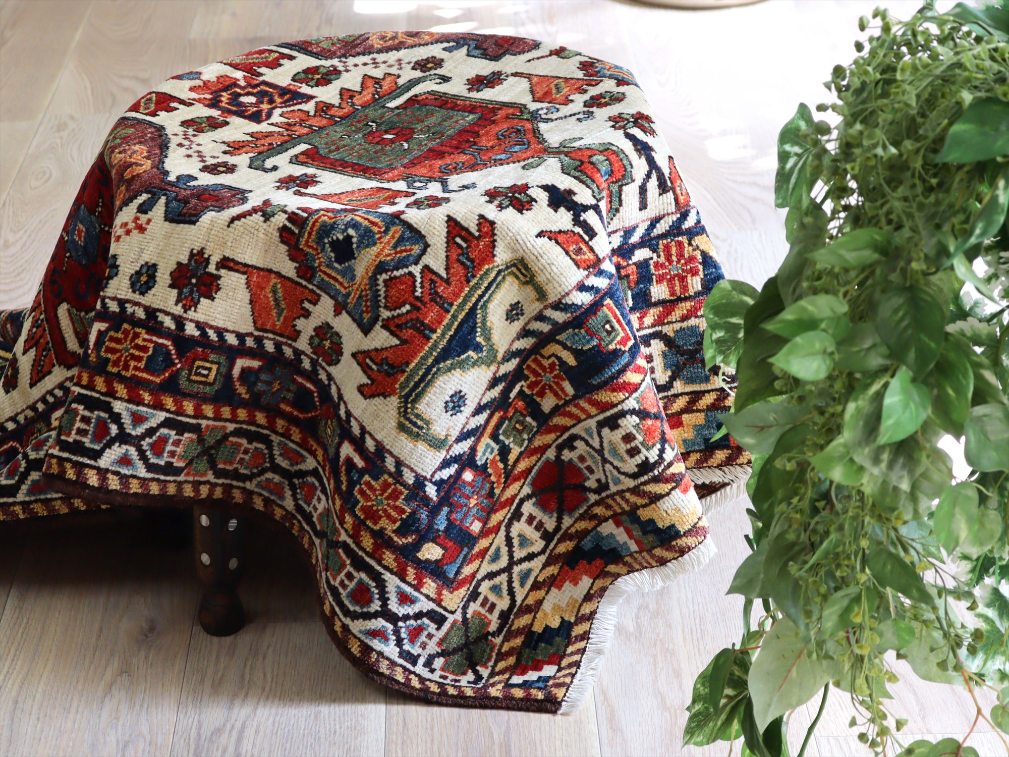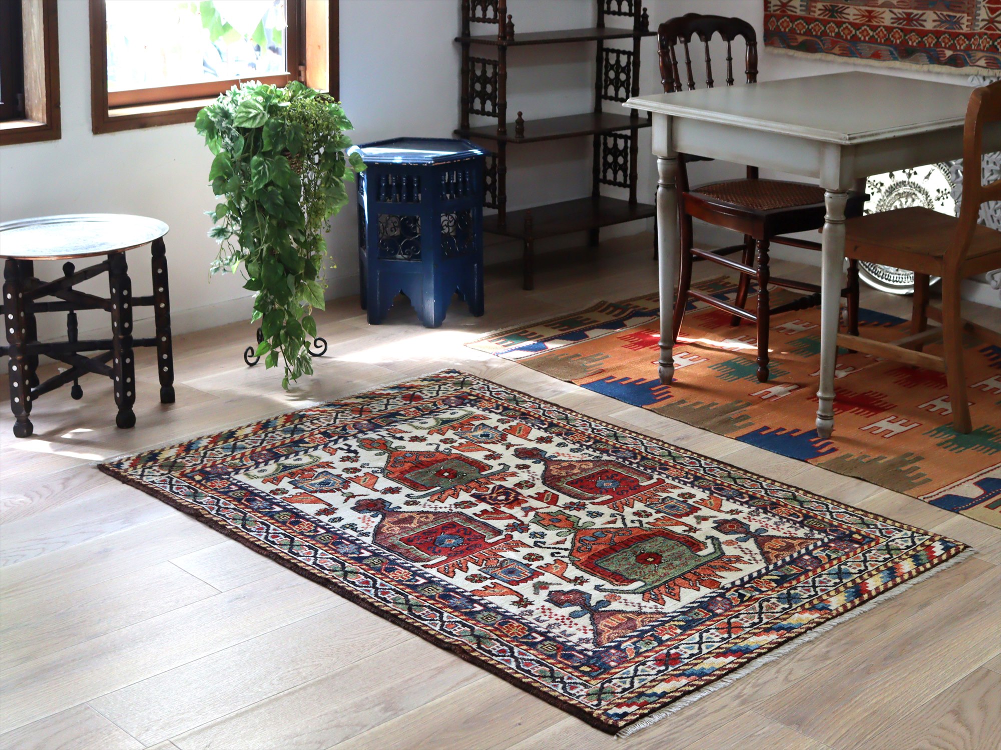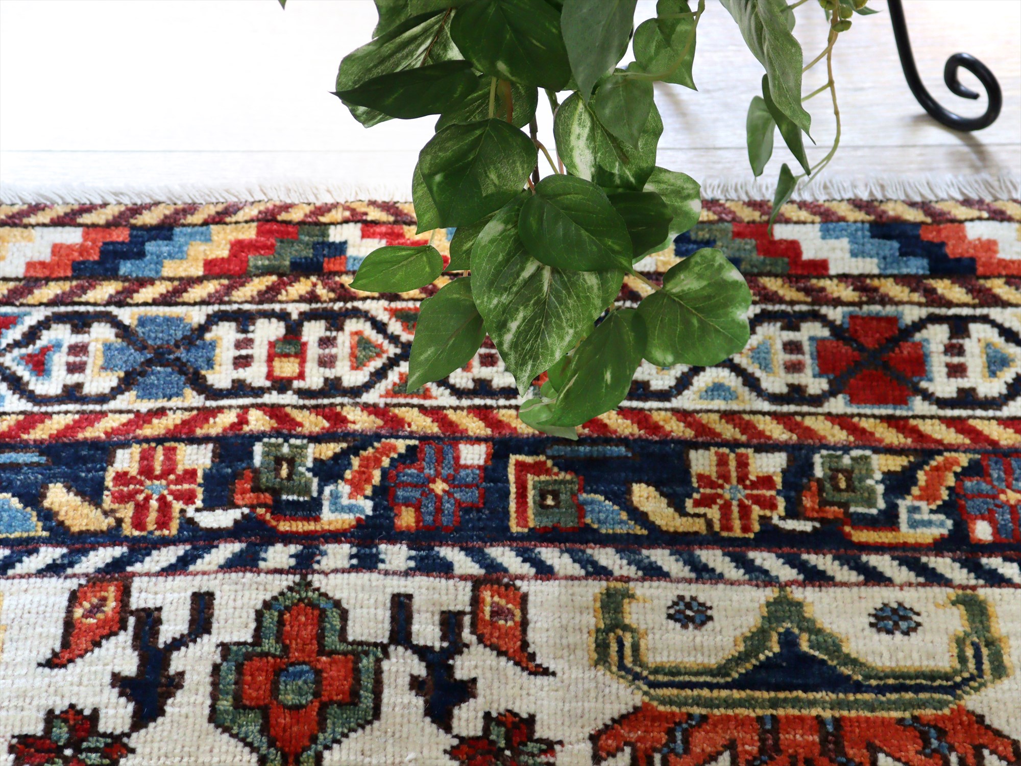 手織りラグ 小花と幾何学模様152×104cm トルコの手織り絨毯 ベージュ 草木染