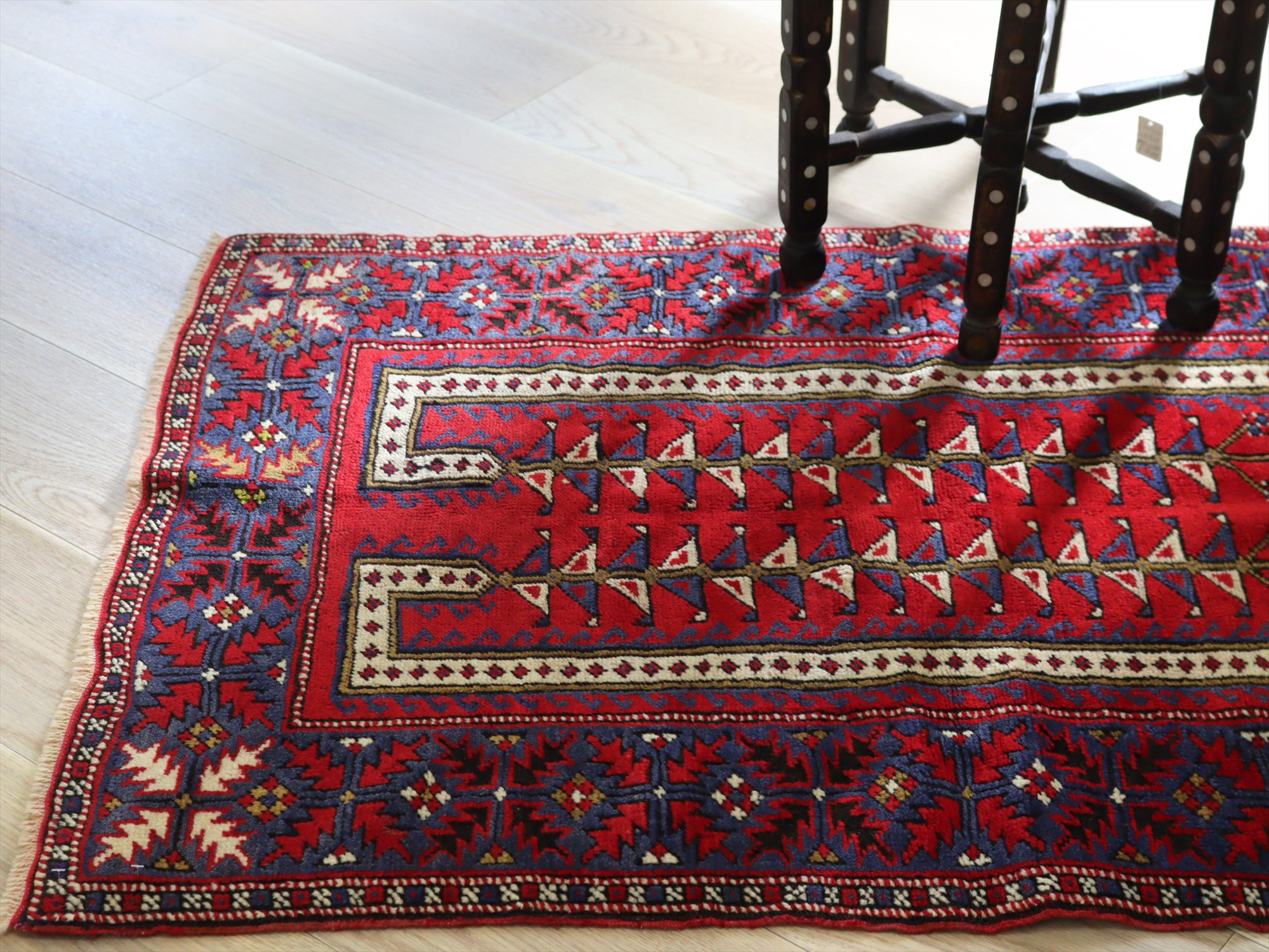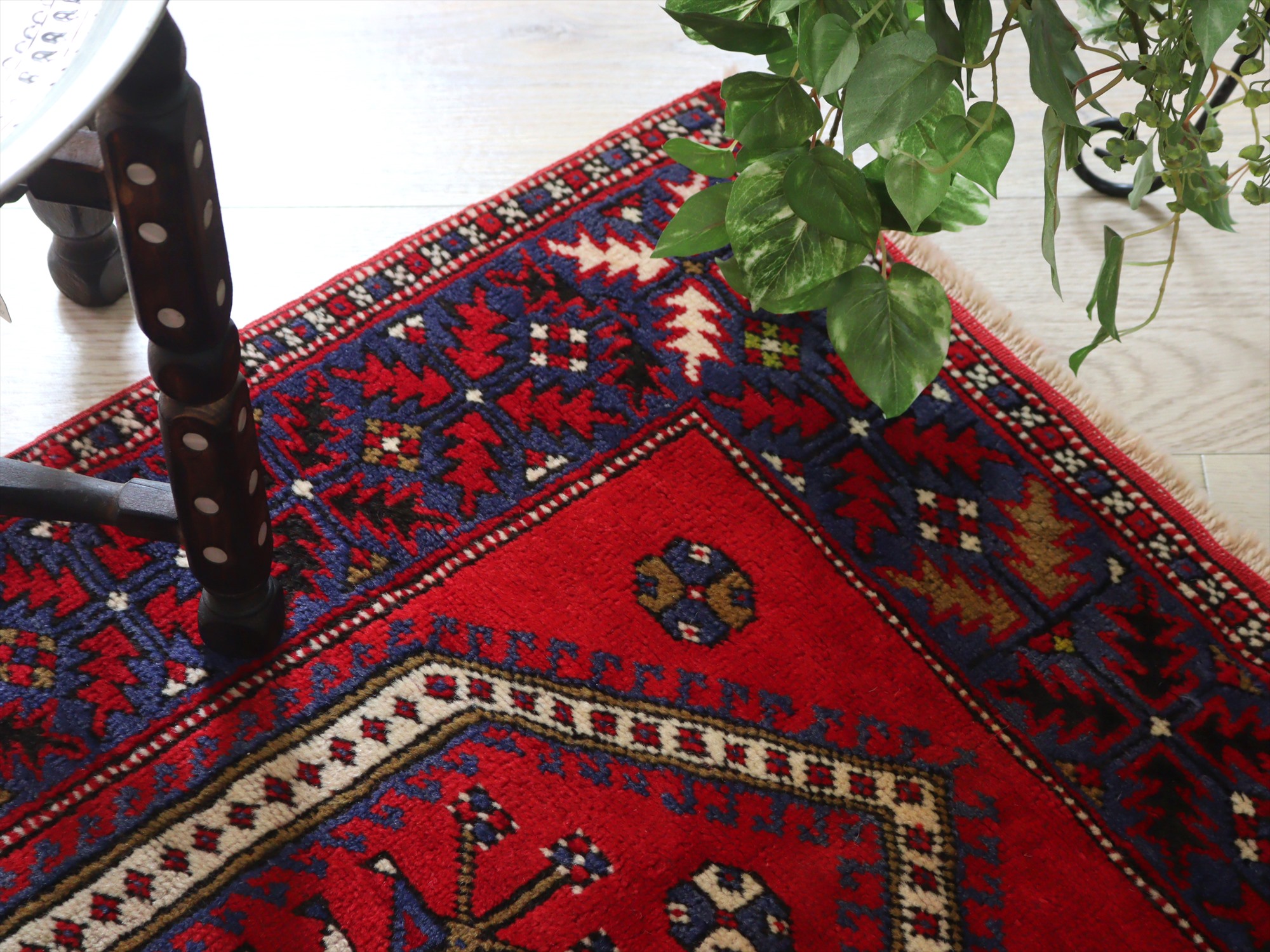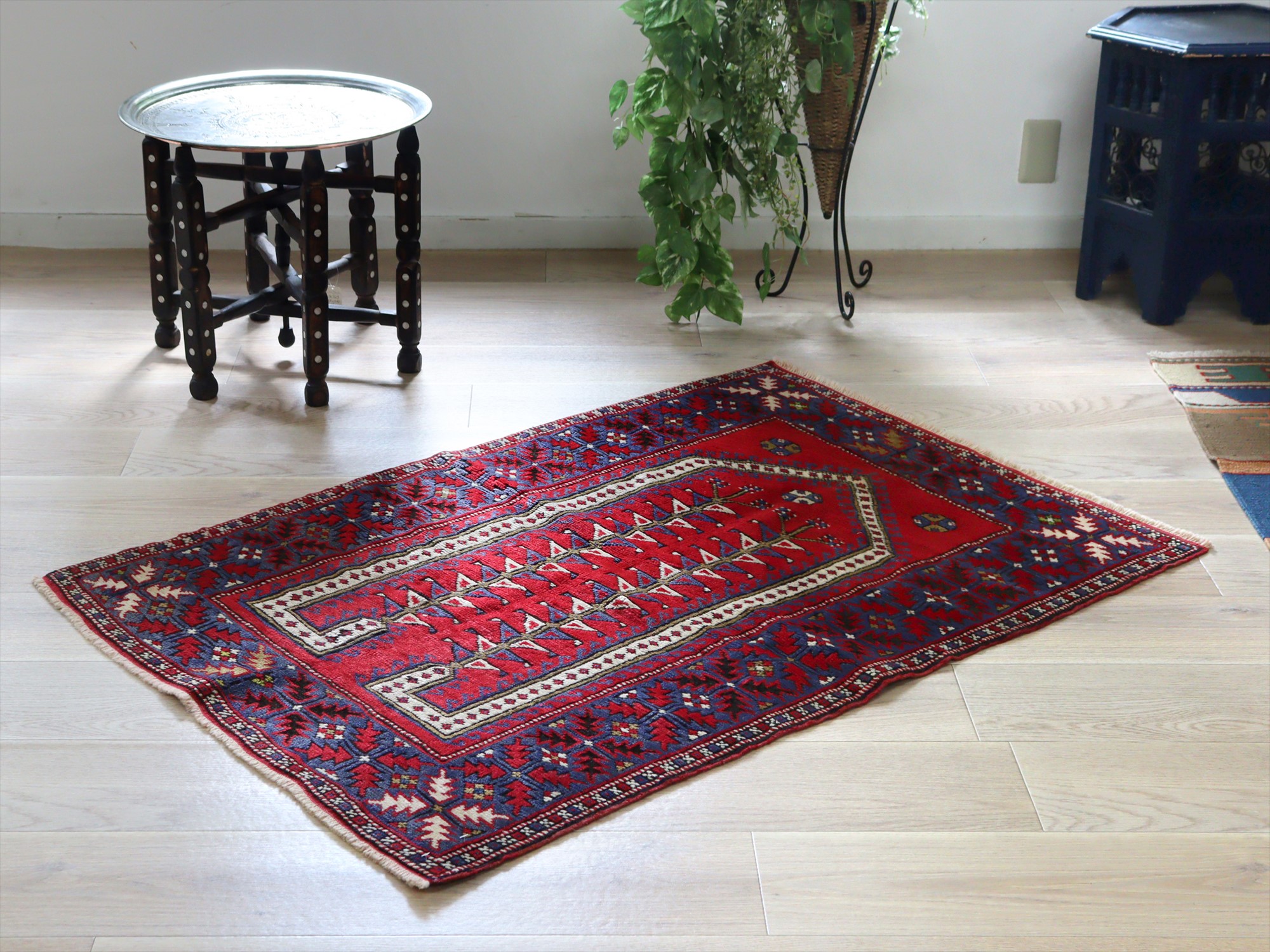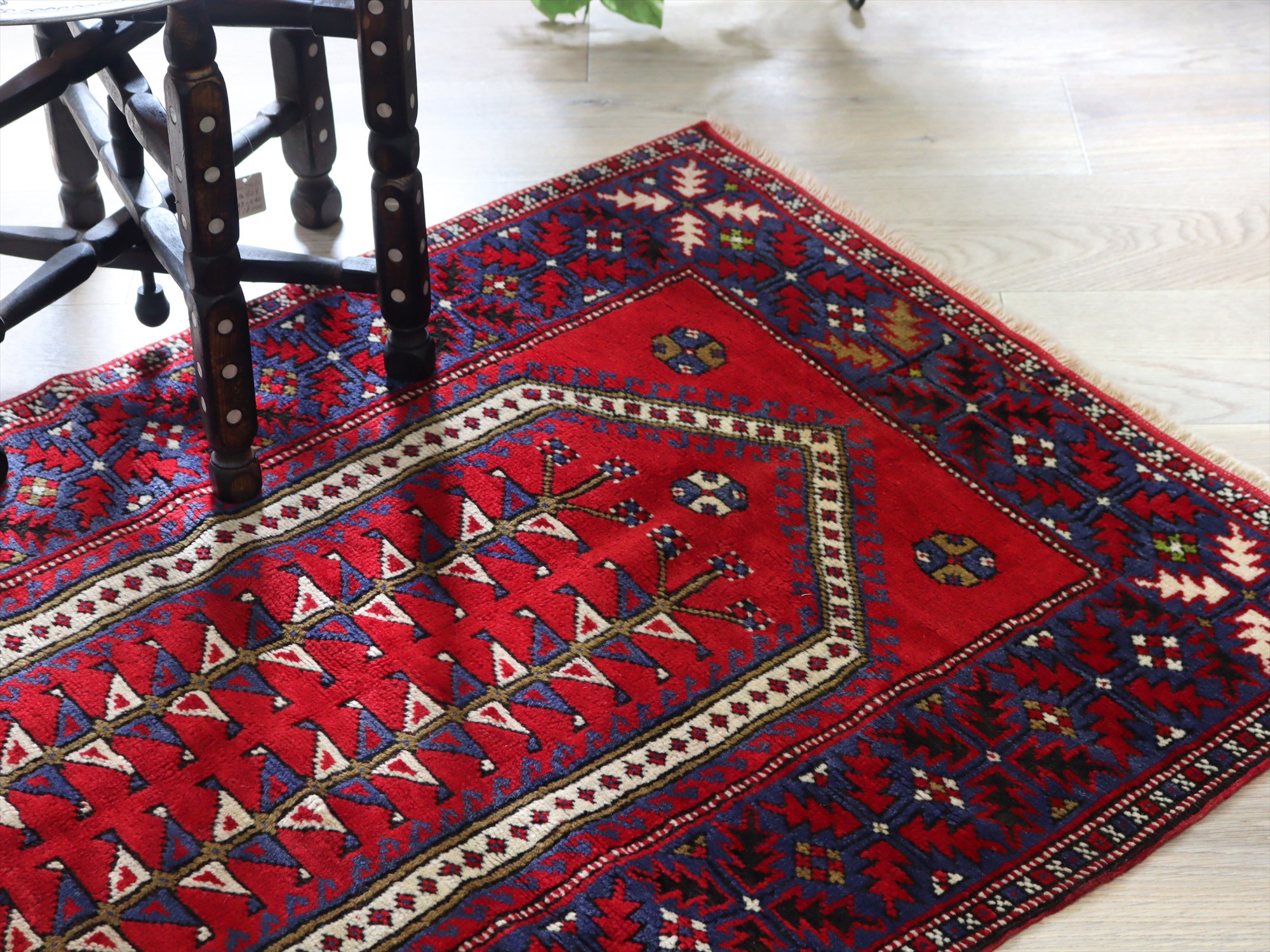 ミフラープと生命の樹 トライバルラグ129×89cm トルコの手織り絨毯 レッド&ネイビー