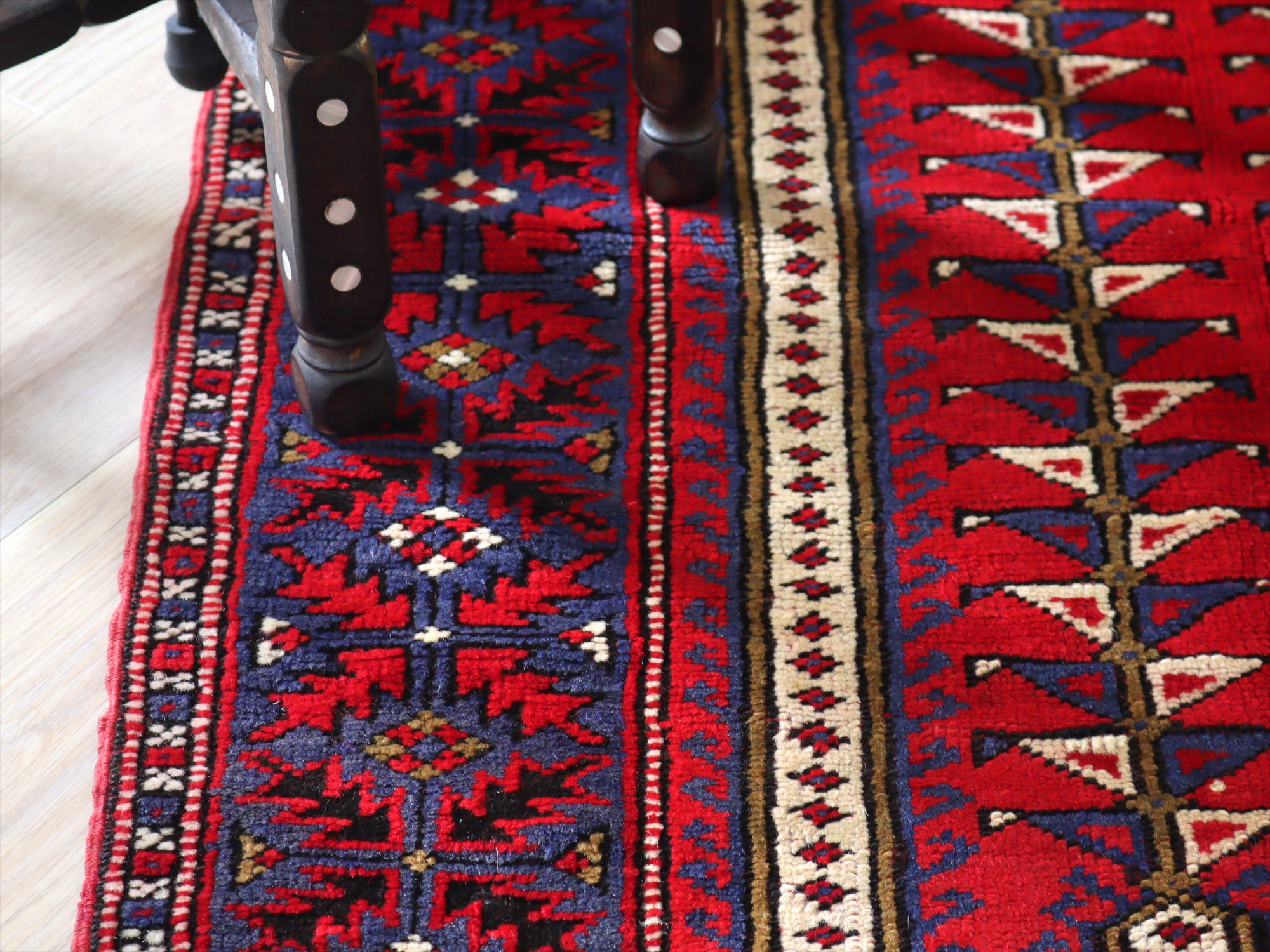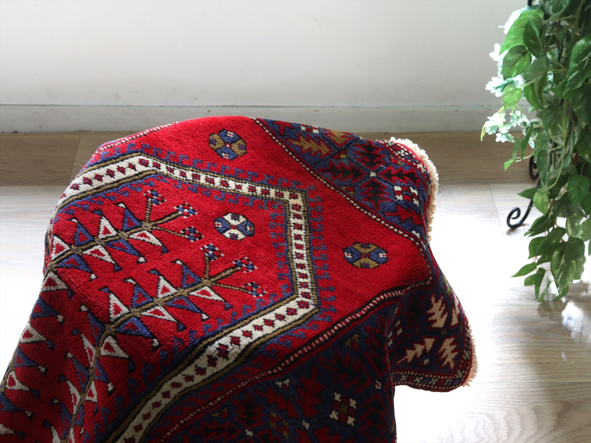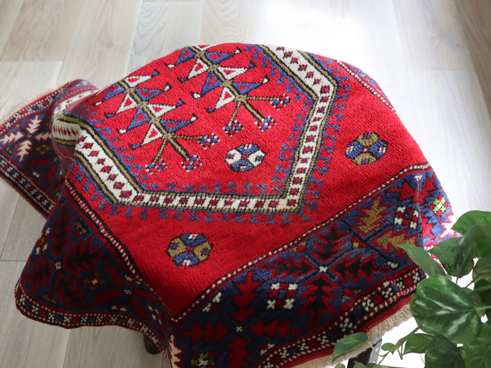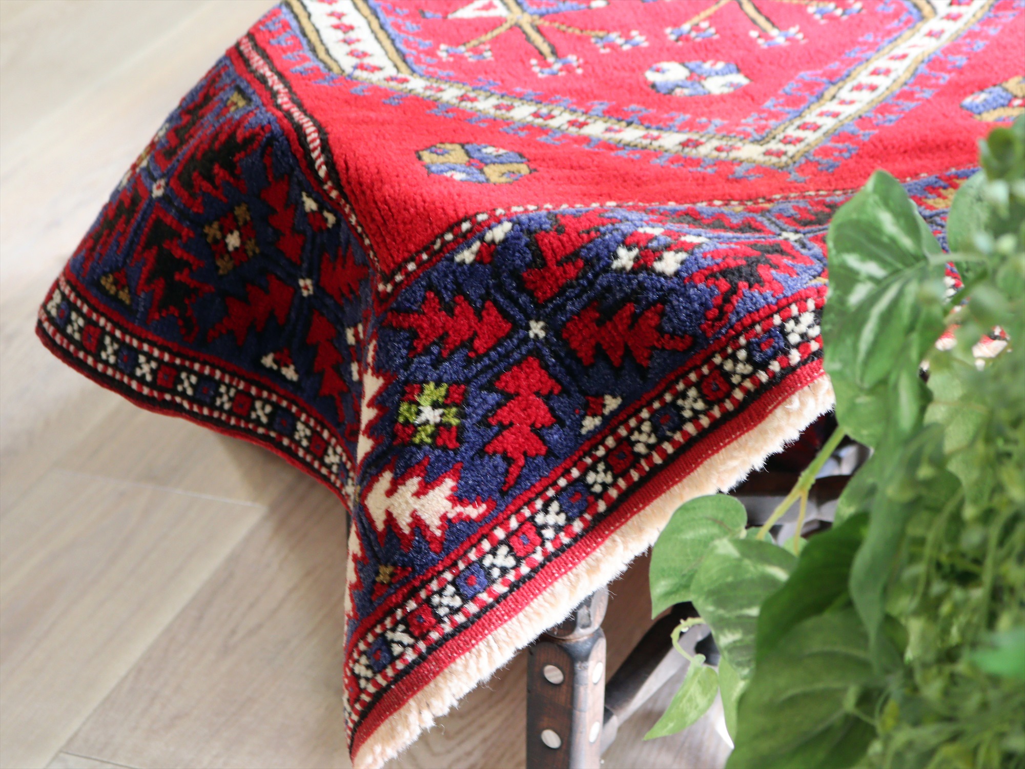 ミフラープと生命の樹 トライバルラグ129×89cm トルコの手織り絨毯 レッド&ネイビー