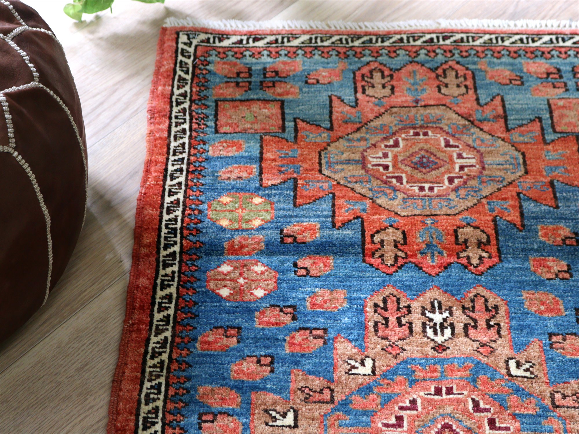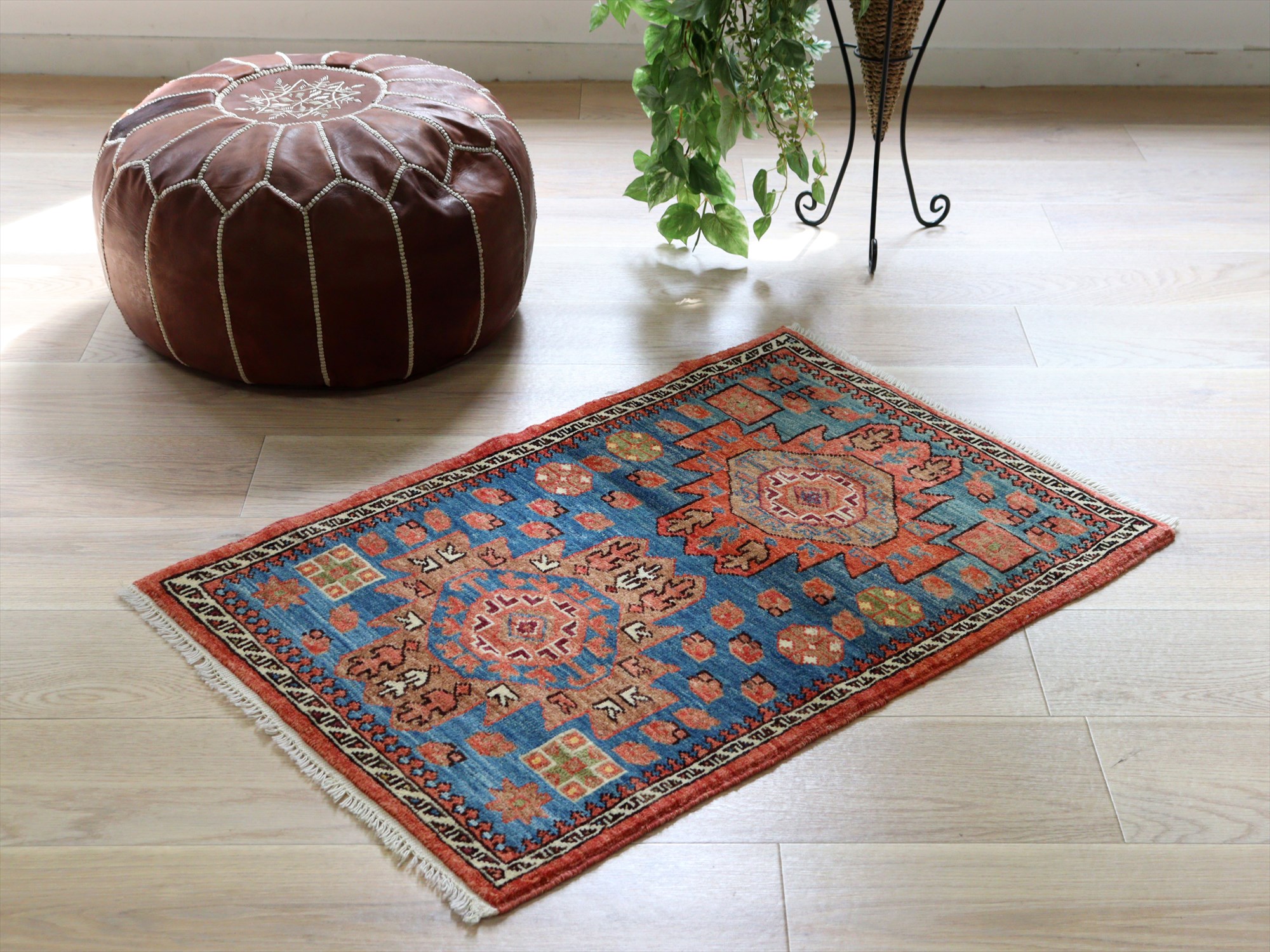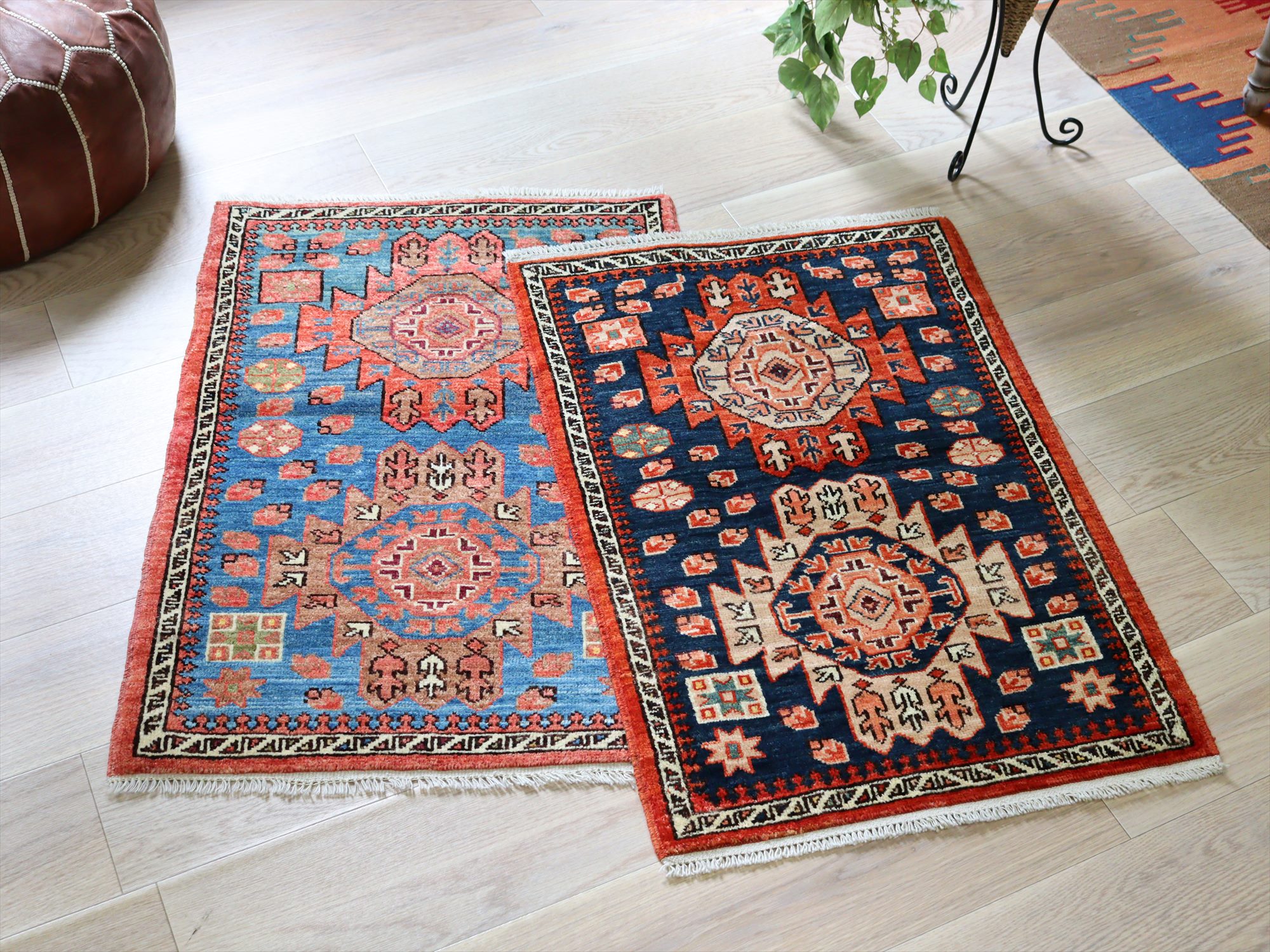 トルコの手織り絨毯 2つのメダリオン96×65cm 手織りラグ ブルー 草木染