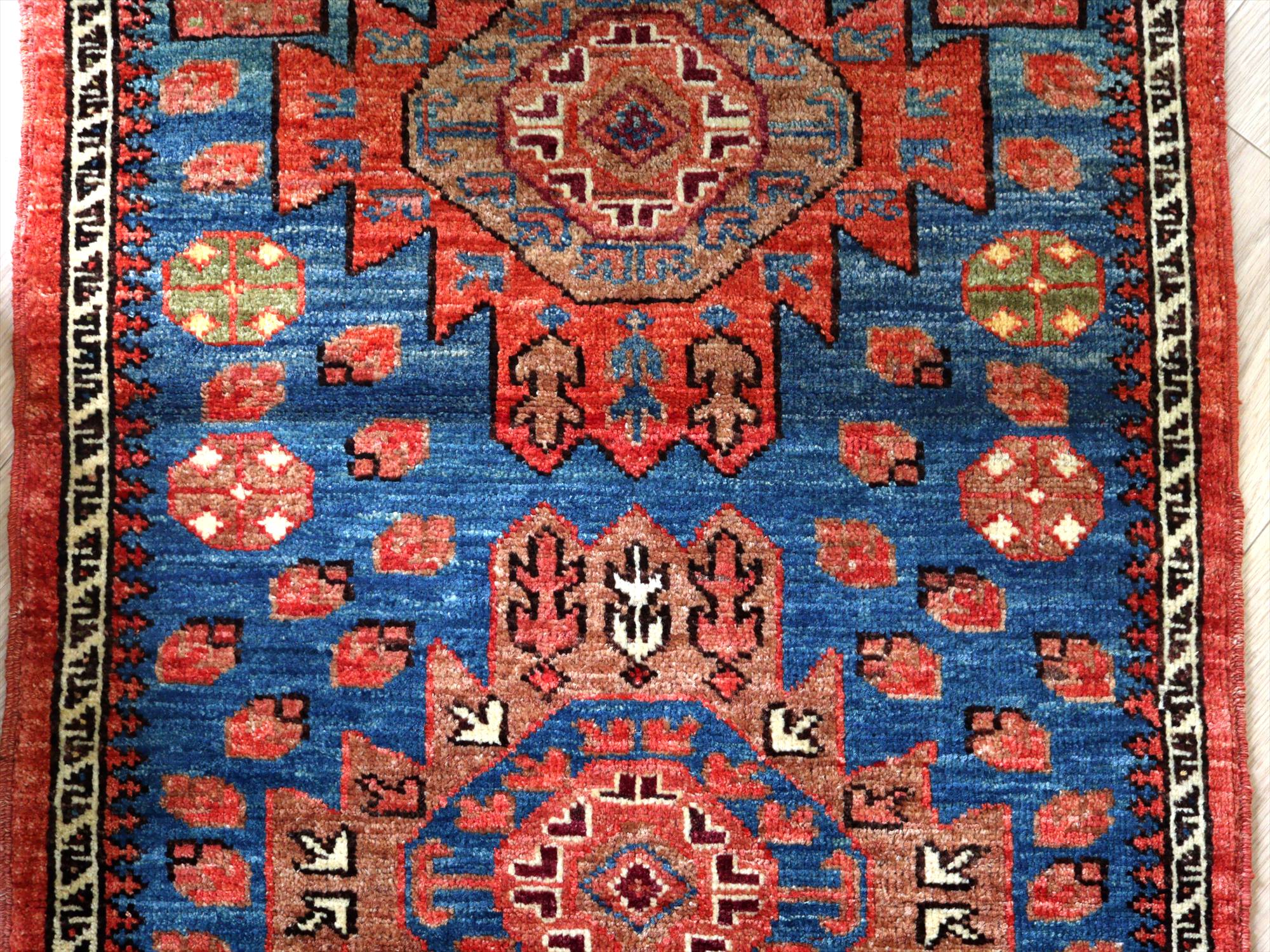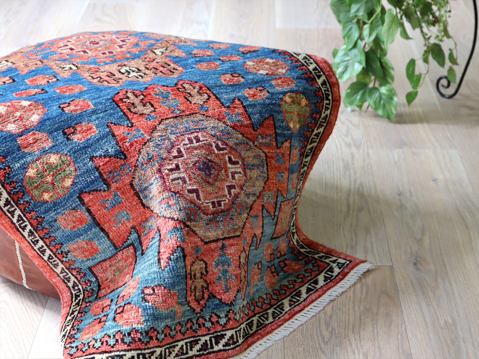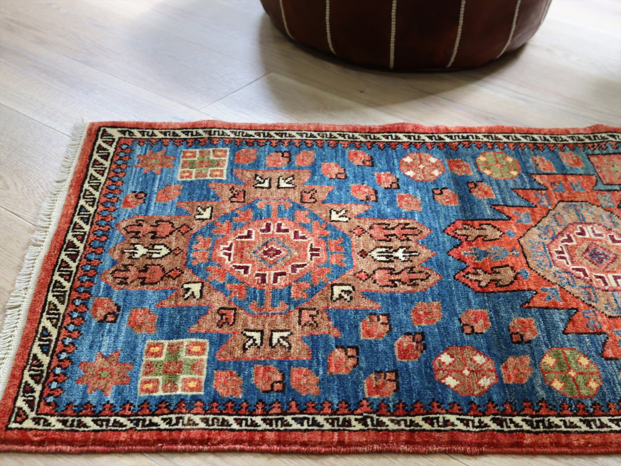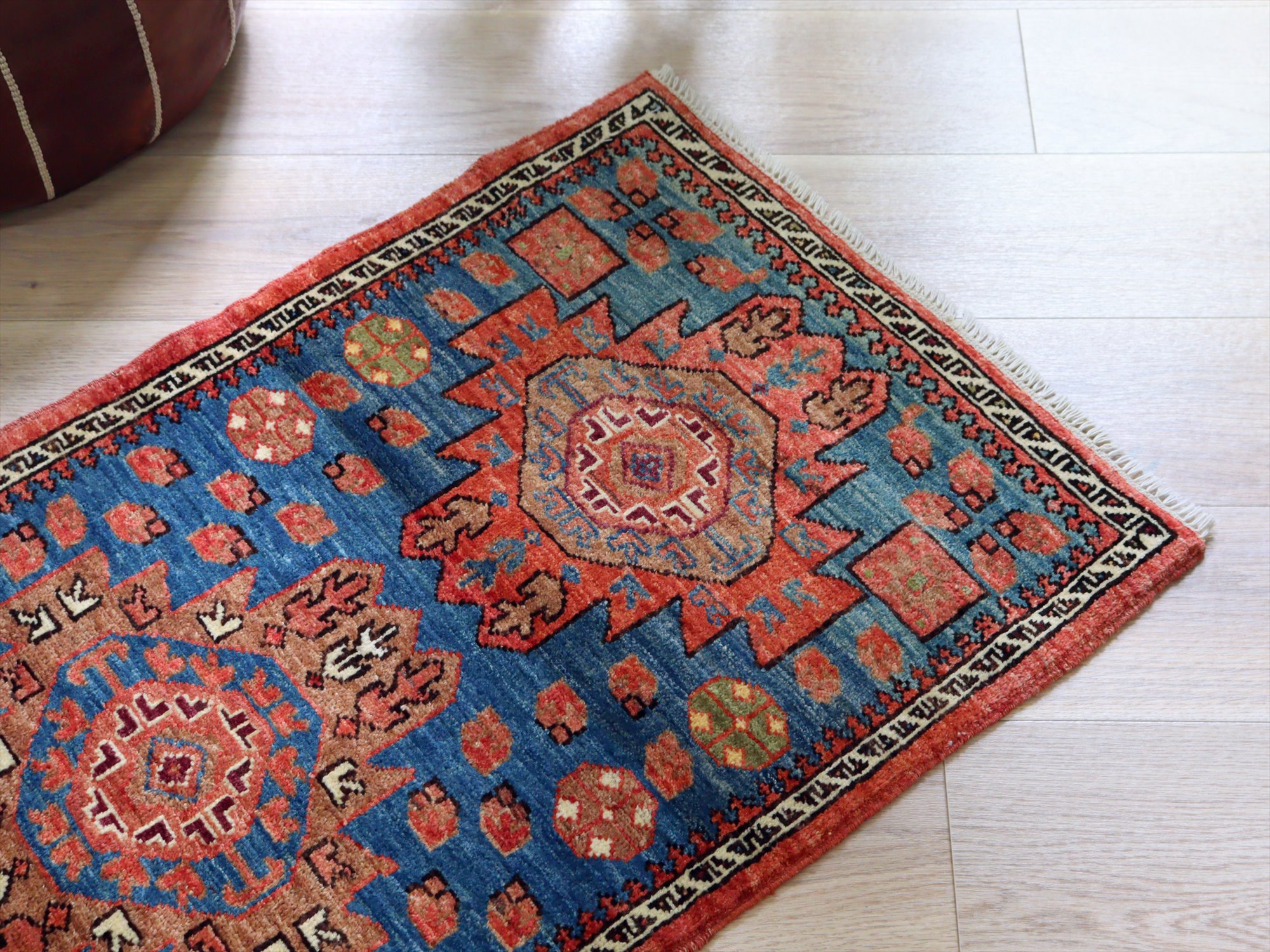 トルコの手織り絨毯 2つのメダリオン96×65cm 手織りラグ ブルー 草木染