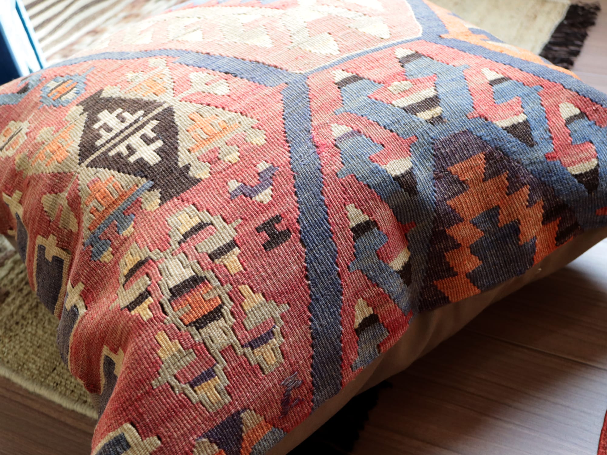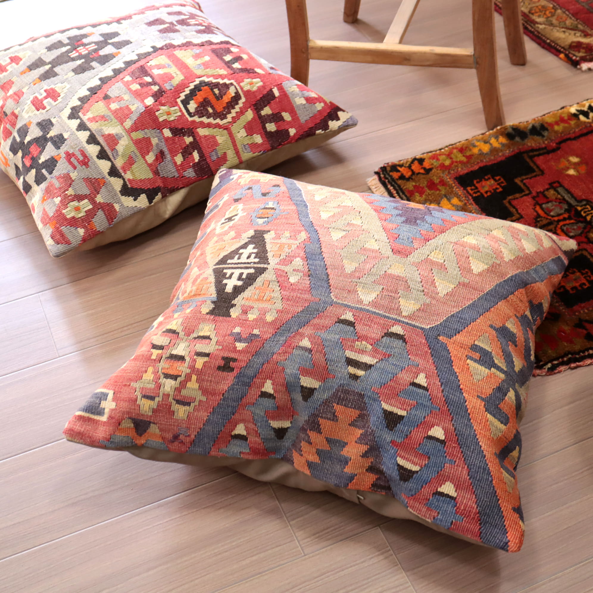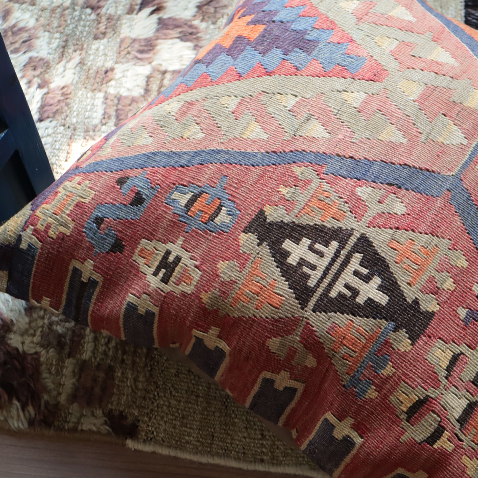 エシュメ地方のオールドキリムを使ったクッションカバーです。のびのびと優雅にドラゴンのモチーフが配置されているのは、60cmサイズならではの贅沢ですね。