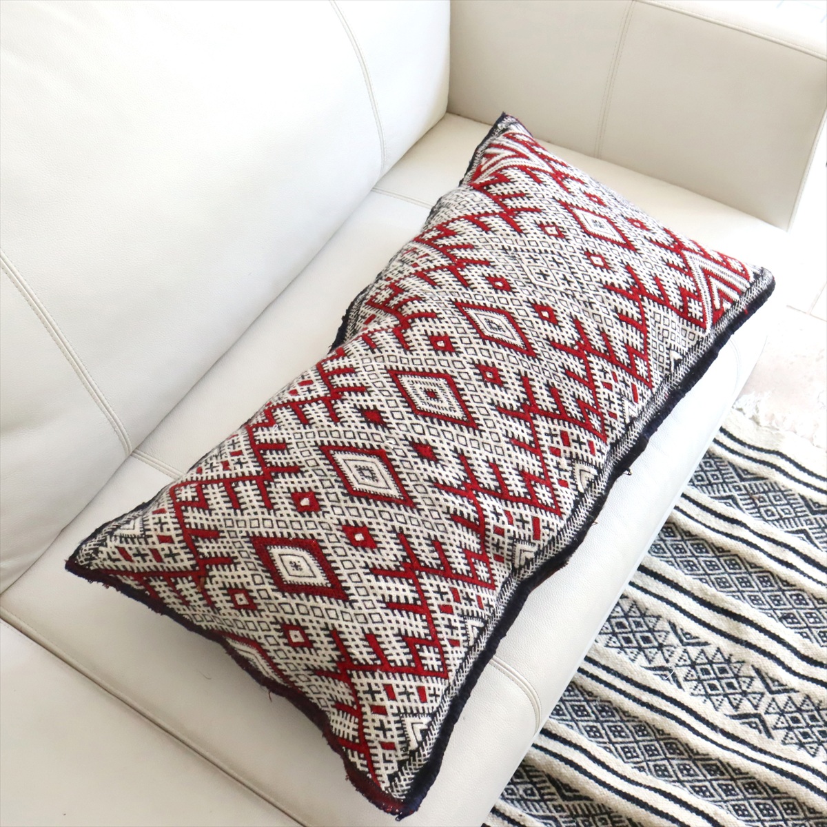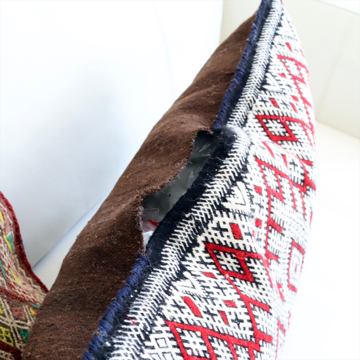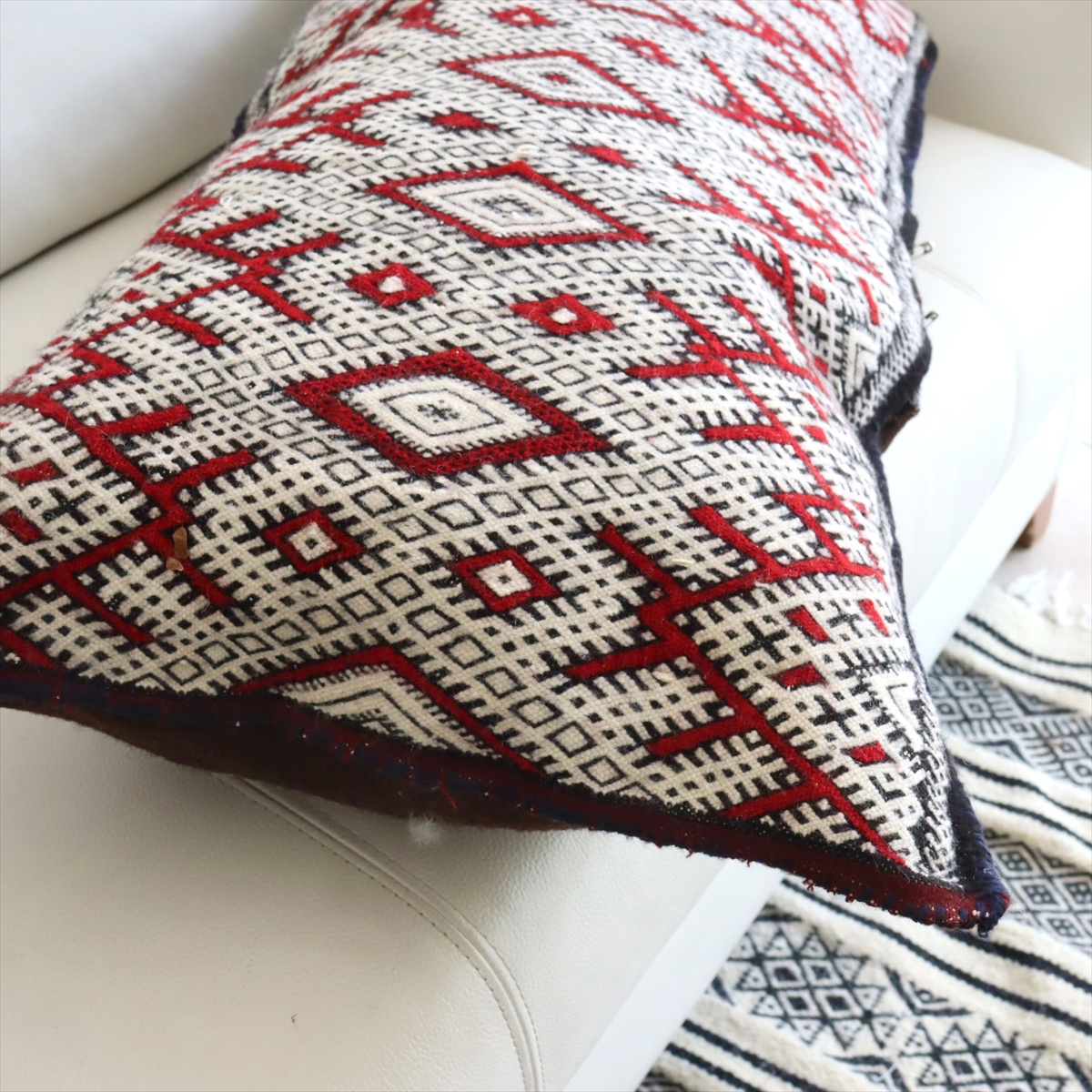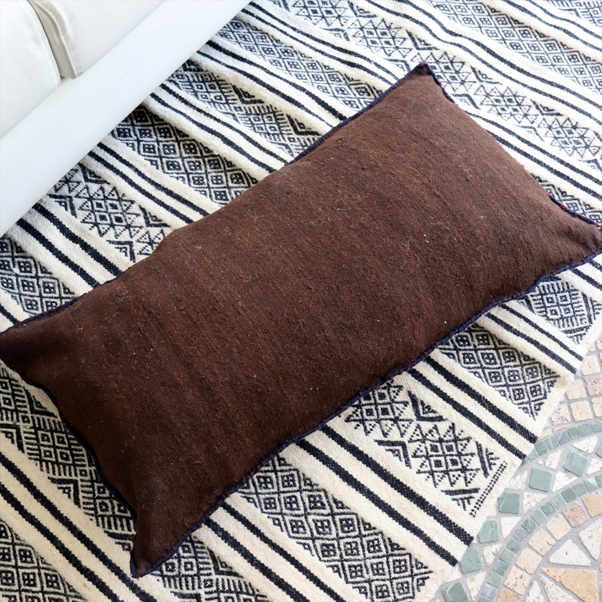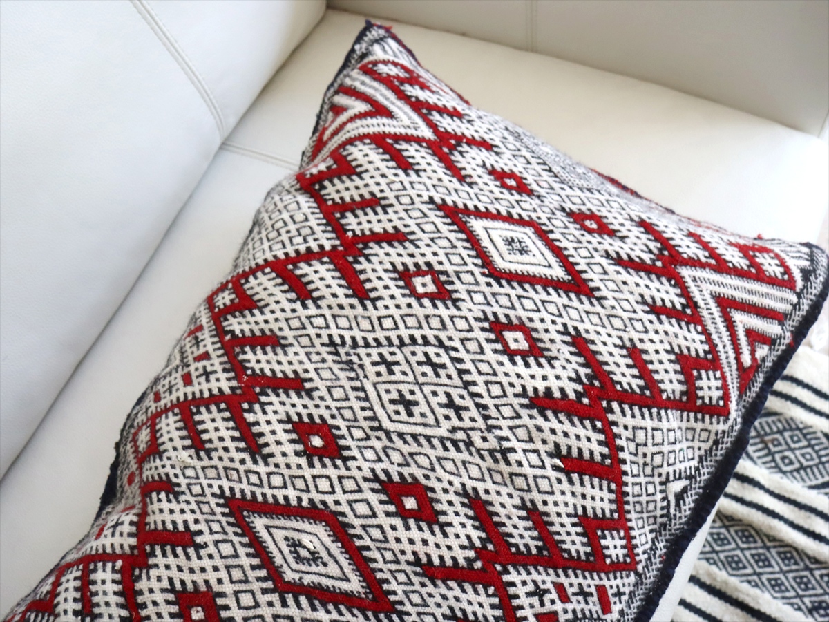 もともとクッションとして使うために織られたもので、表と裏はつながった一枚のキリムです。表面は飾り糸をからめながら織るジジム織りで、立体感のあるテクスチャが特徴です。