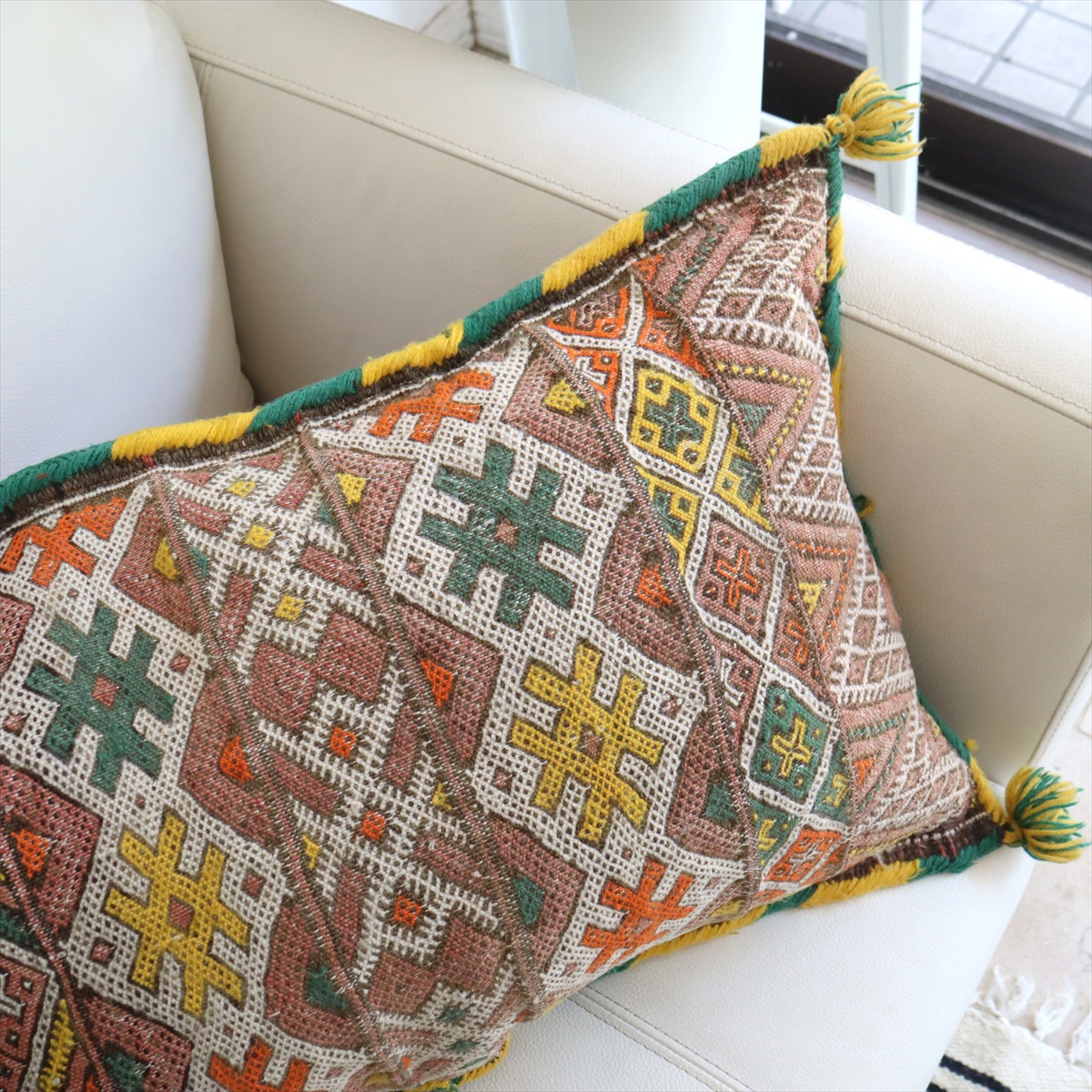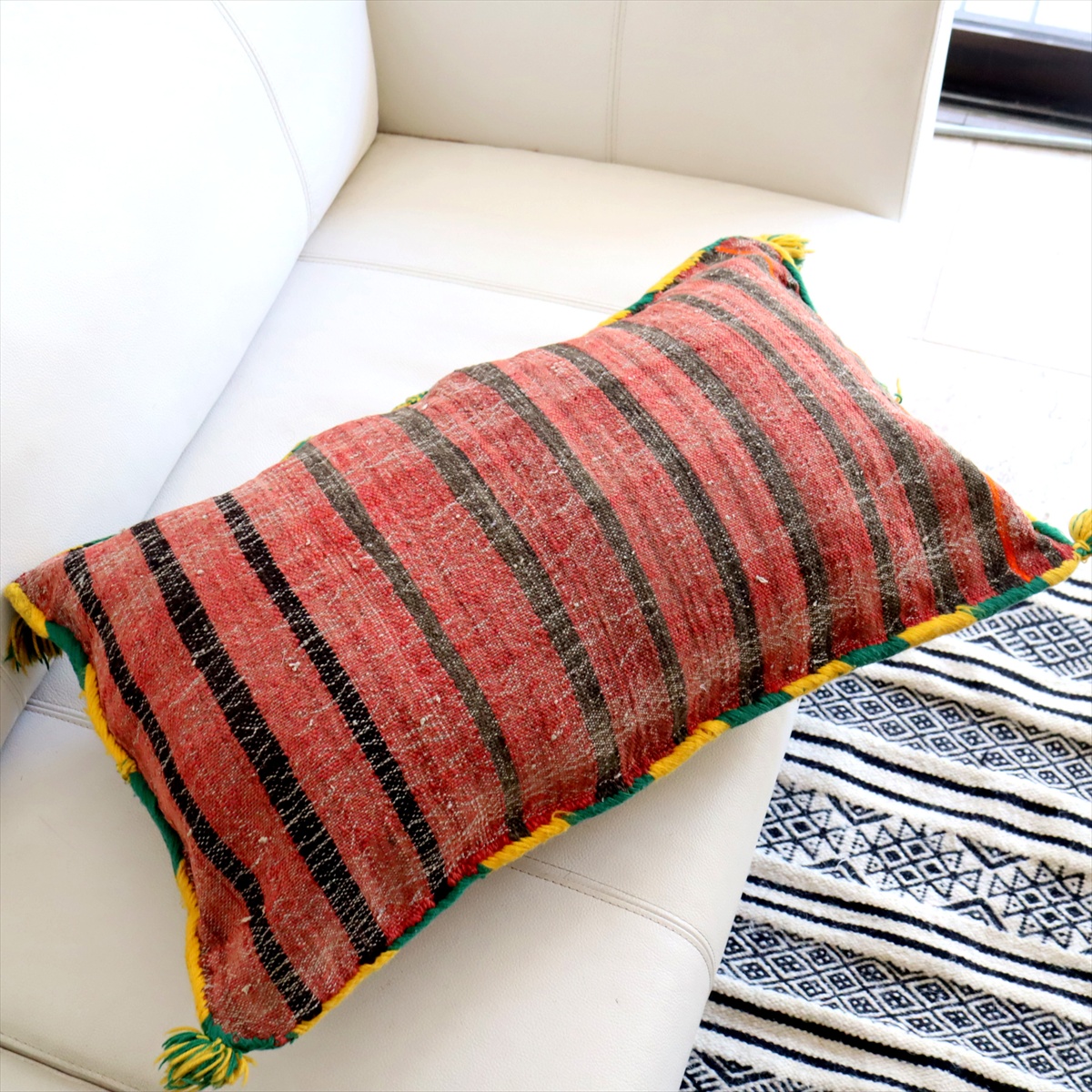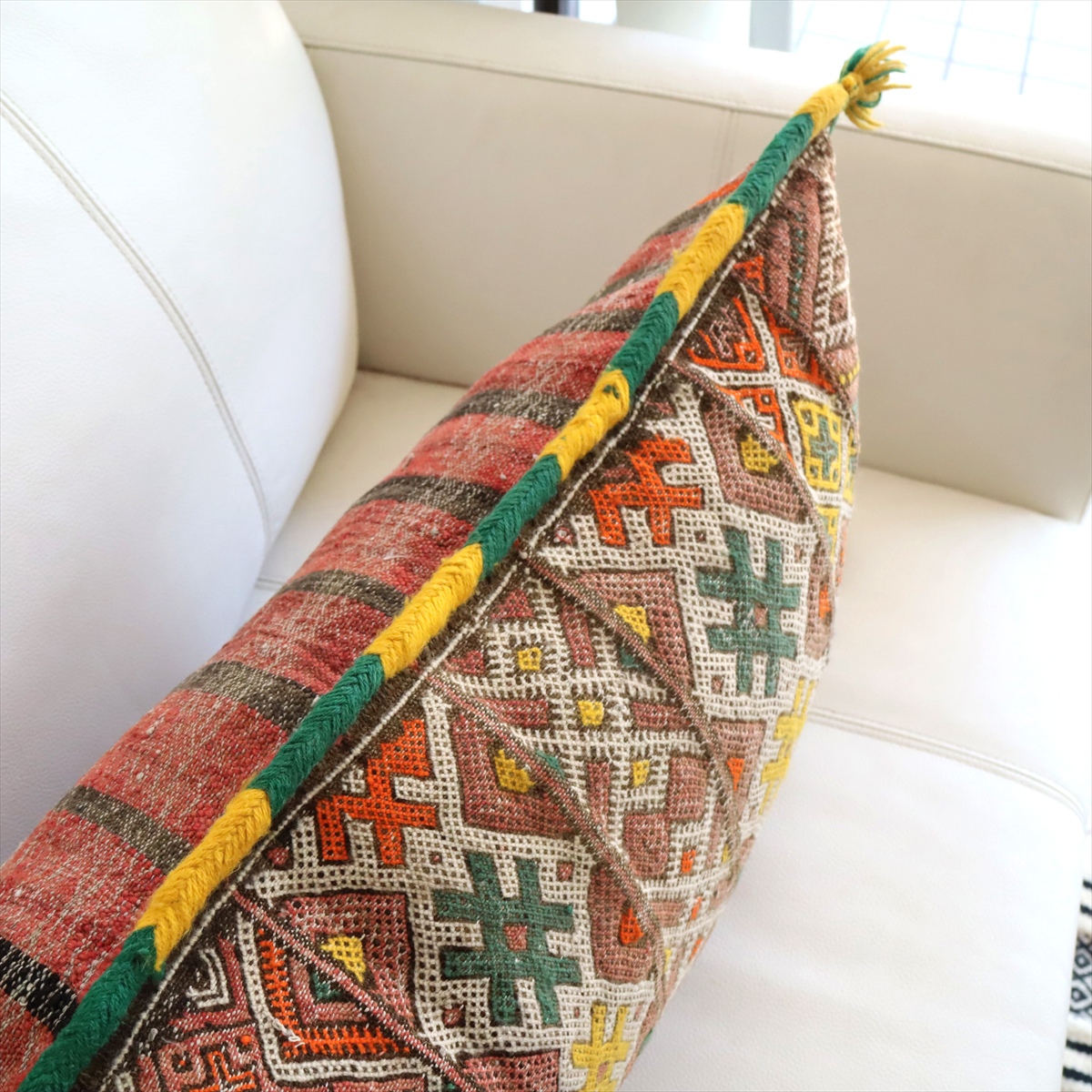 もともとクッションとして使うために織られたもので、表と裏はつながった一枚のキリムです。表面は飾り糸をからめながら織るジジム織りで、立体感のあるテクスチャが特徴です。全体的に赤の色が色あせて、古びた印象です。