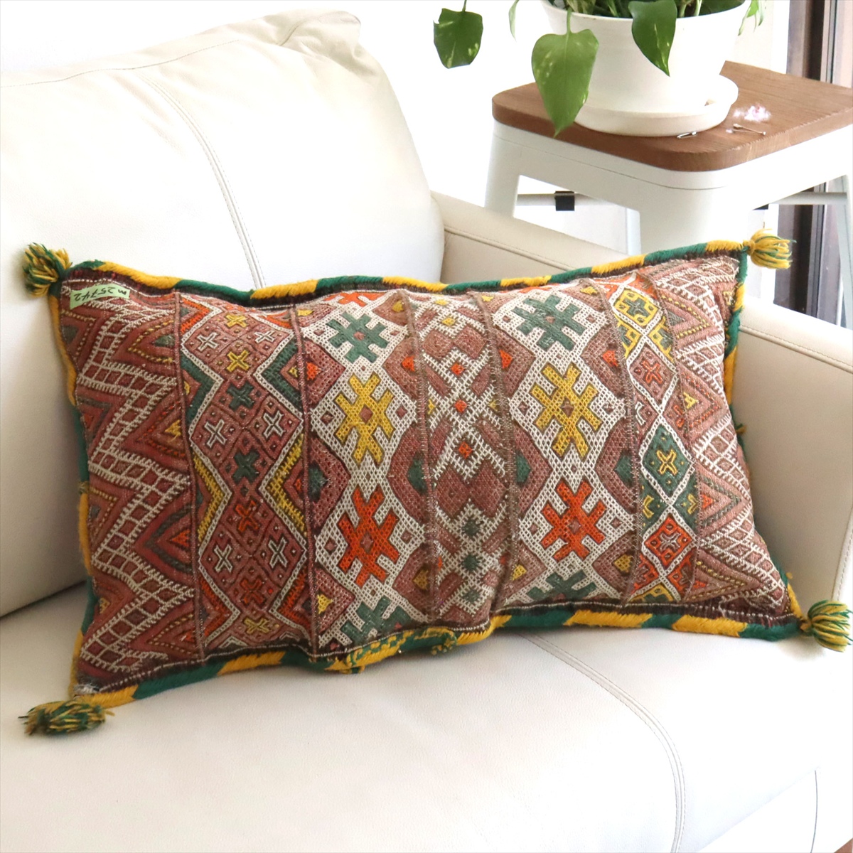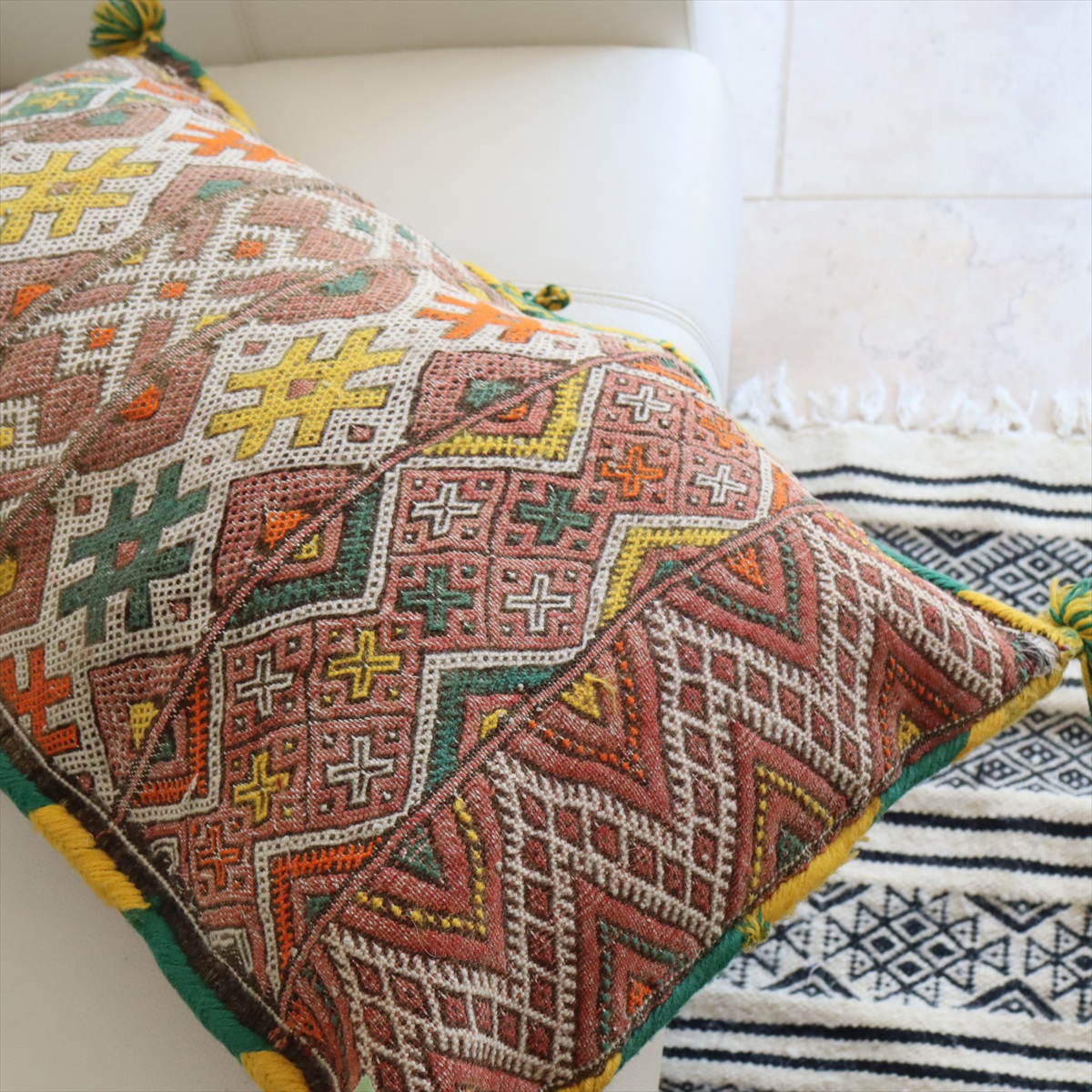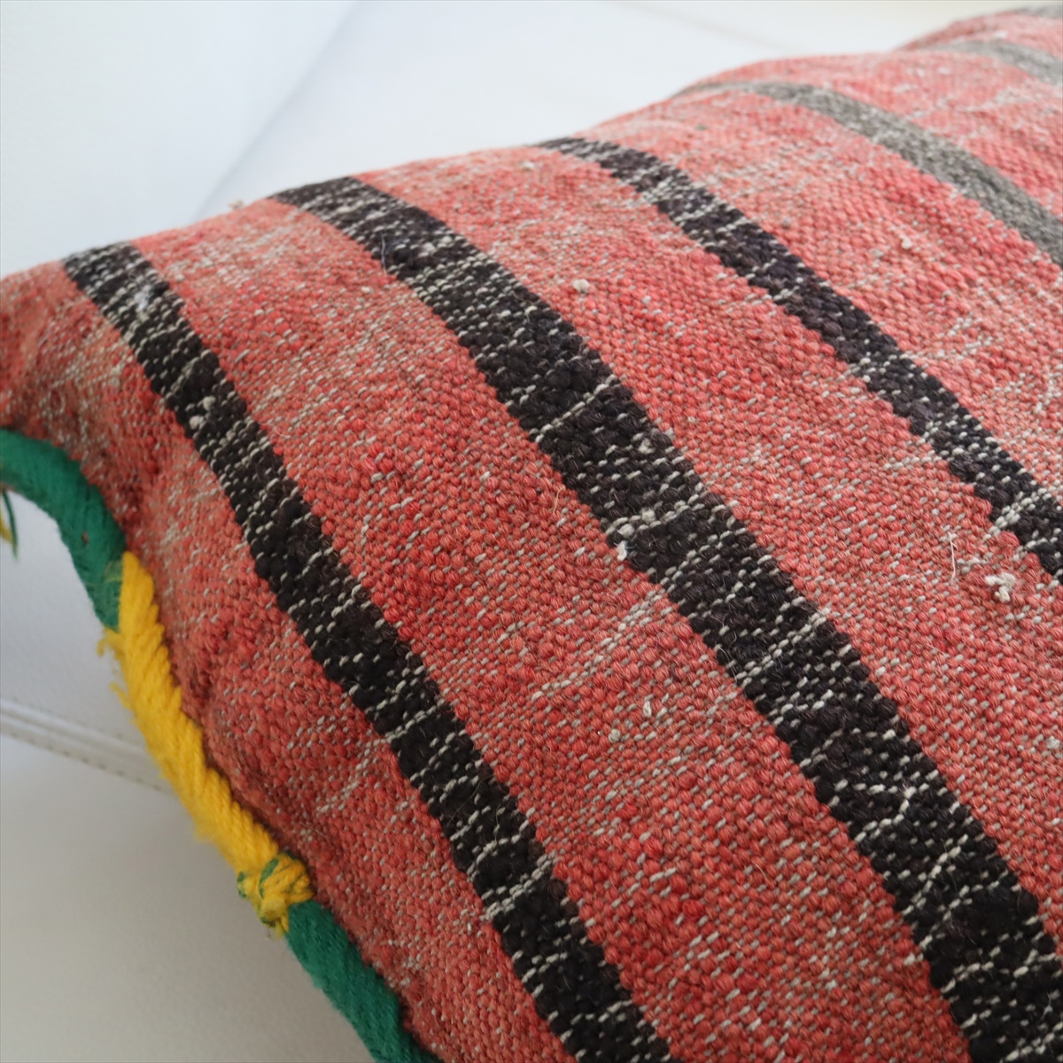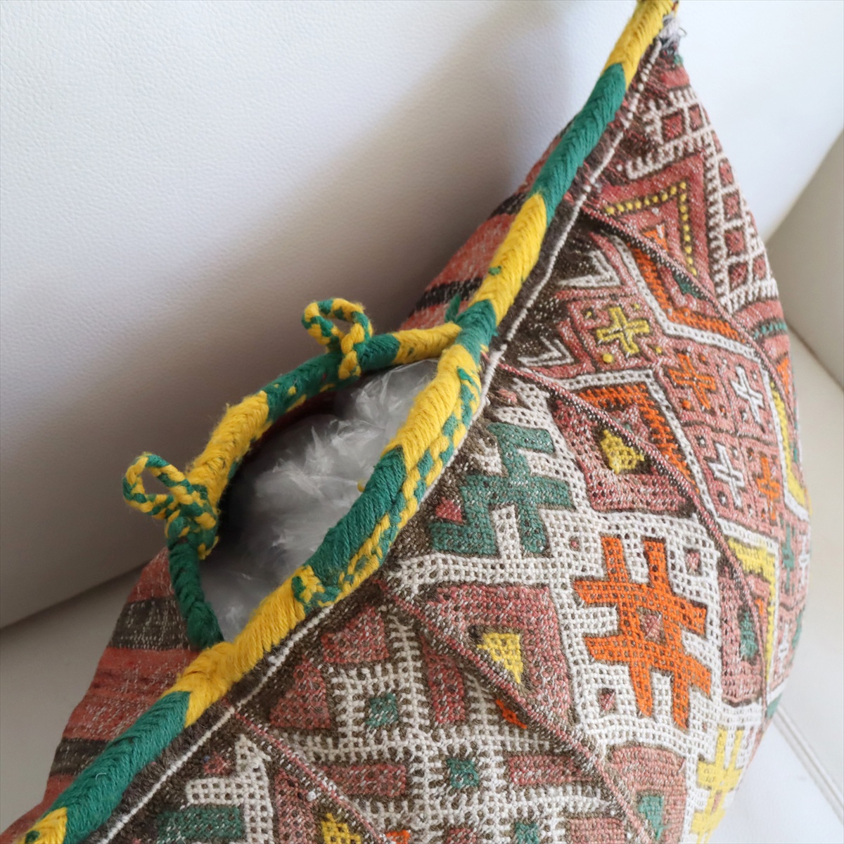 もともとクッションとして使うために織られたもので、表と裏はつながった一枚のキリムです。表面は飾り糸をからめながら織るジジム織りで、立体感のあるテクスチャが特徴です。全体的に赤の色が色あせて、古びた印象です。