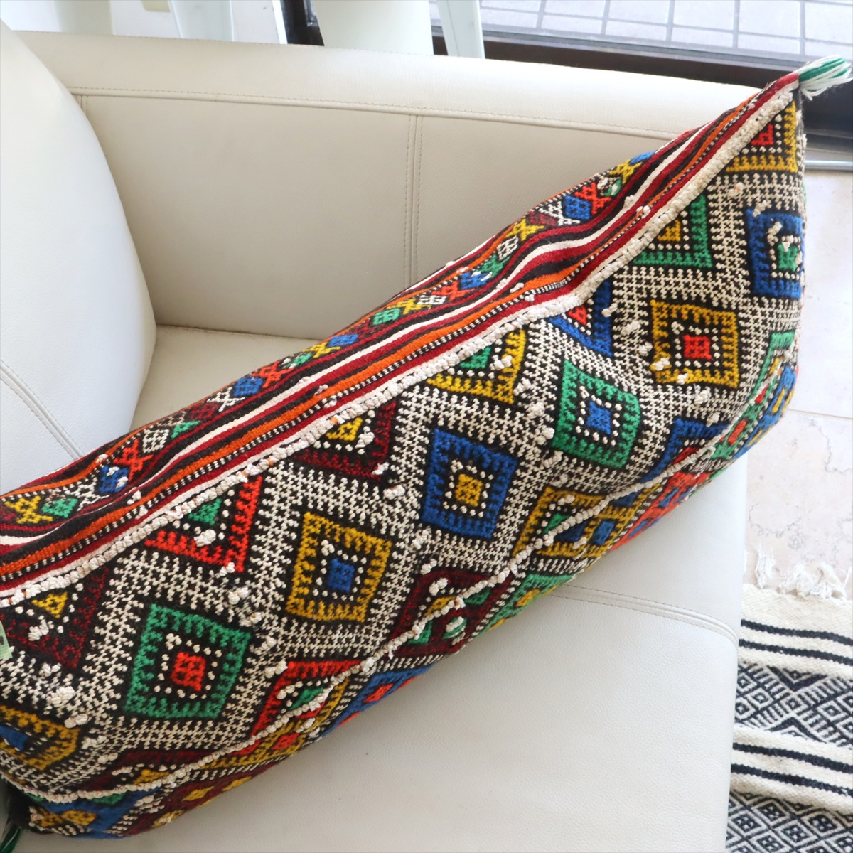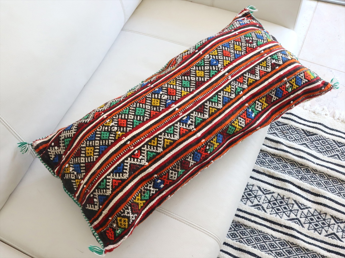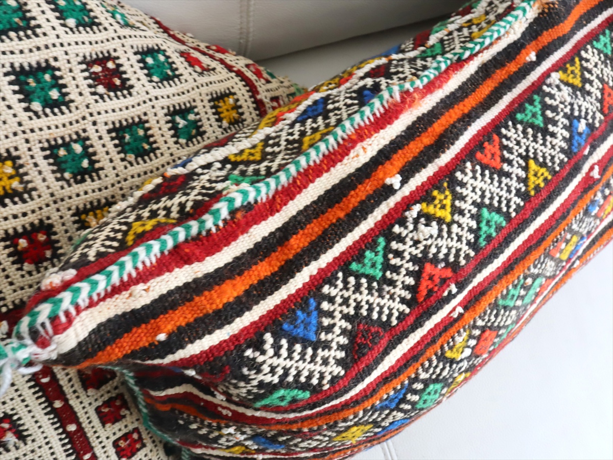 もともとクッションとして使うために織られたもので、表と裏はつながった一枚のキリムです。表面は飾り糸をからめながら織るジジム織りで、立体感のあるテクスチャが特徴です。