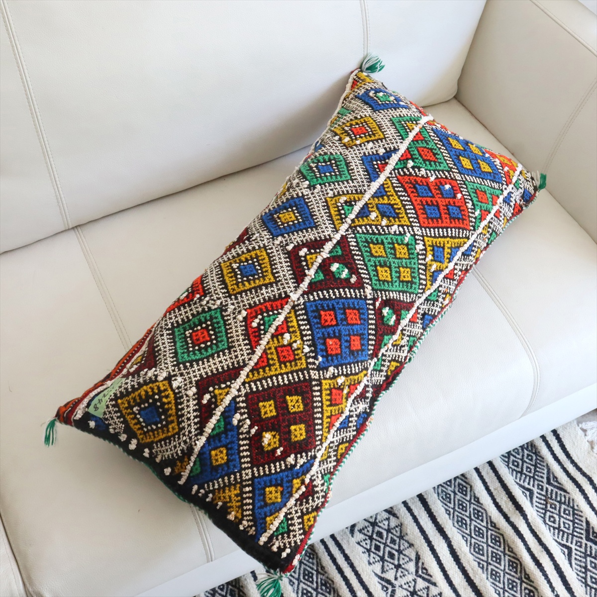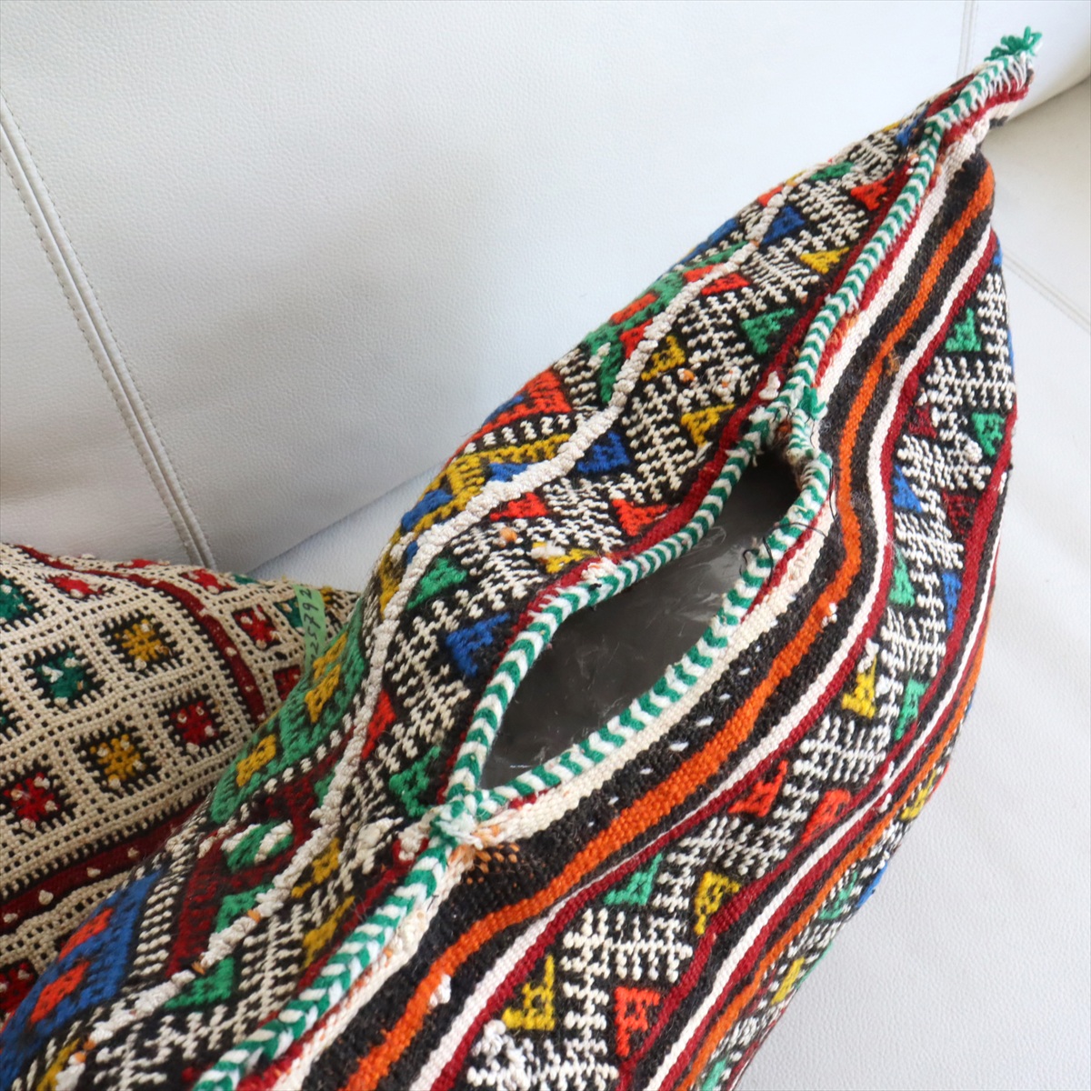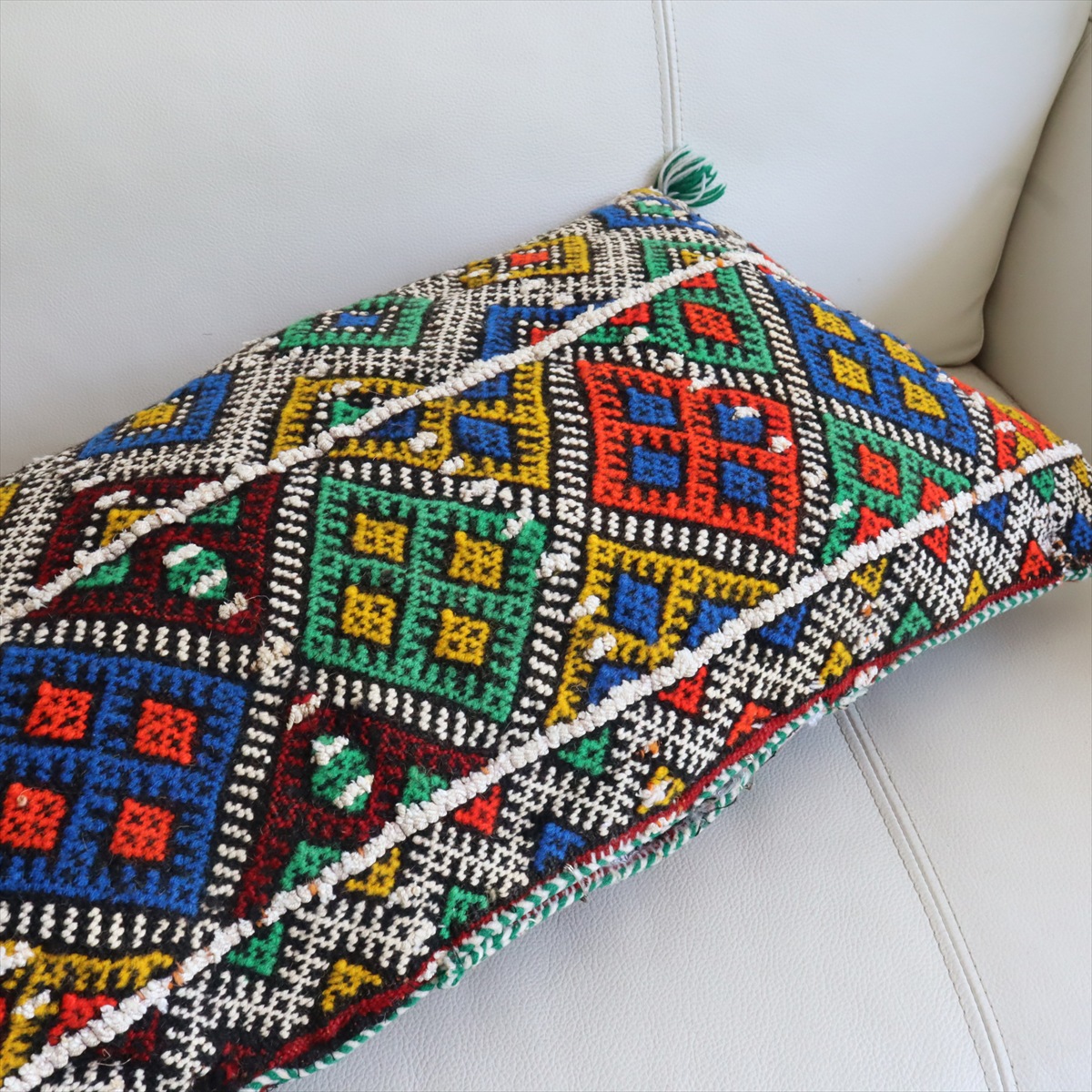 もともとクッションとして使うために織られたもので、表と裏はつながった一枚のキリムです。表面は飾り糸をからめながら織るジジム織りで、立体感のあるテクスチャが特徴です。